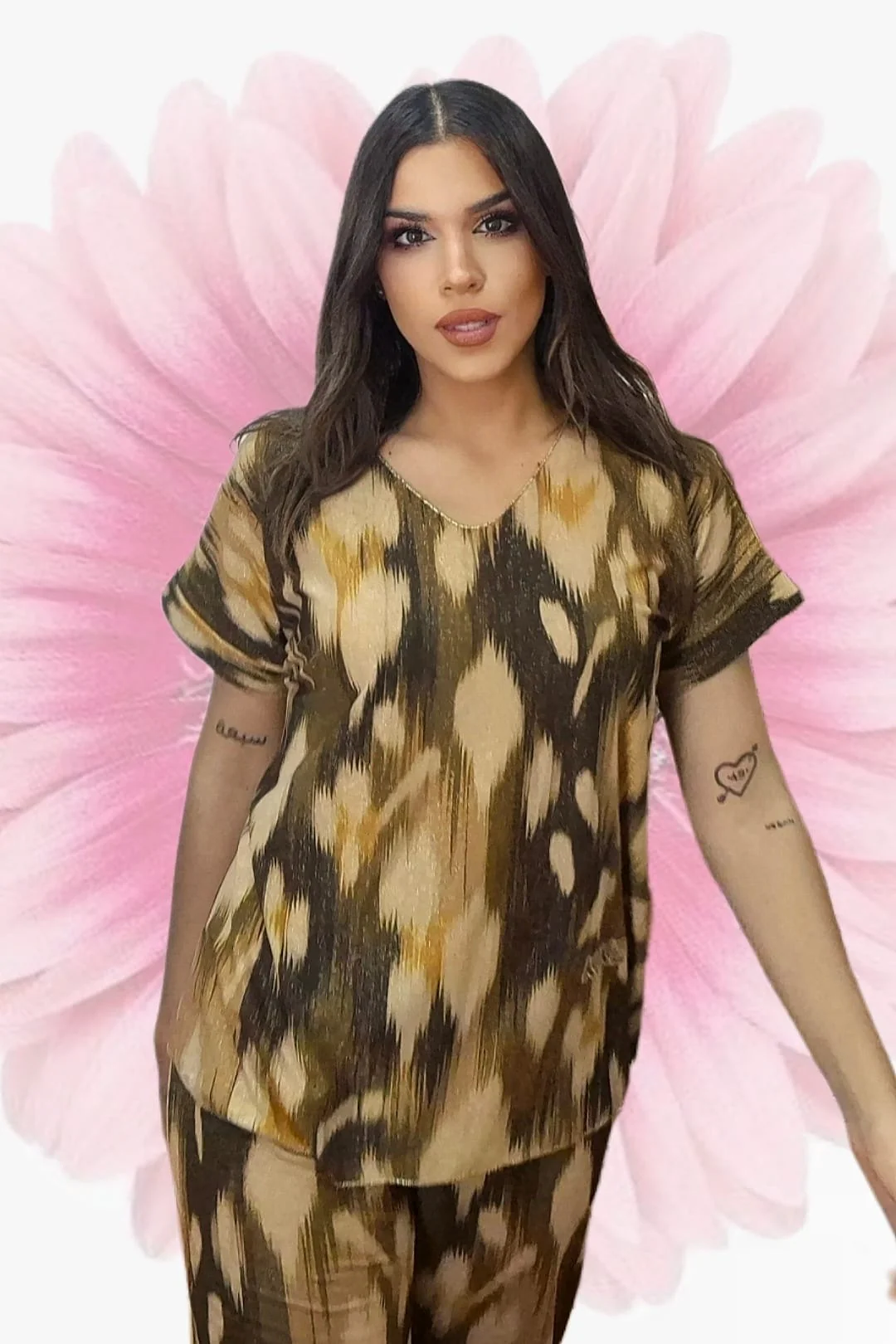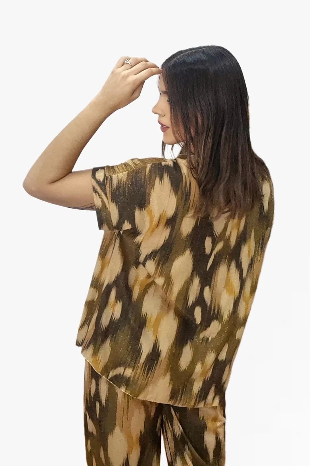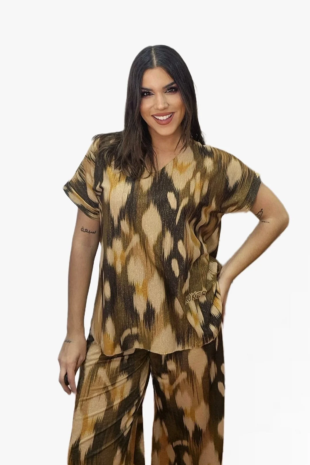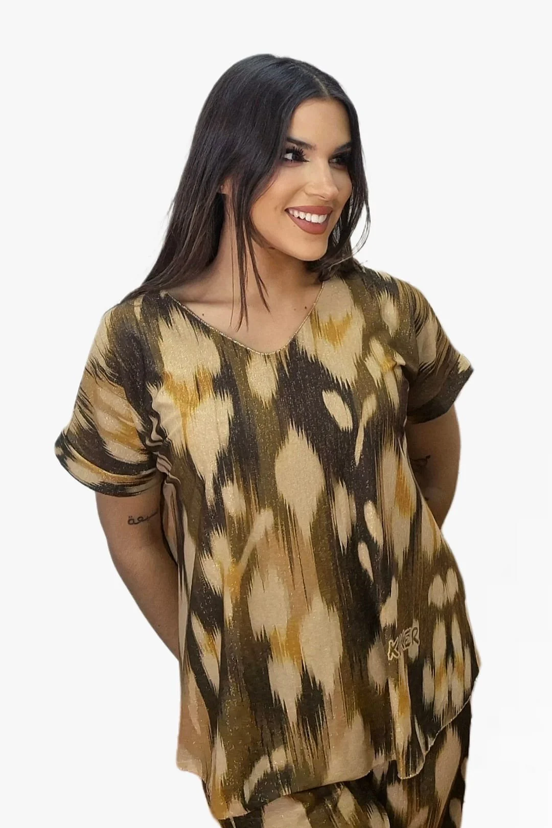 Camiseta Lurex Oliva destaca por su estampado en tonos tierra y dorados que aportan un aire natural con un toque sofisticado. En talla única, su corte fluido y el tejido de 70% poliéster, 25% firemetalic y 5% elástico la convierten en una prenda cómoda y con mucha versatilidad.