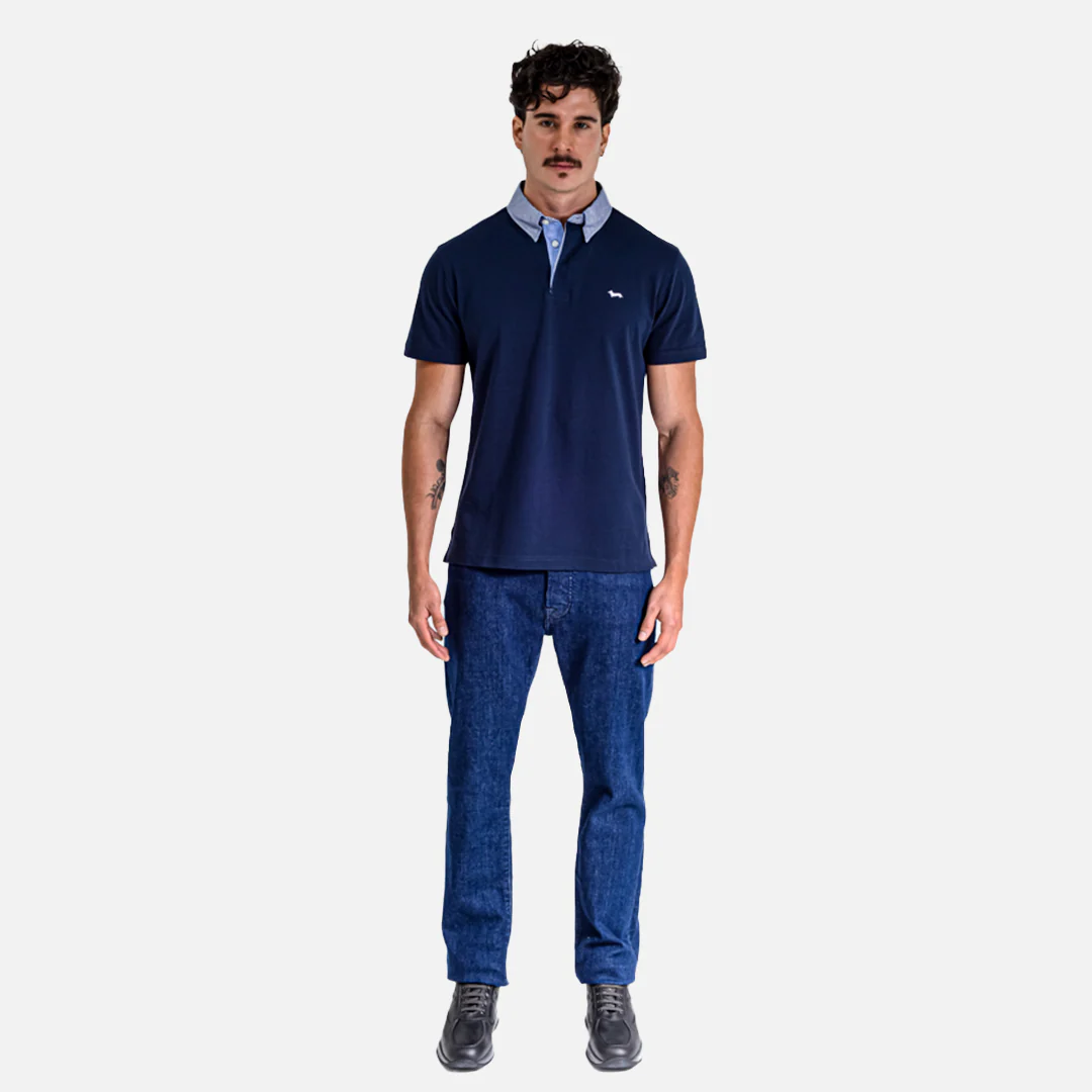 «Camiseta tipo polo para hombre en color azul marino, diseñada para un estilo casual y elegante. Destaca por su cuello en contraste en tono celeste y cierre con botones, que le aporta un toque moderno y distintivo. Confeccionada en tejido de algodón suave y transpirable, es perfecta para combinar con jeans o pantalones chinos para un look versátil y cómodo.»