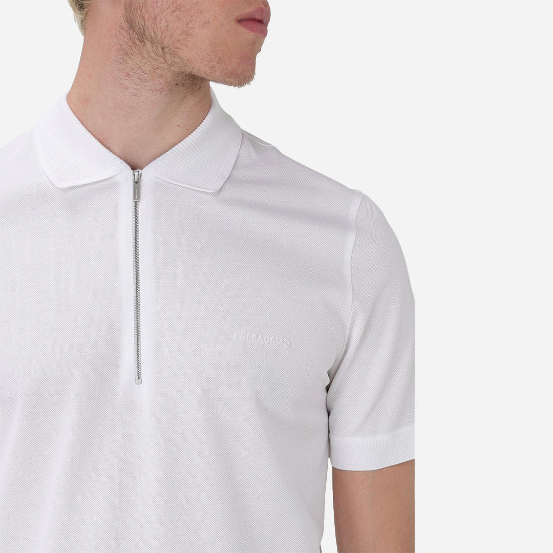 La camiseta polo manga corta en color blanco con cremallera en la abertura añade un detalle dinámico y active a este polo de manga corta. Confeccionado en punto piqué de algodón puro, tiene un regular fit y detalle de canalé a tono en el cuello. Logo del diseñador Italiano Salvatore Ferragamo el cual esta bordado en el brazo izquierdo.