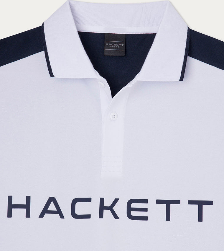 Camiseta polo de manga corta de la marca Hackett, con un diseño de bloques de color. El cuerpo principal es de color blanco, mientras que las mangas y una franja en los hombros son de un azul marino oscuro que contrasta perfectamente. El cuello es estilo polo con botones, y en la parte delantera, justo debajo del cuello, lleva el nombre de la marca, «HACKETT», serigrafiado en un tono oscuro. La combinación de colores y el estilo minimalista lo hacen ideal para un look casual, pero con un toque deportivo y sofisticado.