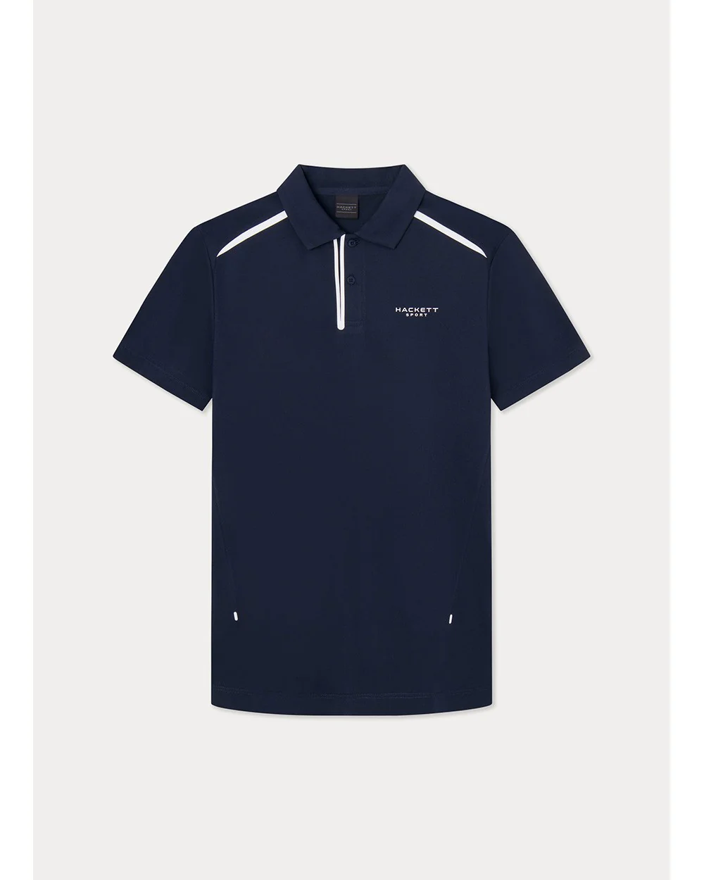 polo de manga corta de Azul Marino blanco, confeccionado con un tejido técnico de alto rendimiento. Destaca por su diseño moderno y funcional, que incluye detalles en contraste de color blanco en el cuello, los hombros y la cremallera delantera. En el pecho, lleva un sutil logotipo serigrafiado que añade un toque deportivo y elegante. La cremallera en el cuello permite ajustar la ventilación, y los pequeños detalles como los orificios de ventilación laterales y la terminación de las mangas la hacen ideal para actividades deportivas o para un look casual y contemporáneo.