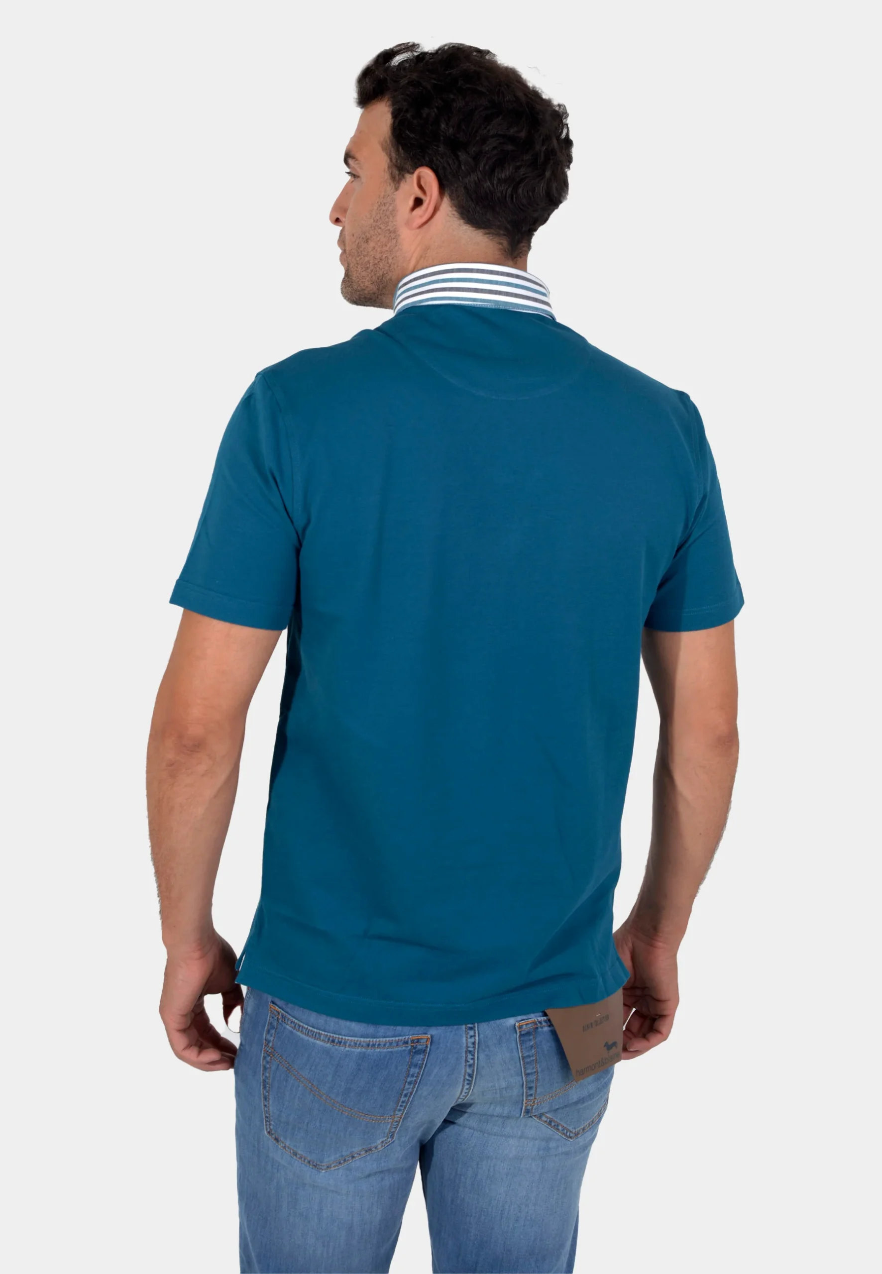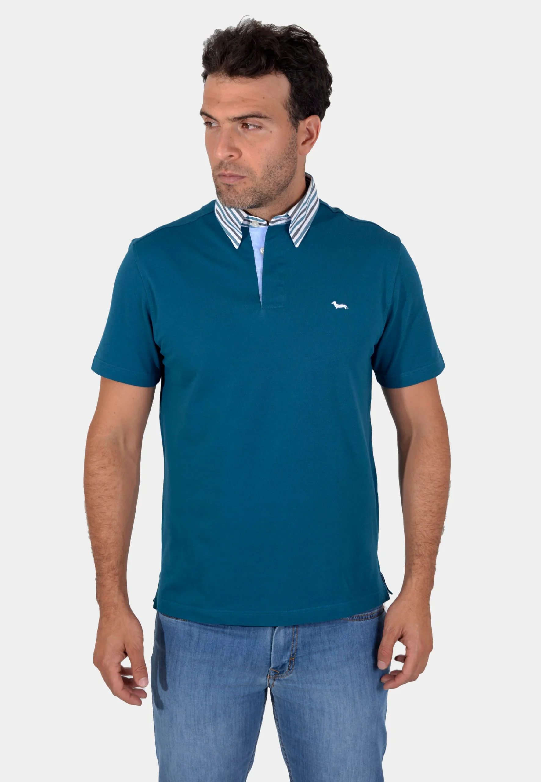 Camiseta polo Harmont & Blaine en tono azul petróleo. Confeccionado en algodón premium de tacto suave, garantiza transpirabilidad y comodidad en cualquier ocasión. El cuello en contraste, con detalles en rayas azul claro y blanco, le da un toque moderno y dinámico, mientras que el característico logo bordado en el pecho reafirma la autenticidad y prestigio de la marca. Versátil y sofisticado, es ideal para combinar con jeans, bermudas o pantalones chinos para un look náutico contemporáneo.