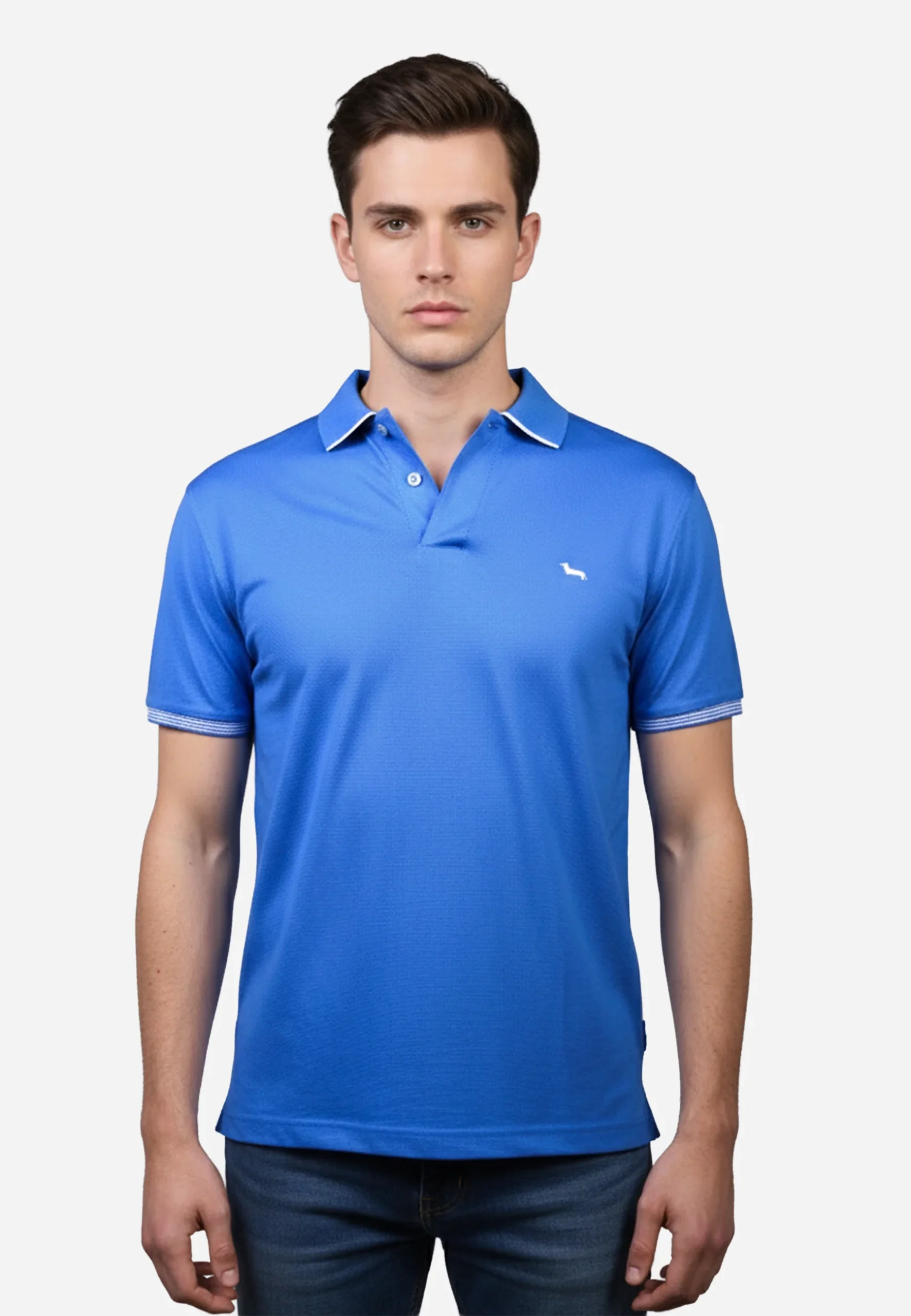 Camisa polo azul con el logo de perro blanco que aparece en la imagen es de la marca de ropa italiana Harmont & Blaine. El logo de la marca es un perro salchicha (dachshund), que es visible en el pecho izquierdo de la prenda,Azul rey o azul cielo con ribetes (líneas) blancos en el cuello y las mangas,Es un modelo de ajuste regular o custom fit, parte de colecciones como la línea «Vietri» de la marca.