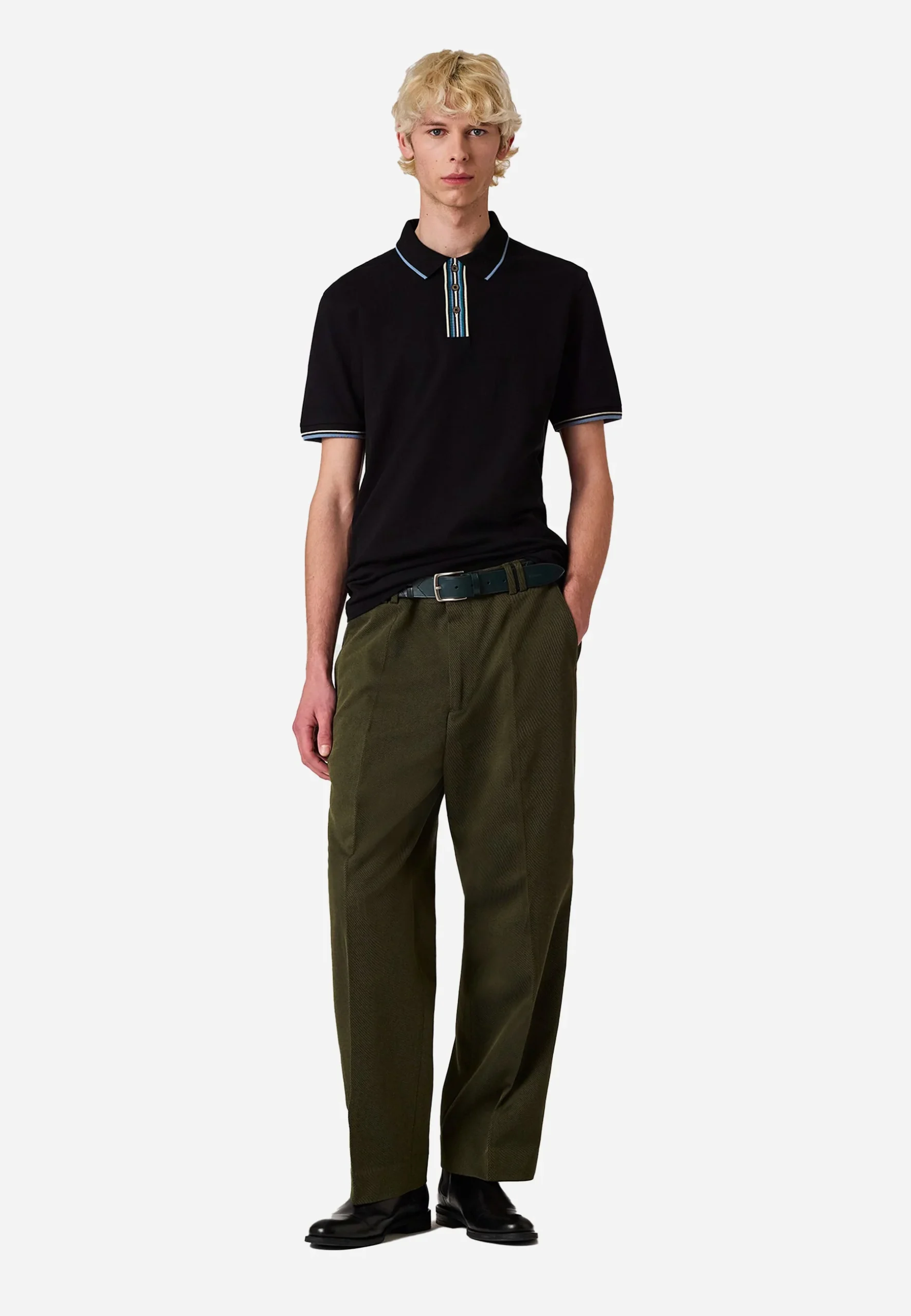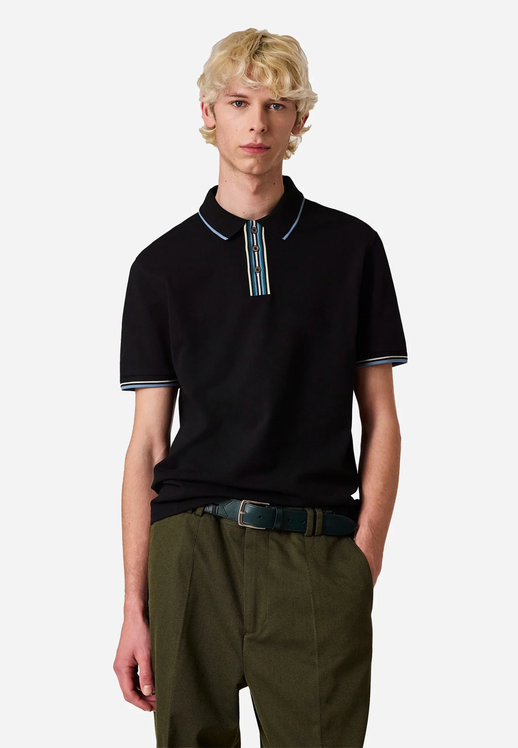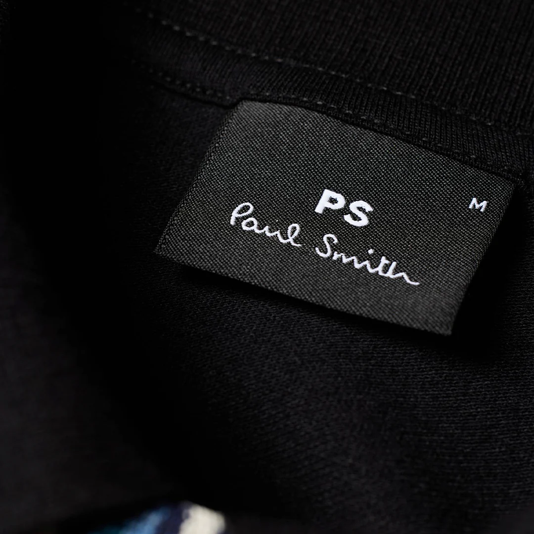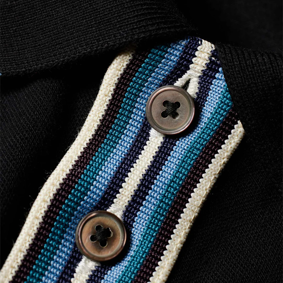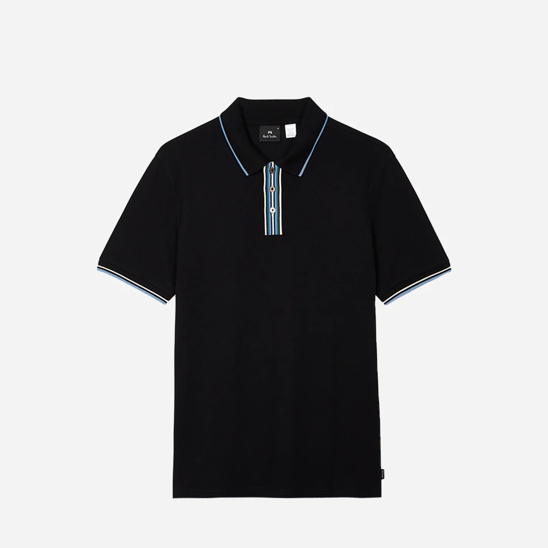 Características Principales Marca: PS Paul Smith, una línea de difusión de la marca de lujo británica Paul Smith. Material: Confeccionada en piqué de algodón (o algodón modal, dependiendo de la versión específica). Diseño: La característica más destacada es el ribete a rayas multicolor, a menudo llamado «Artist Stripe» o «Signature Stripe», que se encuentra en el interior de la tapeta de botones, el cuello y, a veces, en los puños o las aberturas laterales. Estilo: Es un diseño clásico de ajuste regular, combinando un color negro atemporal con un toque de color distintivo de la marca. Detalles: Cuenta con una tapeta de dos botones y, en algunas versiones, los botones también tienen un detalle de color sutil o son de concha gris.