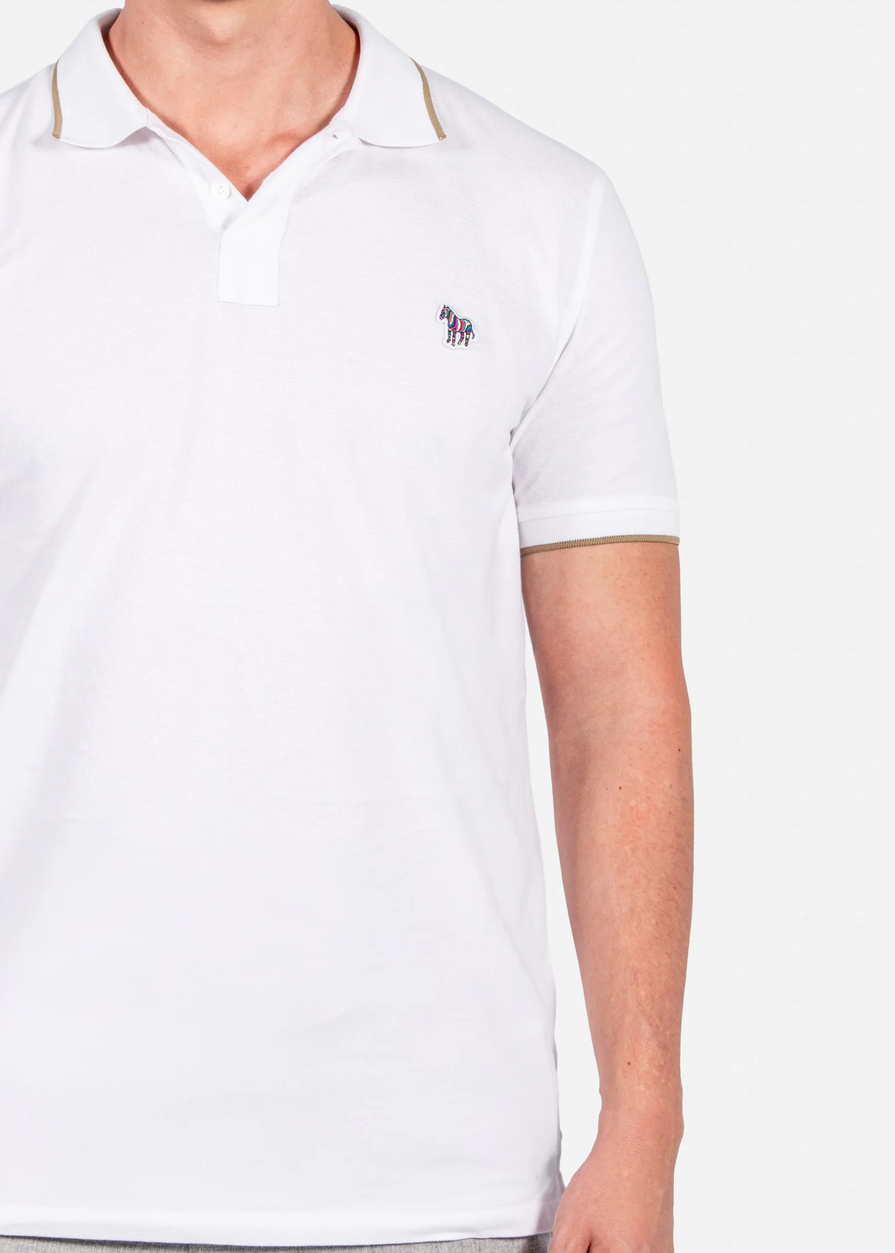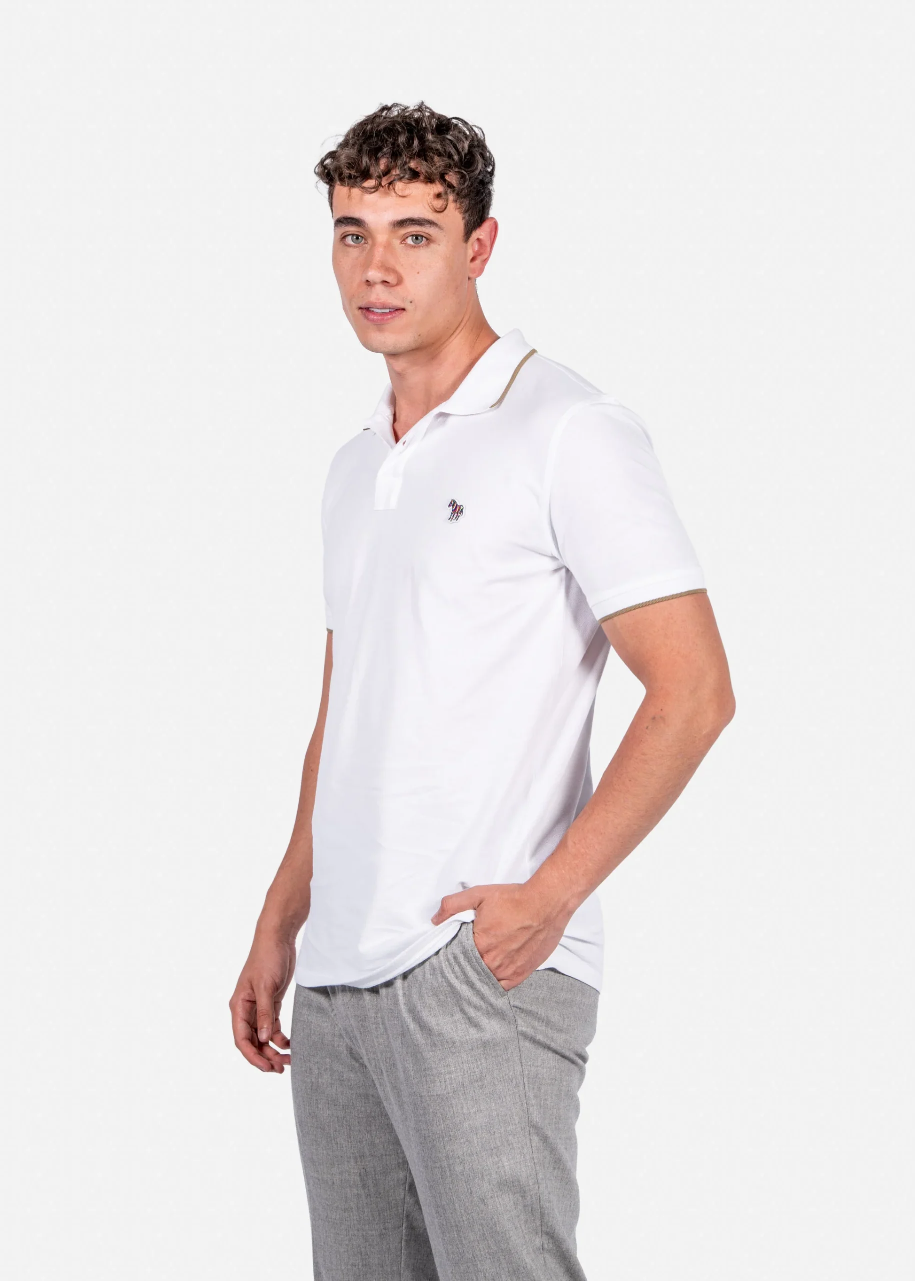 Esta camiseta polo Paul Smith en color blanco off white está confeccionada en 100% algodón orgánico, garantizando comodidad y respeto por el medio ambiente. Su ajuste regular fit ofrece un calce estándar que se adapta a diferentes tipos de cuerpo. Destaca por su cuello tipo polo con cierre de dos botones, mangas cortas con ribetes a rayas y el bordado del icónico logo de la cebra en el pecho. El dobladillo recto con aberturas laterales aporta movilidad y estilo. Es fácil de cuidar con lavado a máquina siguiendo las indicaciones de la etiqueta.