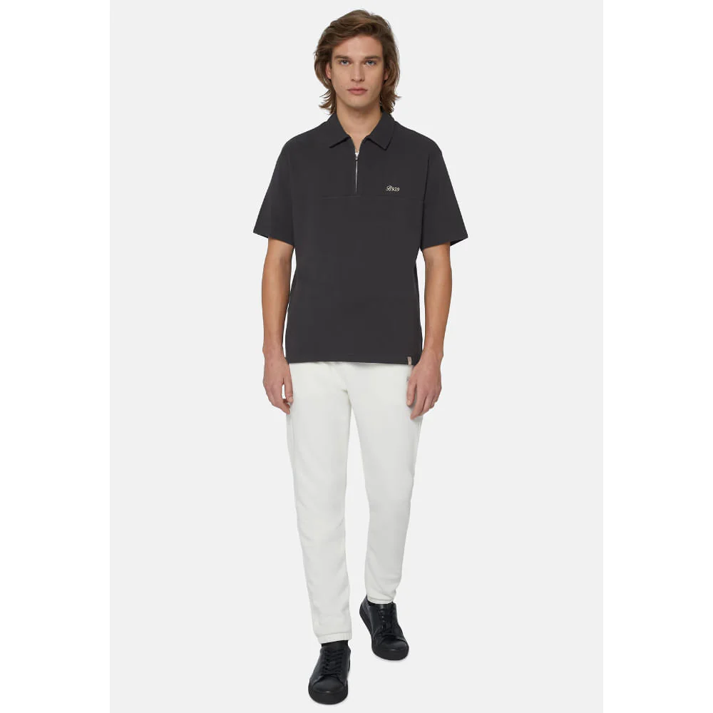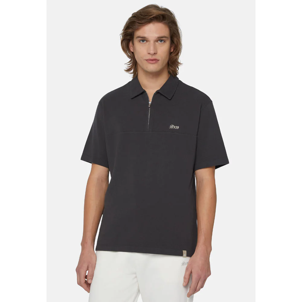 Camiseta Polo Negra Confeccionado en un suave tejido jersey (o la tela que corresponda) y un distintivo cuello bowling (o cubano), su caída es fluida y cómoda. El color oscuro (gris marengo/antracita) aporta una sofisticación versátil, perfecta para combinar con pantalones de vestir claros para un contraste llamativo o con jeans oscuros para un monocromático de impacto. La etiqueta discreta con el logo en el pecho añade el toque final de lujo.(24P003405)