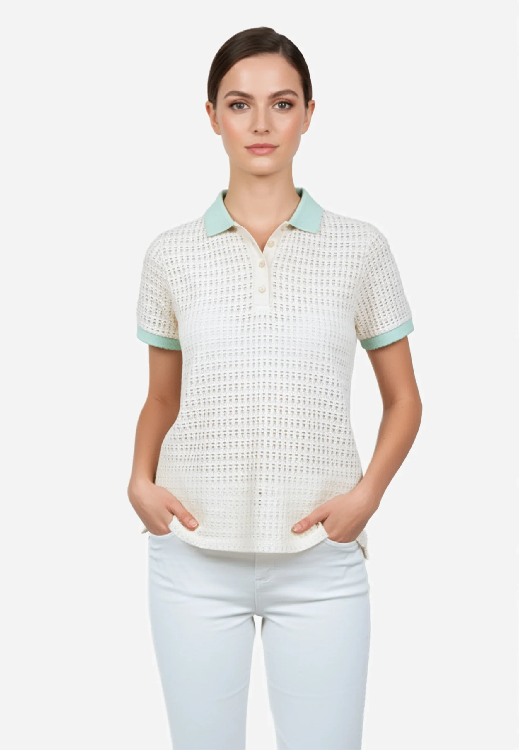 camisa tipo polo de manga corta para mujer, en color blanco o marfil claro, y presenta un diseño de punto calado o con textura. Se caracteriza por un cuello clásico y un cierre de botones parcial en la parte delantera, lo que le da un aspecto casual pero elegante, ideal para climas cálidos o un estilo de negocios informal.