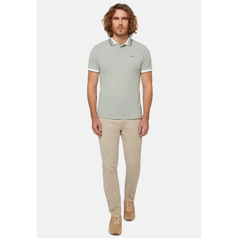 Camiseta Polo Boggi de Piqué con Ribetes – Verde Salvia Elegante Inyecta un color moderno a tu guardarropa con este polo de Boggi Milano en un sofisticado tono verde salvia o menta grisáceo. Confeccionado en piqué de algodón de primera calidad, este diseño se distingue por los ribetes blancos contrastantes en el cuello y las mangas, que añaden un toque retro y sport chic. Su corte favorecedor y el tejido transpirable lo hacen ideal para los días cálidos, combinando un look pulcro con pantalones chino de tonos neutros. El sutil logo bordado en el pecho confirma su origen de lujo.