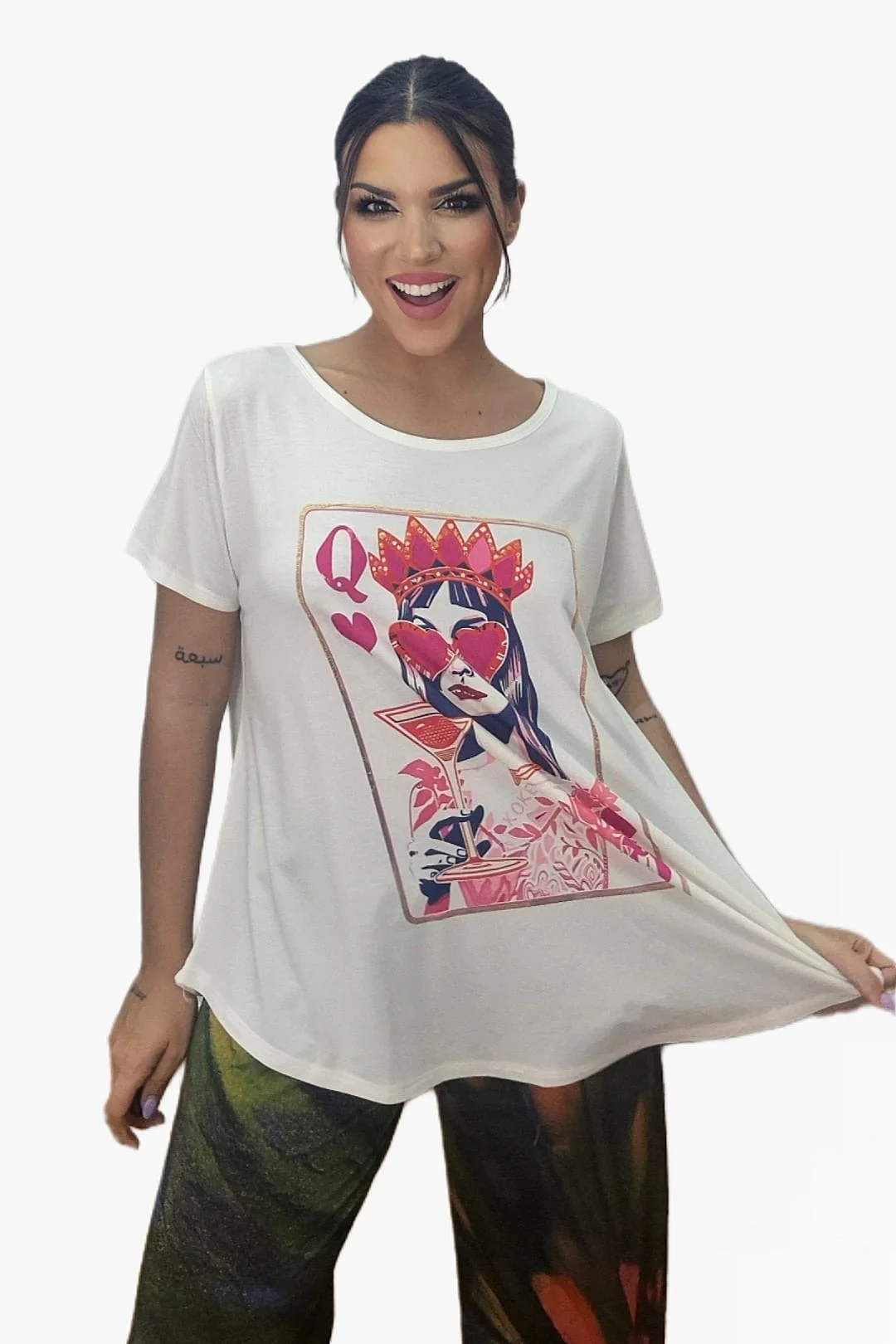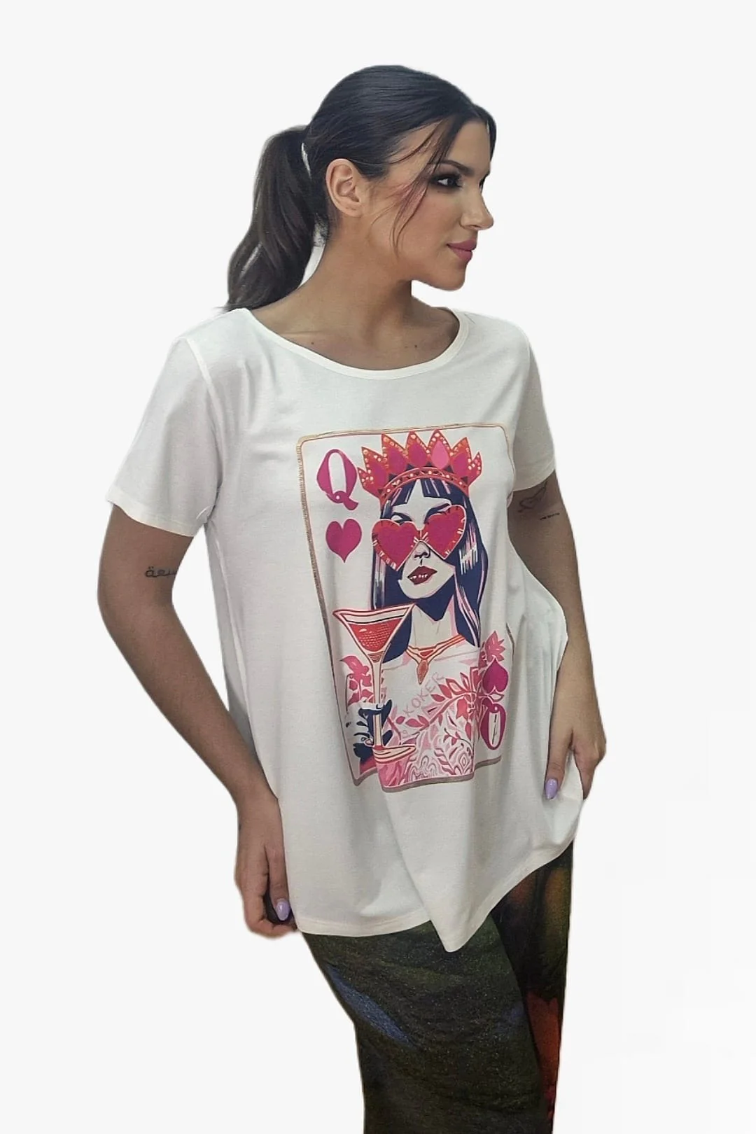 - Camiseta blanca con ilustración de reina de corazones
