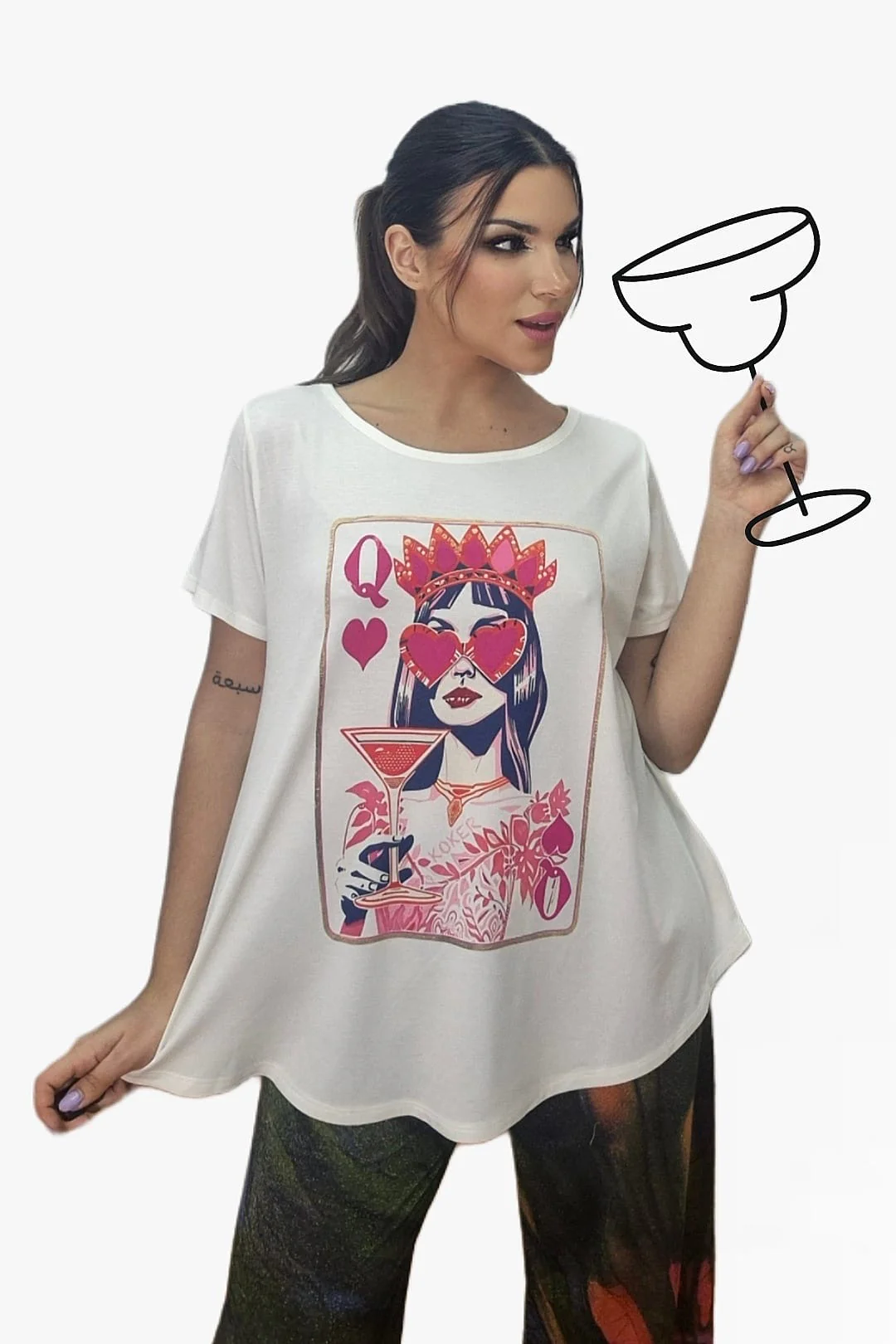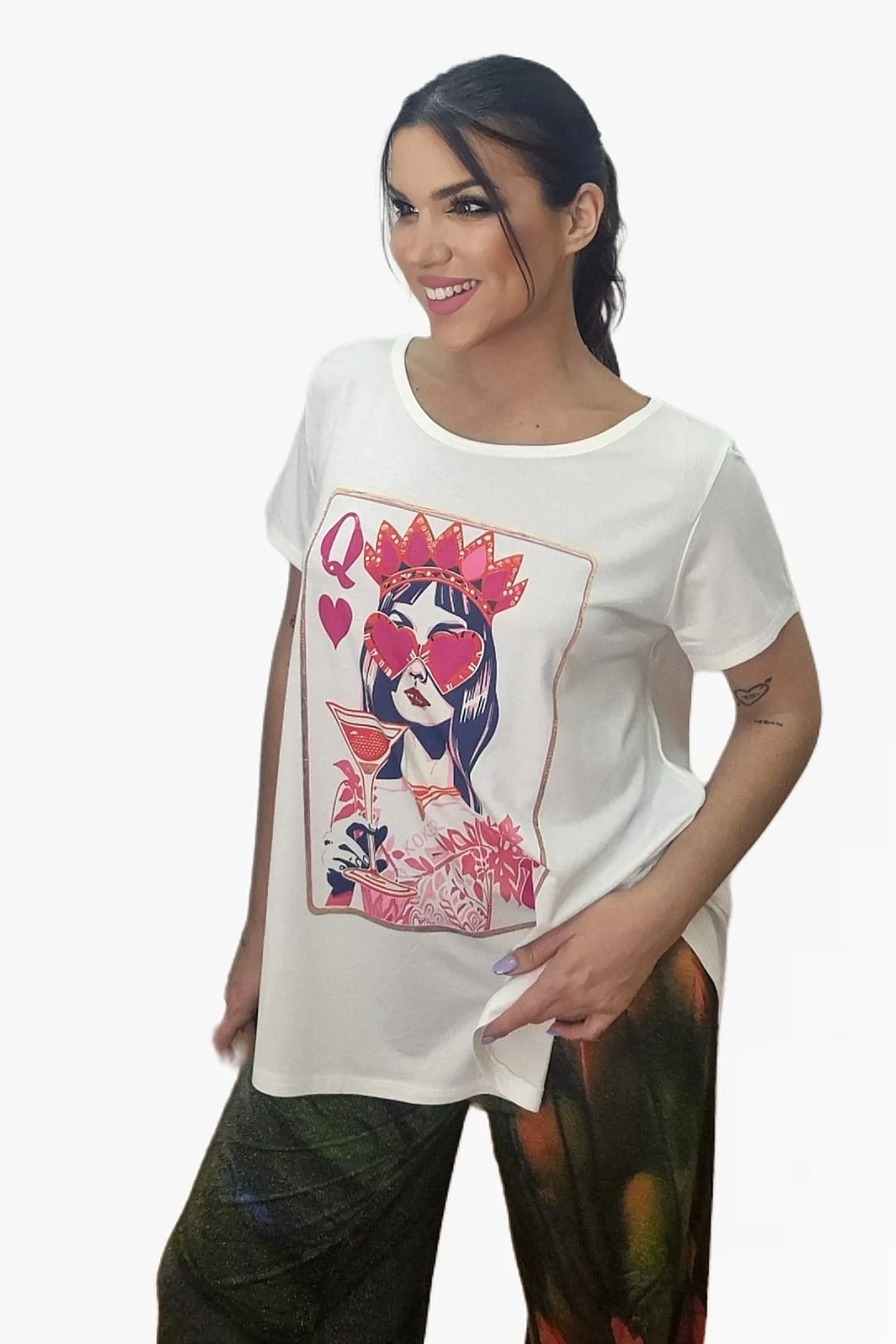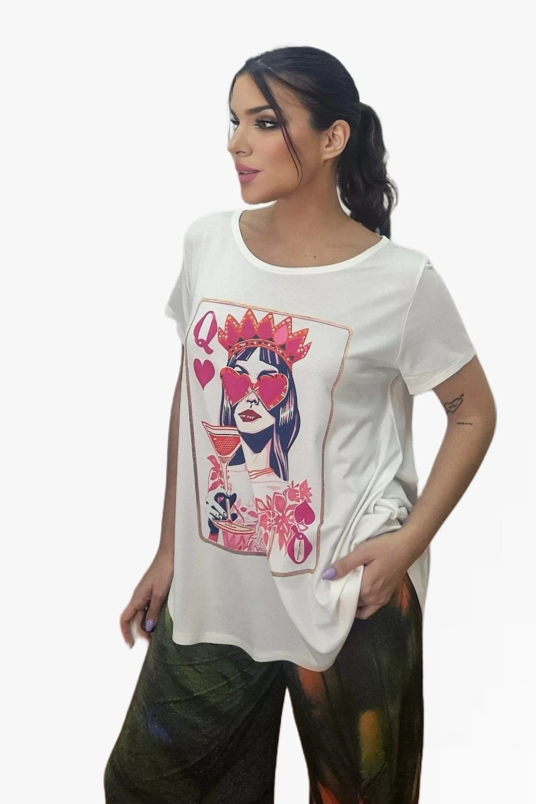 La Camiseta Queen eleva cualquier look con su ilustración estilo carta de la reina de corazones, reinterpretada con guiños pop y un toque divertido. El diseño es fresco, femenino y perfecto para quienes disfrutan vistiendo con personalidad y originalidad.