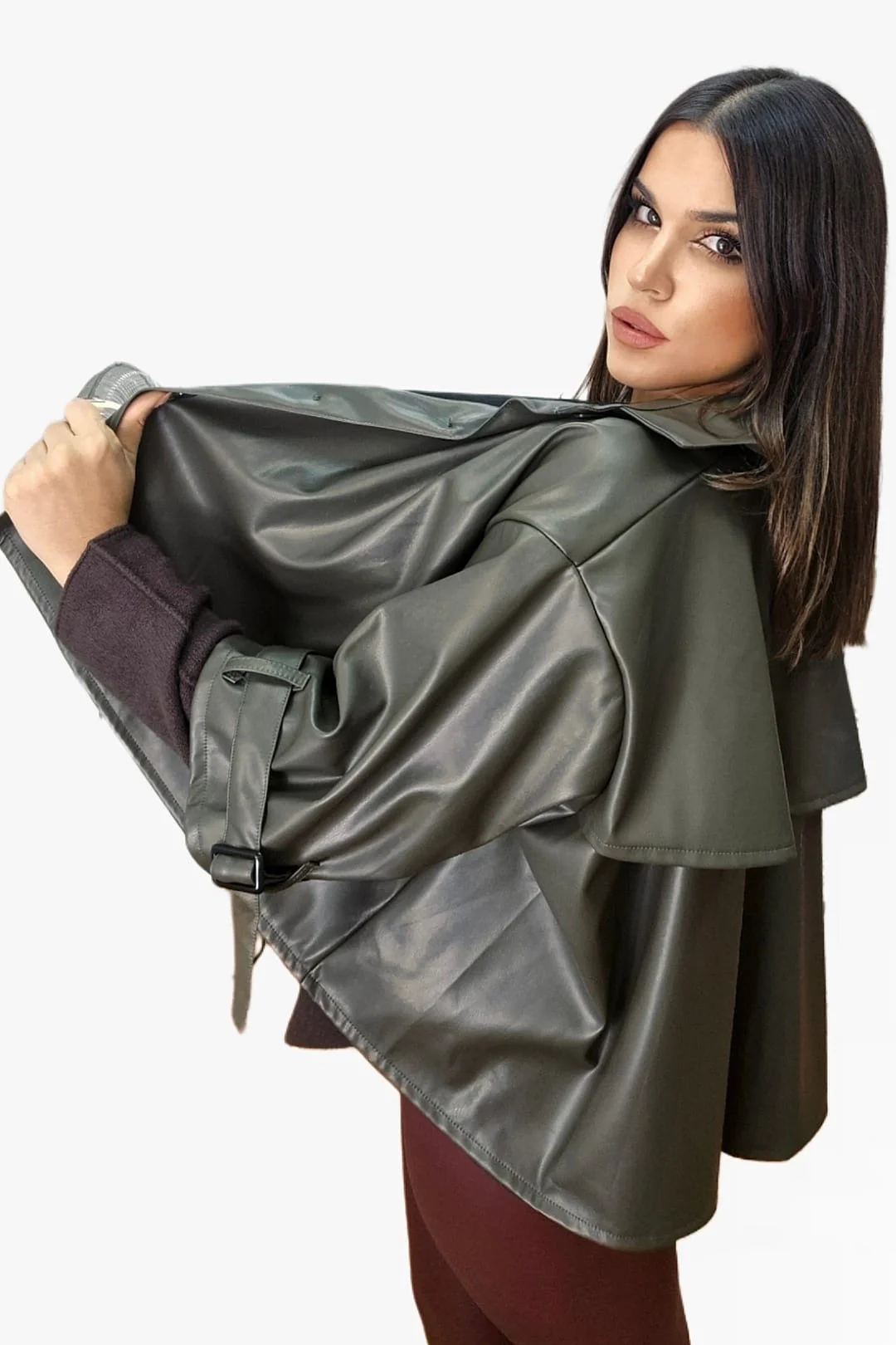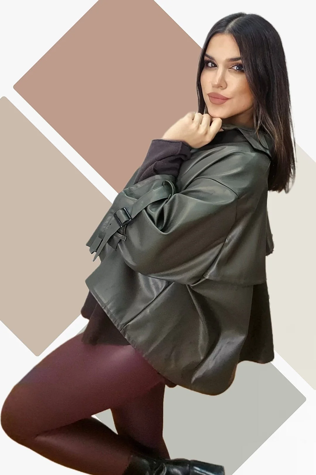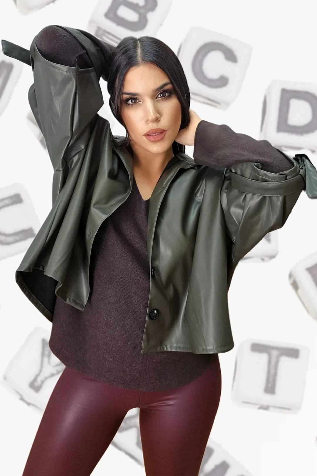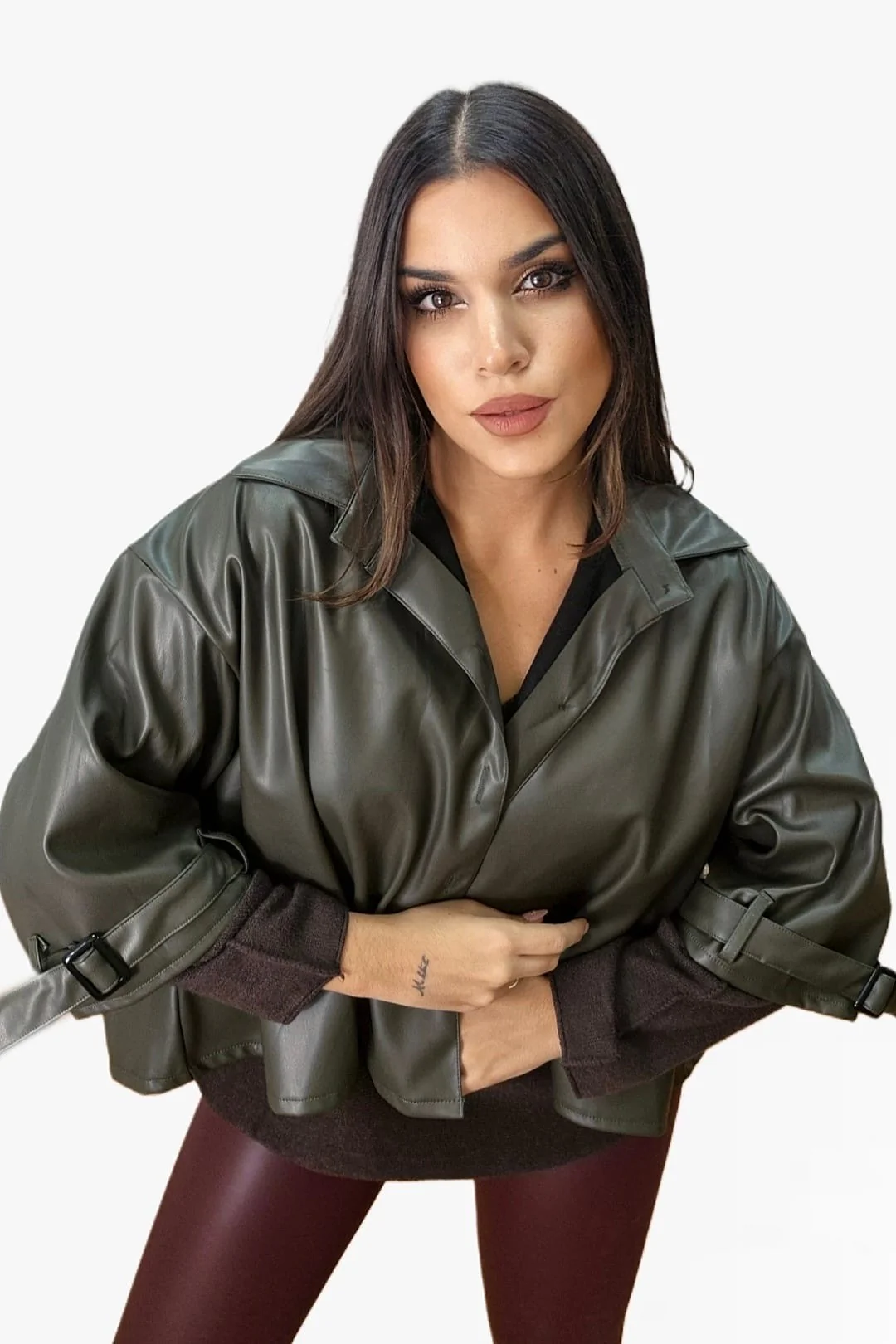 Una prenda versátil que eleva cualquier look con su acabado en efecto piel. Su diseño oversize y corte fluido aportan comodidad sin renunciar al estilo, mientras que los botones frontales y el detalle en las mangas le dan un aire moderno y sofisticado.