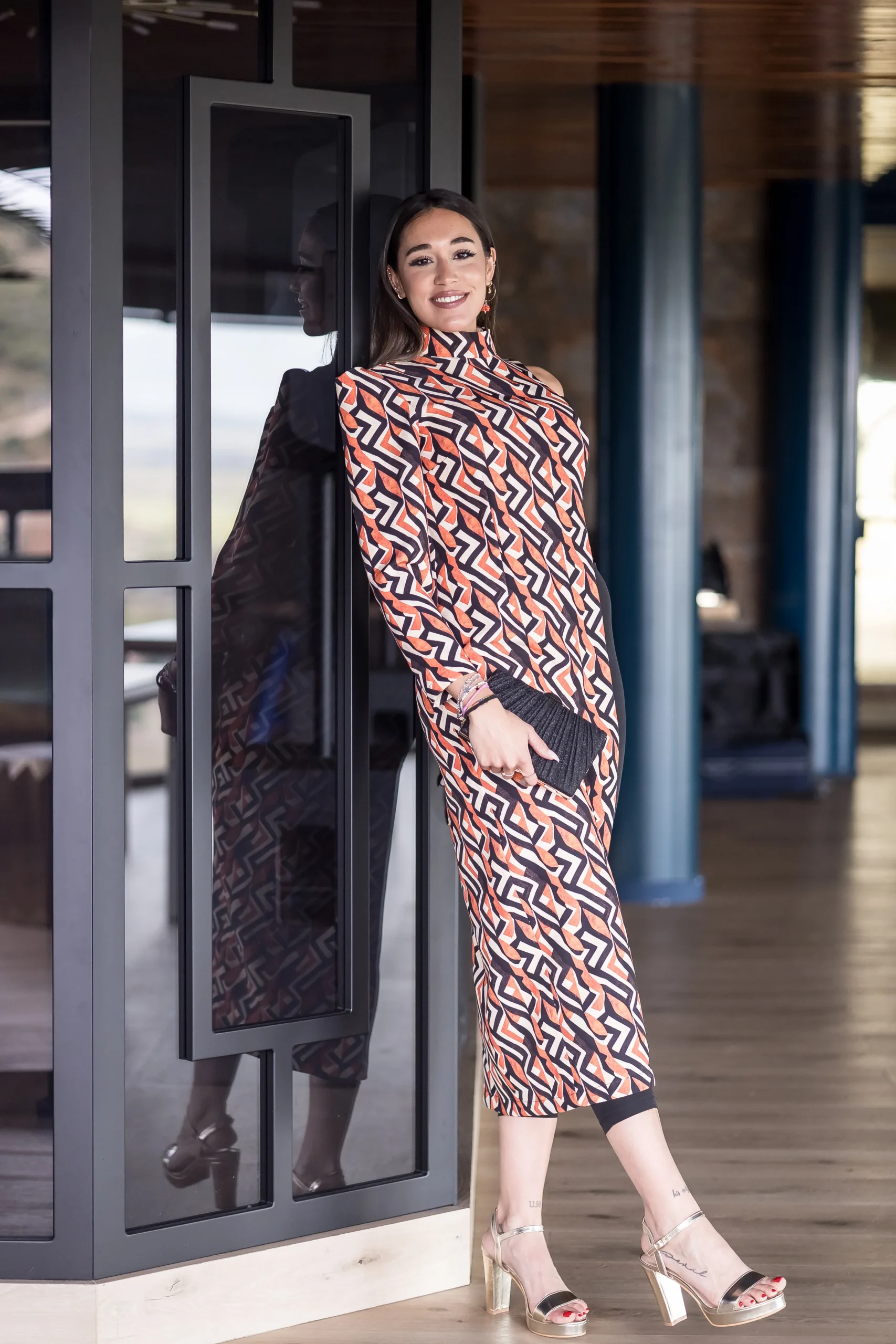 Casaca con estampado étnico, de una sola manga abullonada y largo asimétrico.