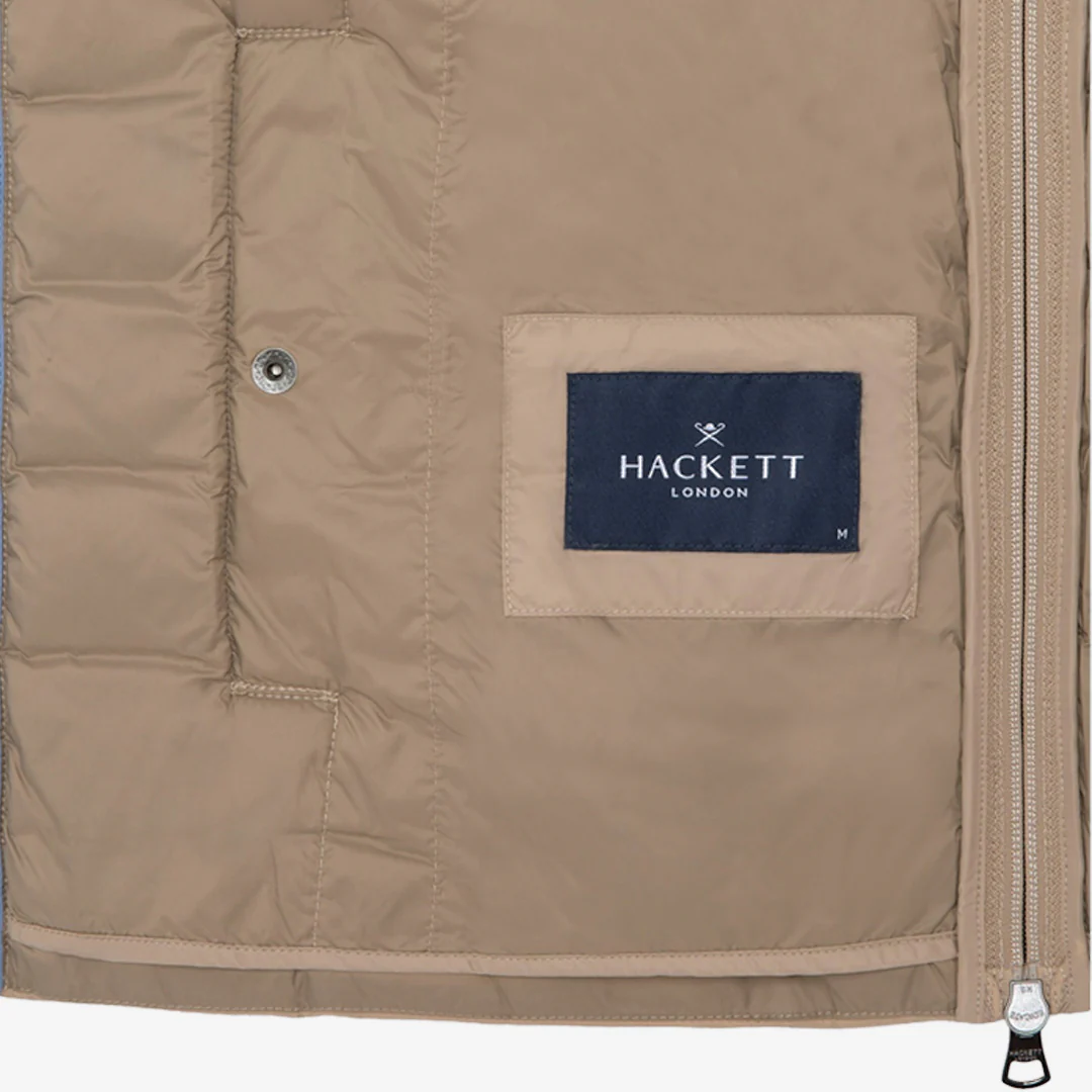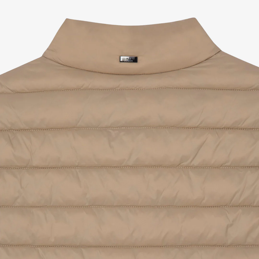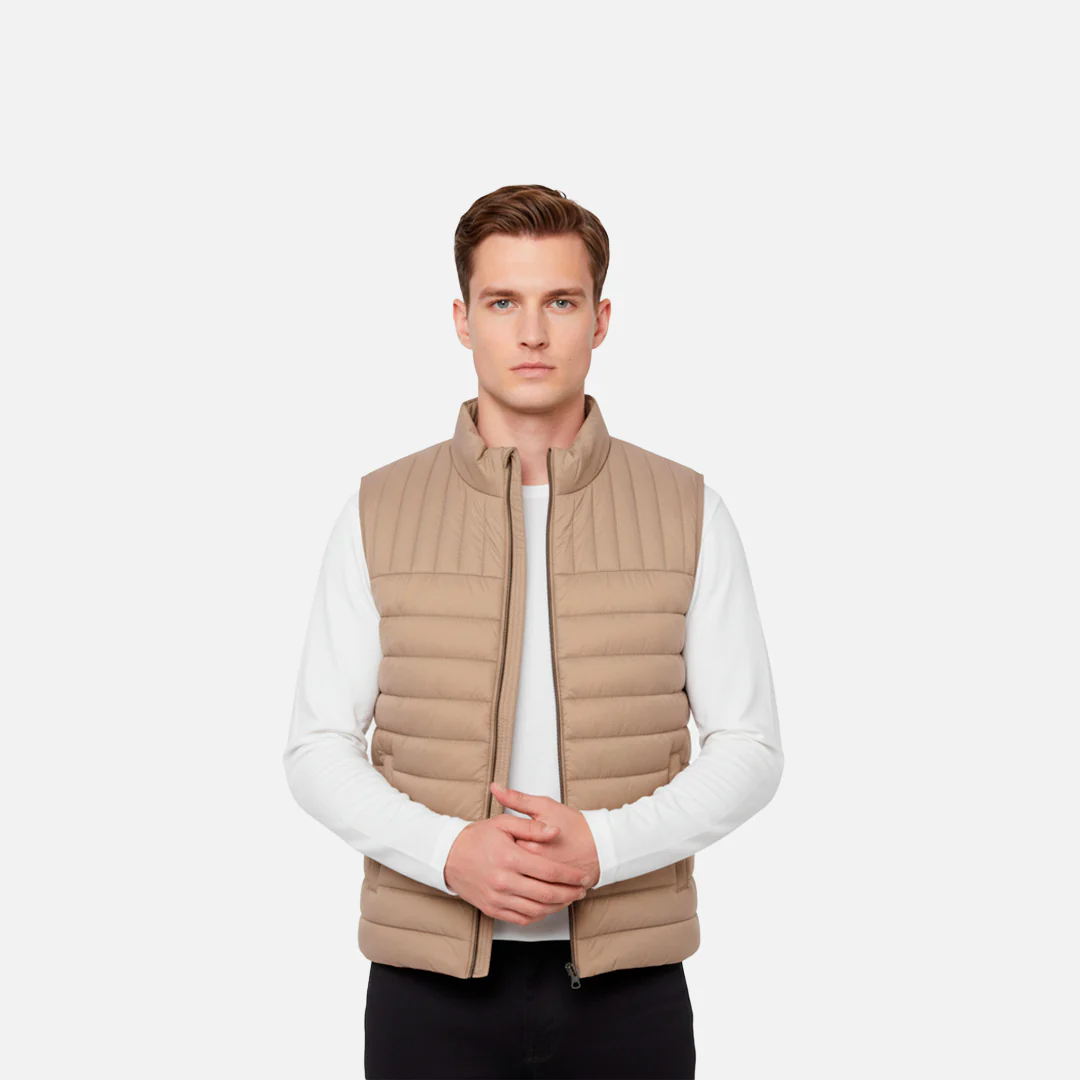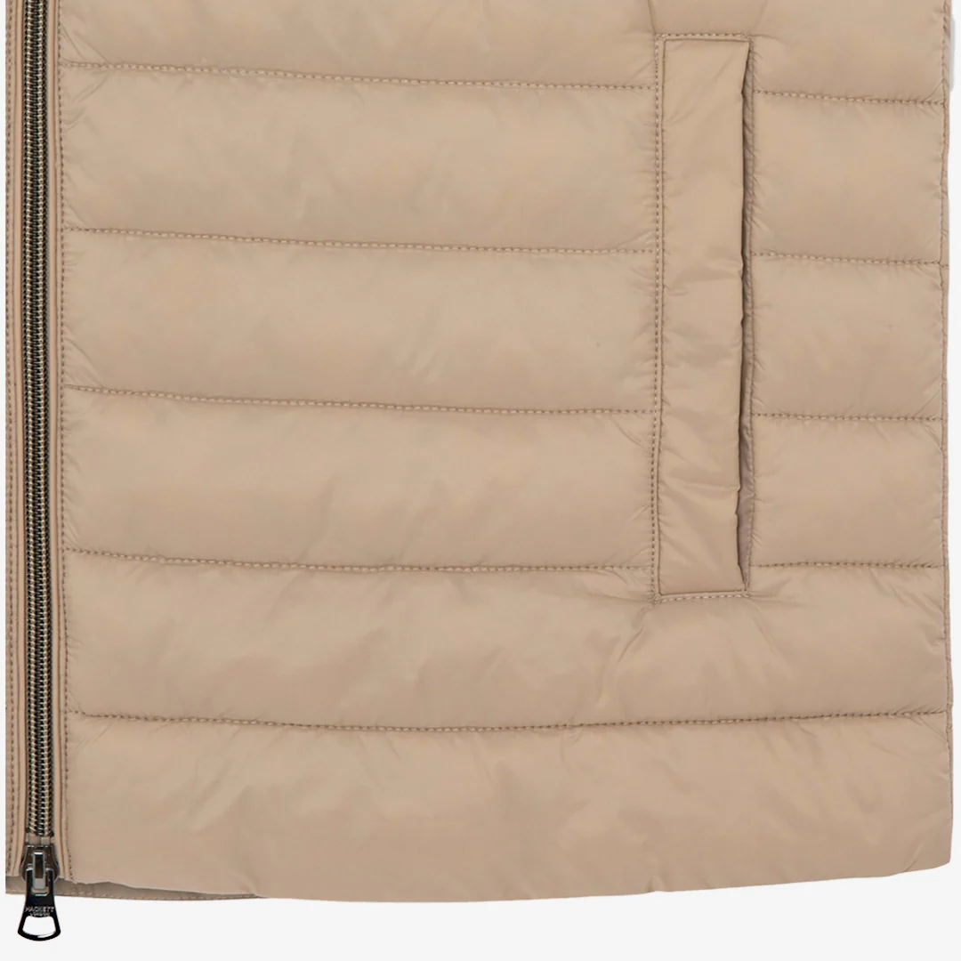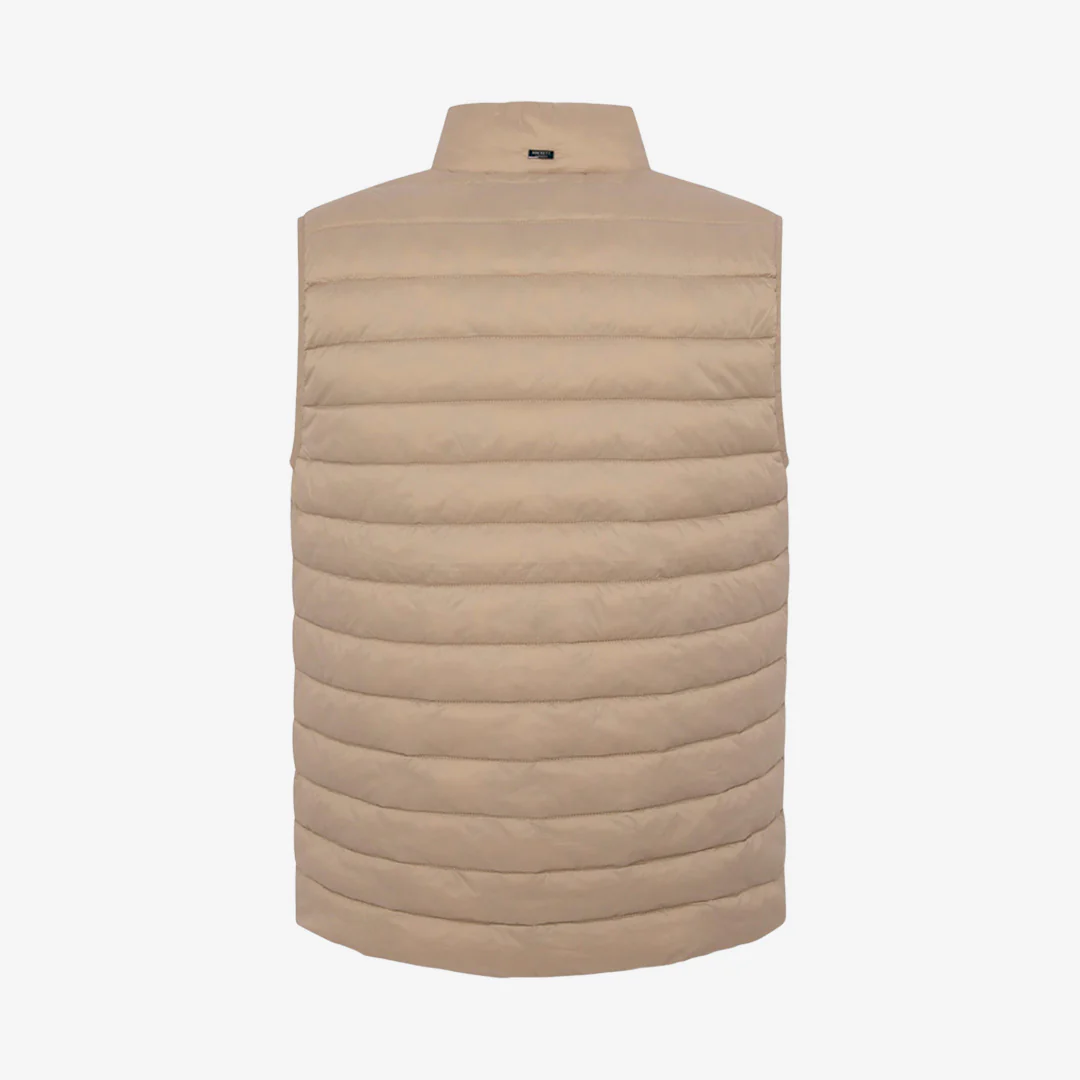 Chaleco acolchado beige con un diseño elegante y funcional. Confeccionado con nylon reciclado y relleno ecológico que imita las plumas, lo que lo hace ligero y sostenible. Ideal para climas de transición, ofrece aislamiento ligero y es resistente al agua. Presenta cremallera bidireccional Aquaguard, bolsillos de ojal discretos y un logo minimalista de silicona tonal en el cuello posterior. Versátil, perfecto para un look casual pero sofisticado.