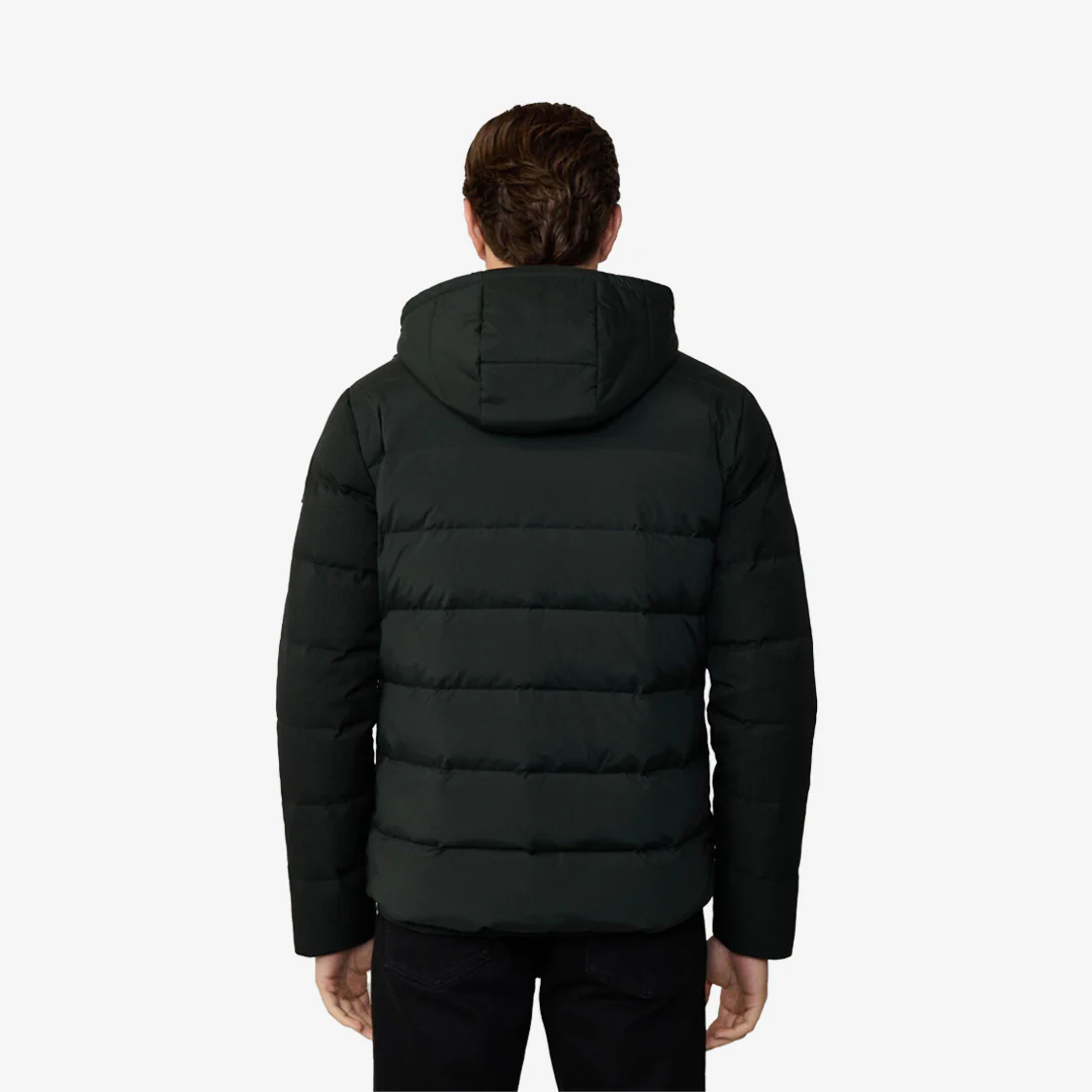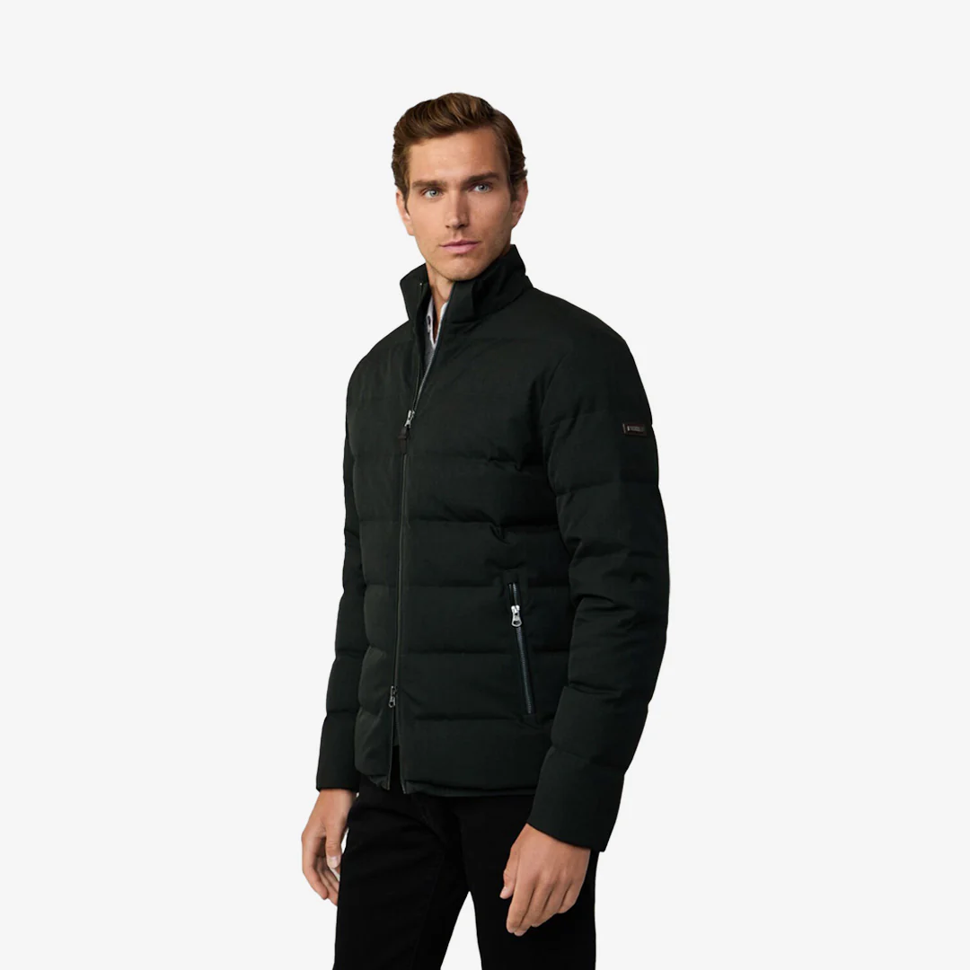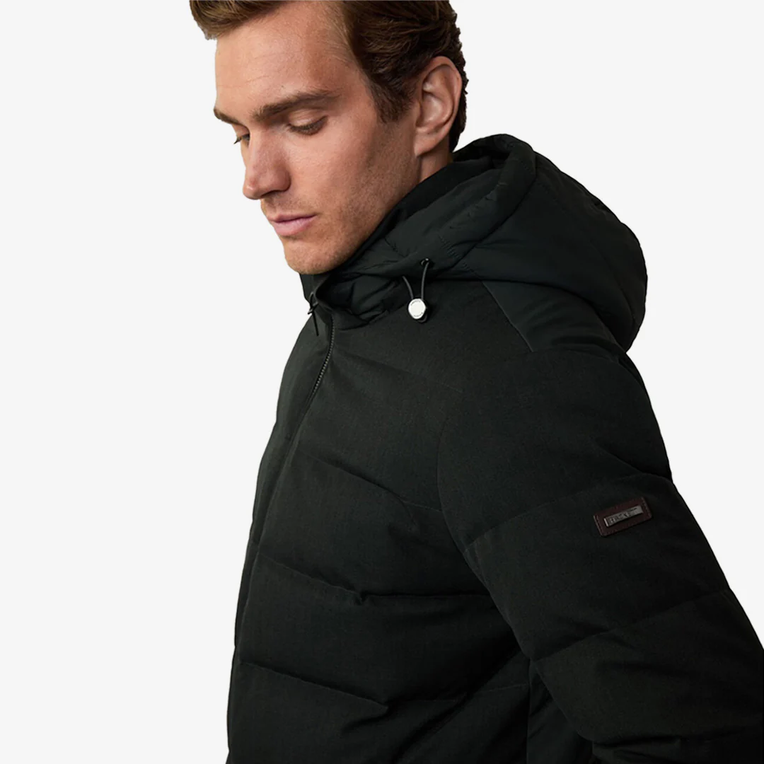 Es una chaqueta híbrida con capucha y acolchado, que combina un estilo moderno y versátil con funcionalidad. Está confeccionada con una mezcla de sarga de lana y nylon, y cuenta con un acabado ultraligero y resistente a las arrugas.