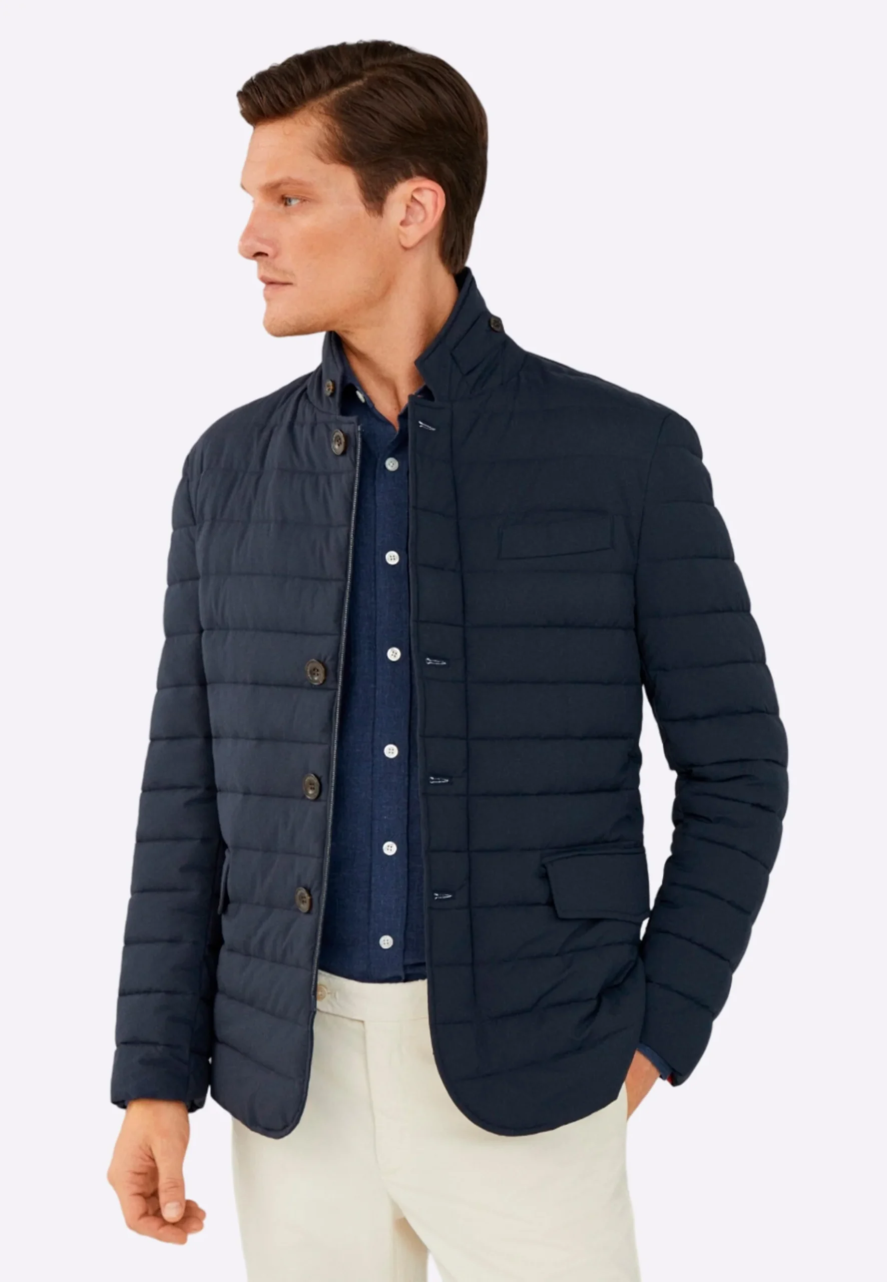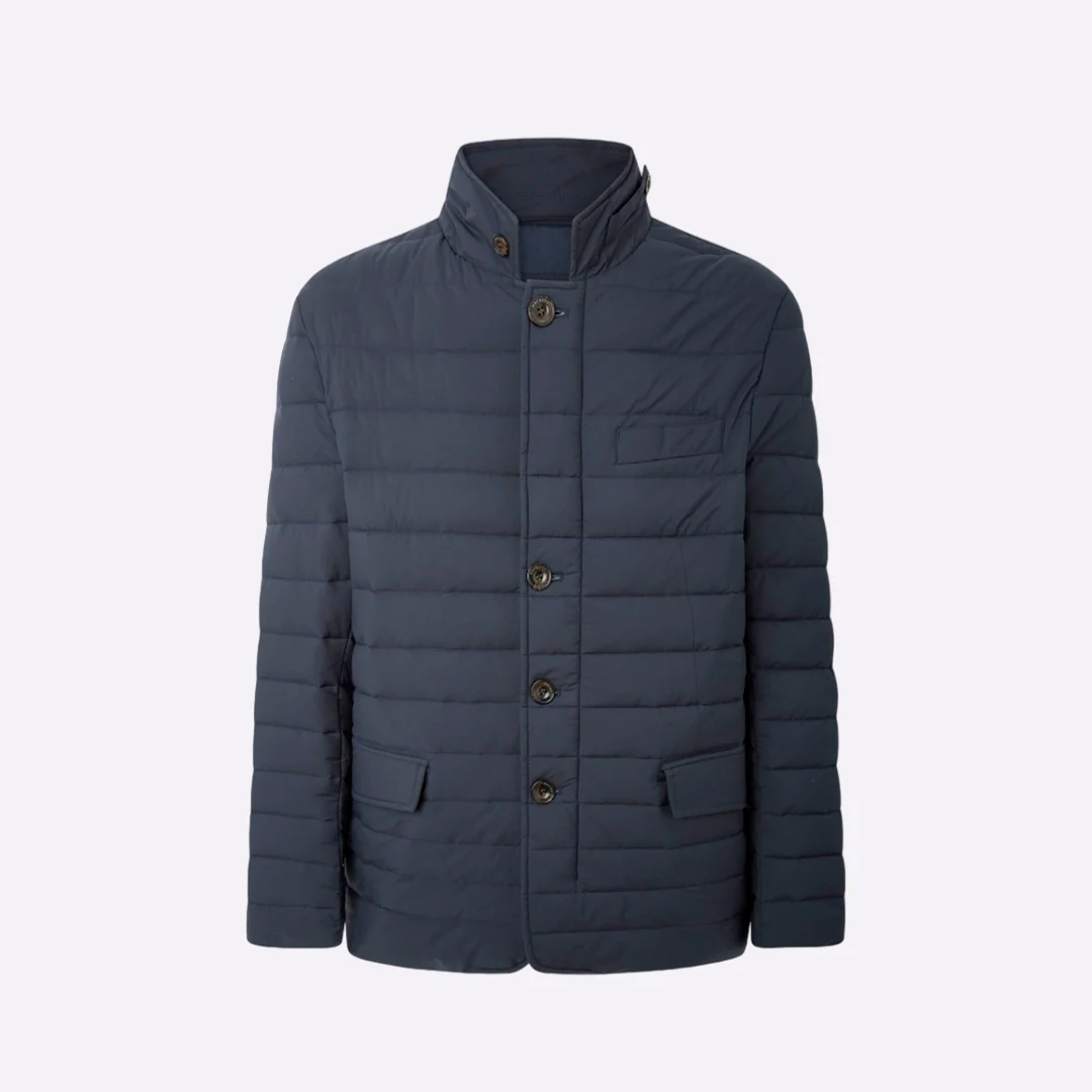 chaqueta de plumón ligera en un clásico color azul marino. Se distingue por su diseño versátil que simula el corte de un blazer o una chaqueta de traje, lo que la hace perfecta para ocasiones formales. Con cierre de botones frontales en lugar de cremallera, el estilo es elegante y sofisticado. Es la prenda ideal para combinar un look de oficina con la funcionalidad de una chaqueta acolchada.