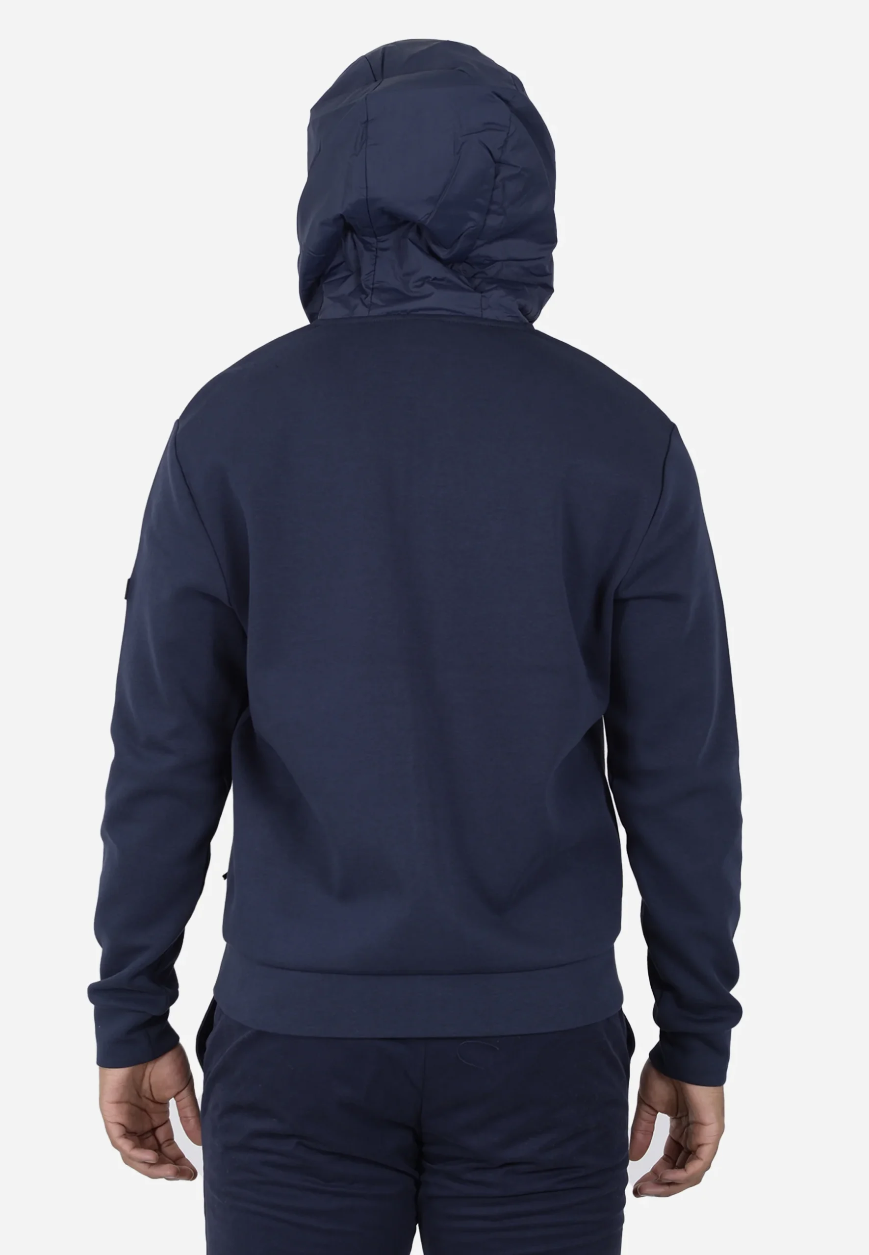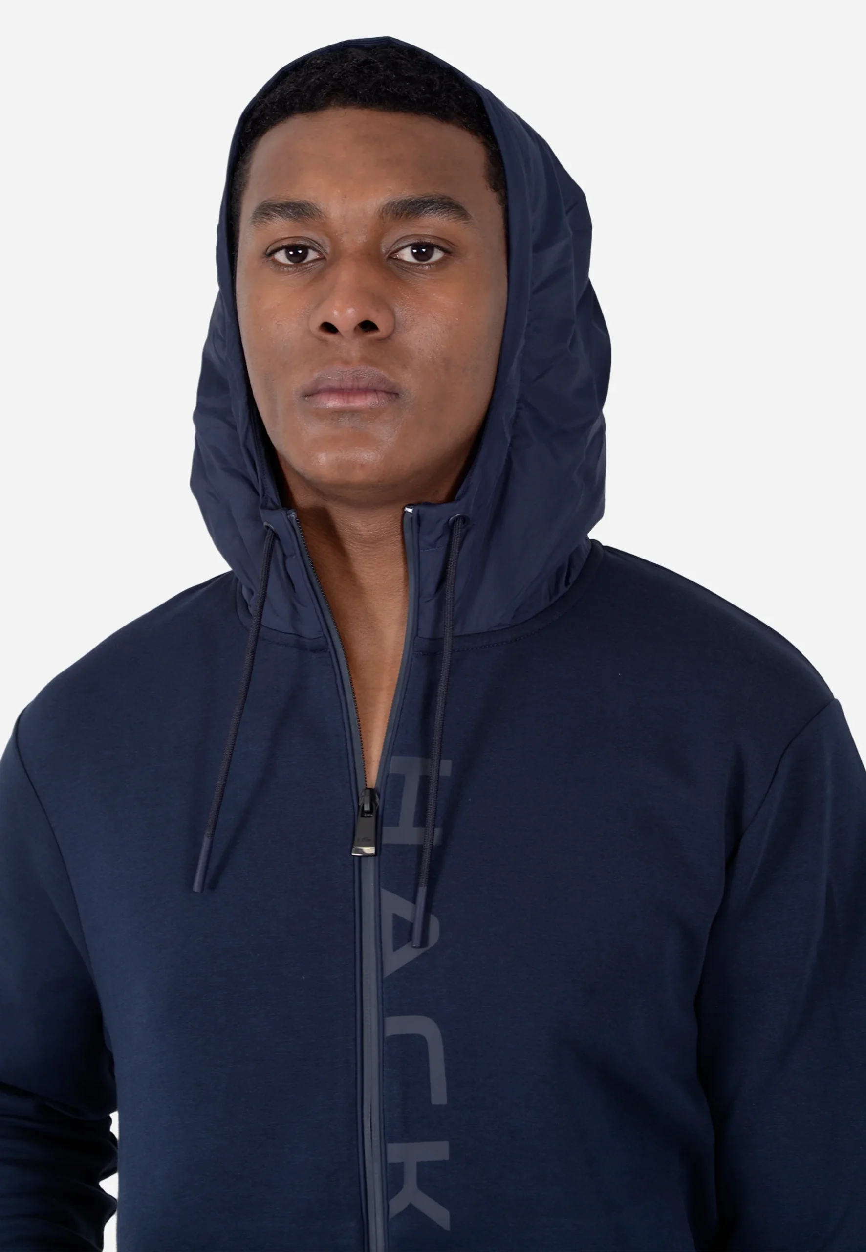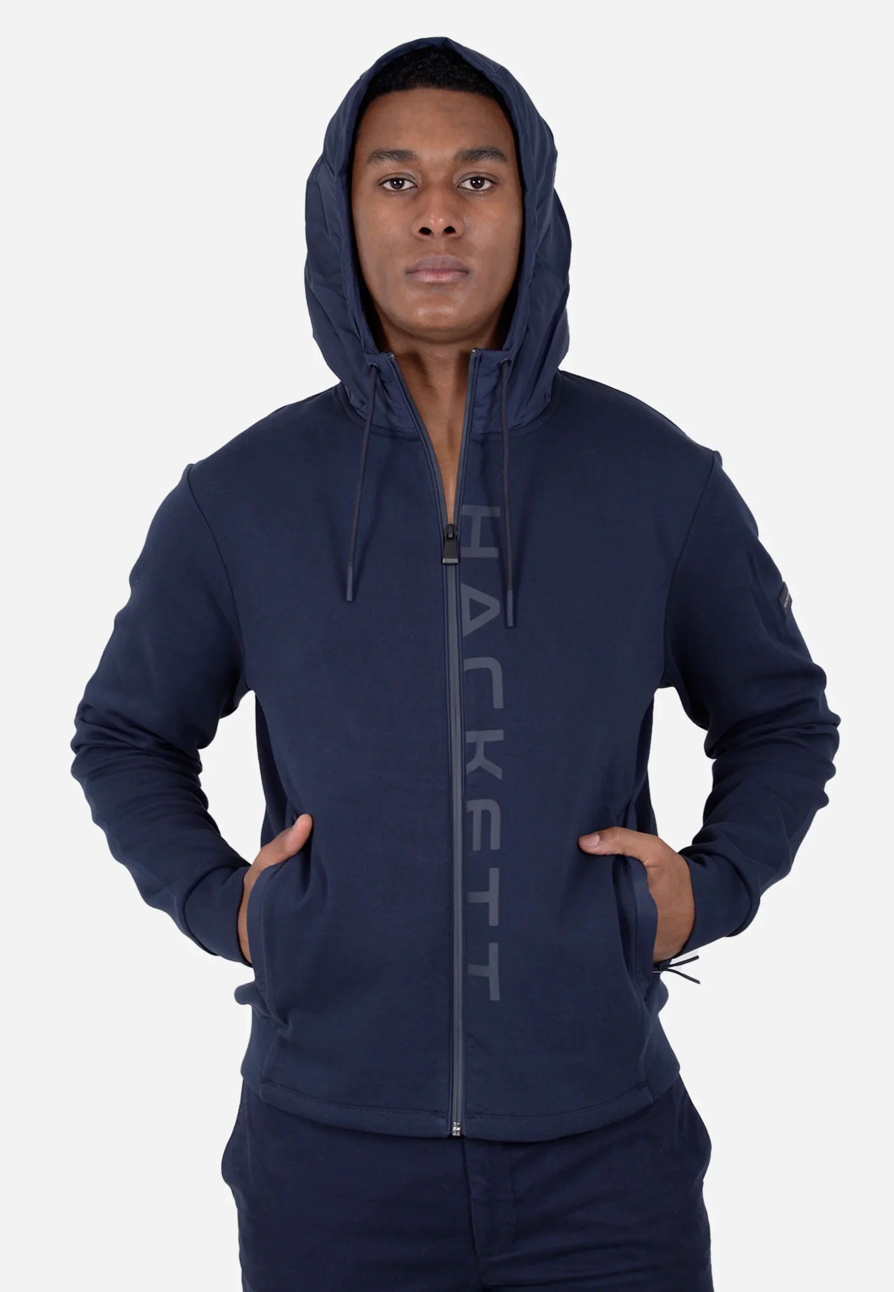 Chaqueta con capucha para hombre, de la marca Hackett London. Es de un color azul marino liso y tiene el logo de Hackett London bordado o estampado verticalmente a un lado de la cremallera. La sudadera tiene cierre de cremallera frontal, bolsillos laterales y capucha ajustable con cordones. Por su estilo, es una prenda ideal para un look casual y cómodo.(HM581240-595)