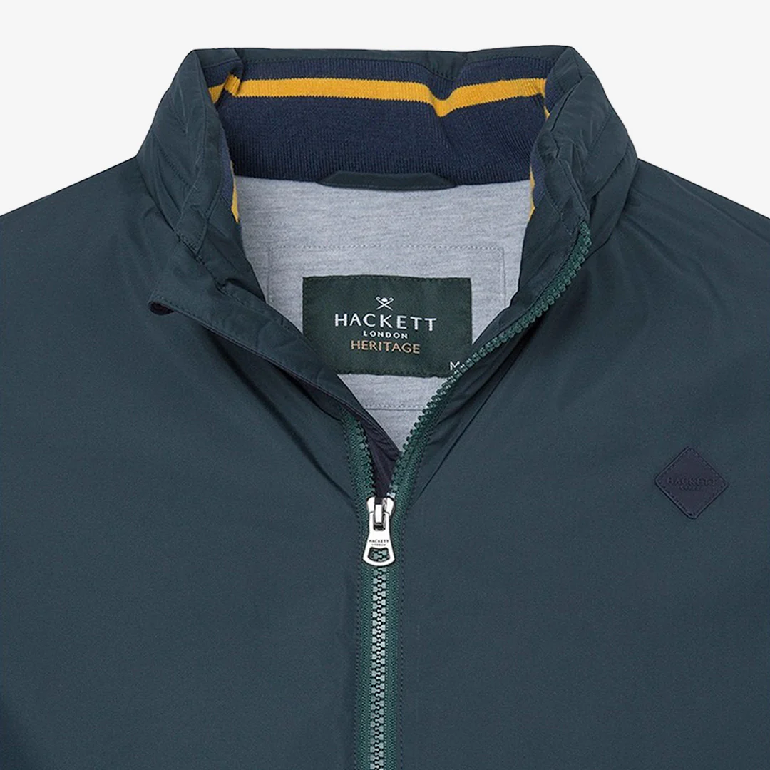 Fabricado en nailon compacto con acabado impermeable y aislamiento Smawarm, presenta el logotipo de Hackett en silicona mate estampado en la manga izquierda y el icónico estampado «Umbrella Bowler Hat». Cremallera frontal y dos bolsillos de ribete delanteros. Capucha retráctil. Ribete en contraste en el interior del cuello. Dobladillo y puños acanalados. Este cortavientos Heritage es un clásico icónico. Sus detalles técnicos y su función repelente al agua lo convierten en una chaqueta perfecta para la temporada de entretiempo.