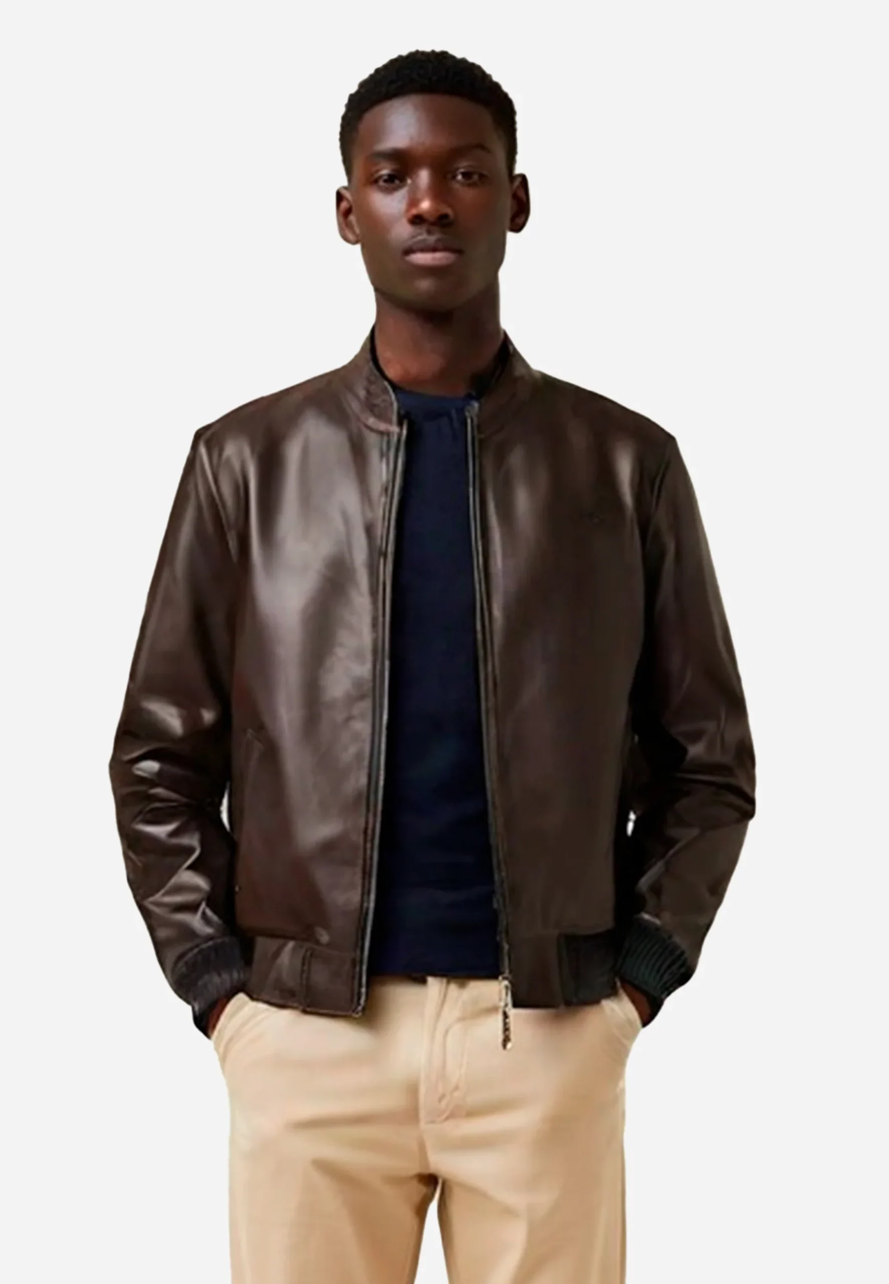 «Chaqueta de hombre estilo bomber en color marrón oscuro, confeccionada en material tipo cuero para un look moderno y sofisticado. Su diseño incluye cierre frontal con cremallera, cuello, puños y basta en rib acanalado que aseguran un ajuste cómodo y un estilo urbano. Perfecta para combinar con jeans, pantalones chinos o looks casuales elegantes, es una pieza versátil para completar cualquier outfit.»
