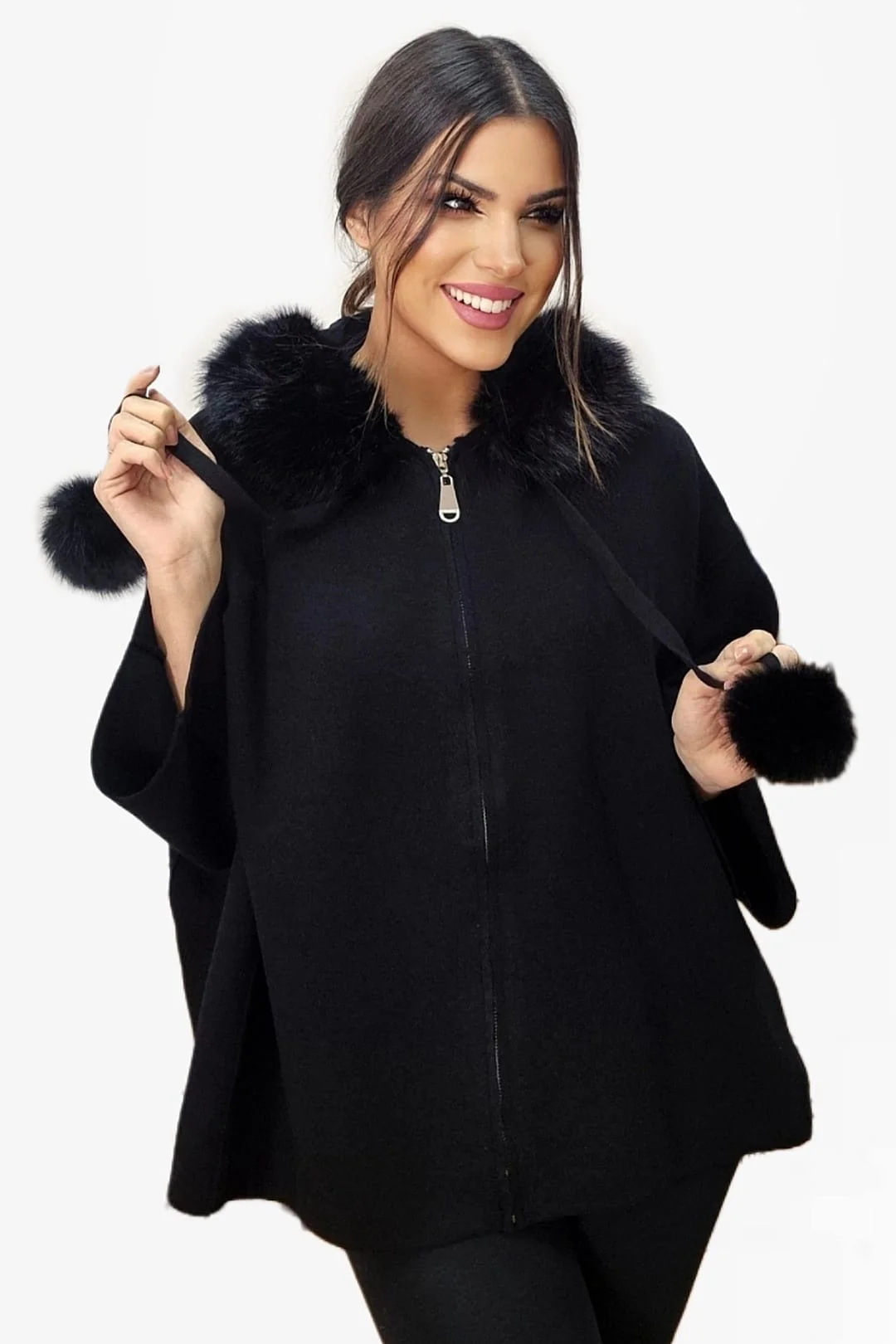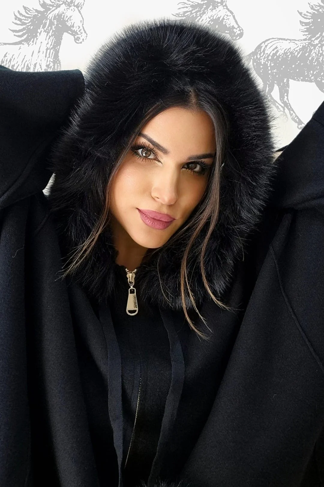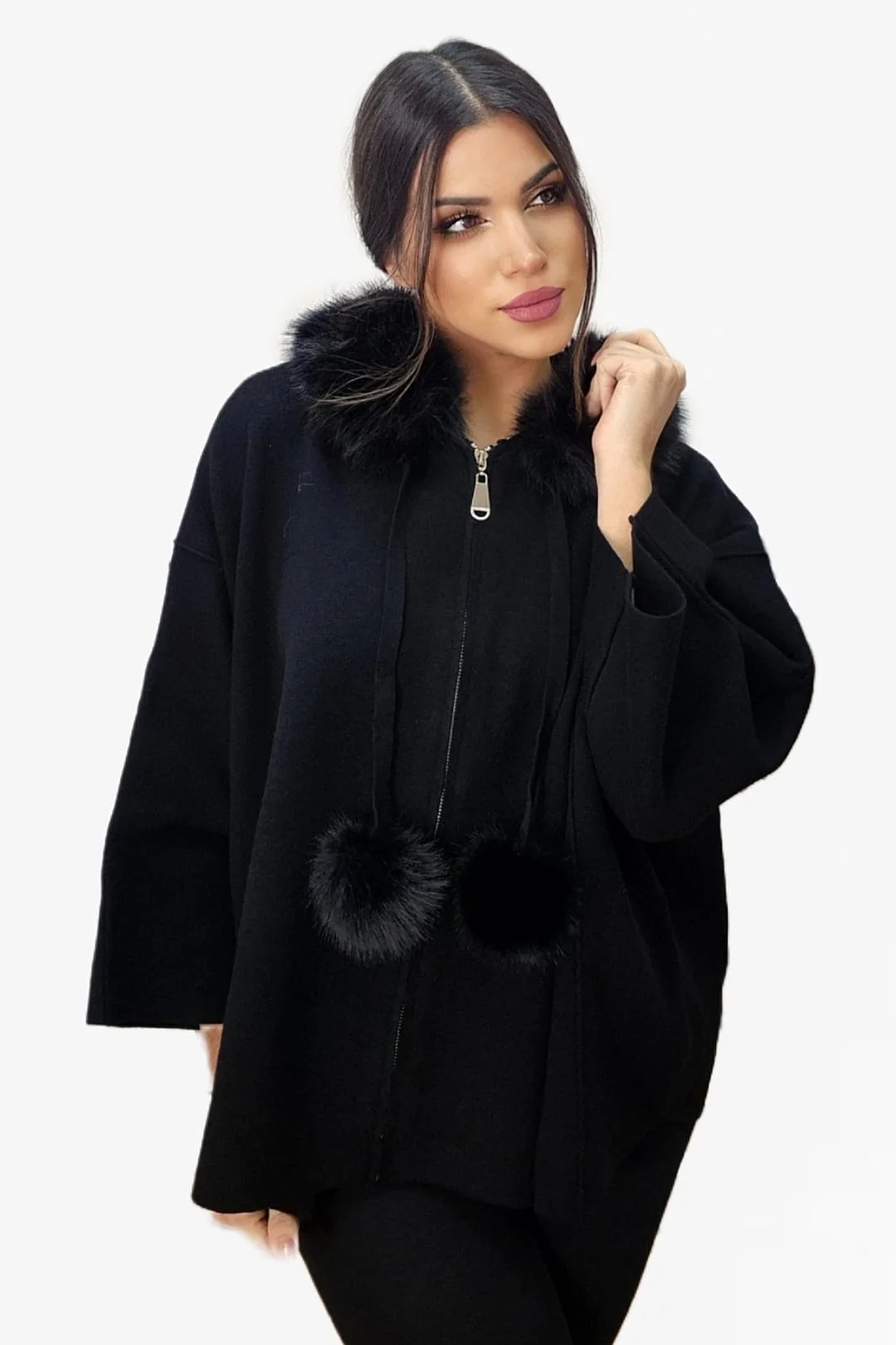 Una chaqueta envolvente y súper estilosa, diseñada para aportar abrigo sin renunciar al encanto. Su capucha con borde de pelito suave y pompones aporta un toque coqueto y femenino, convirtiéndola en la prenda perfecta para los días más fríos.