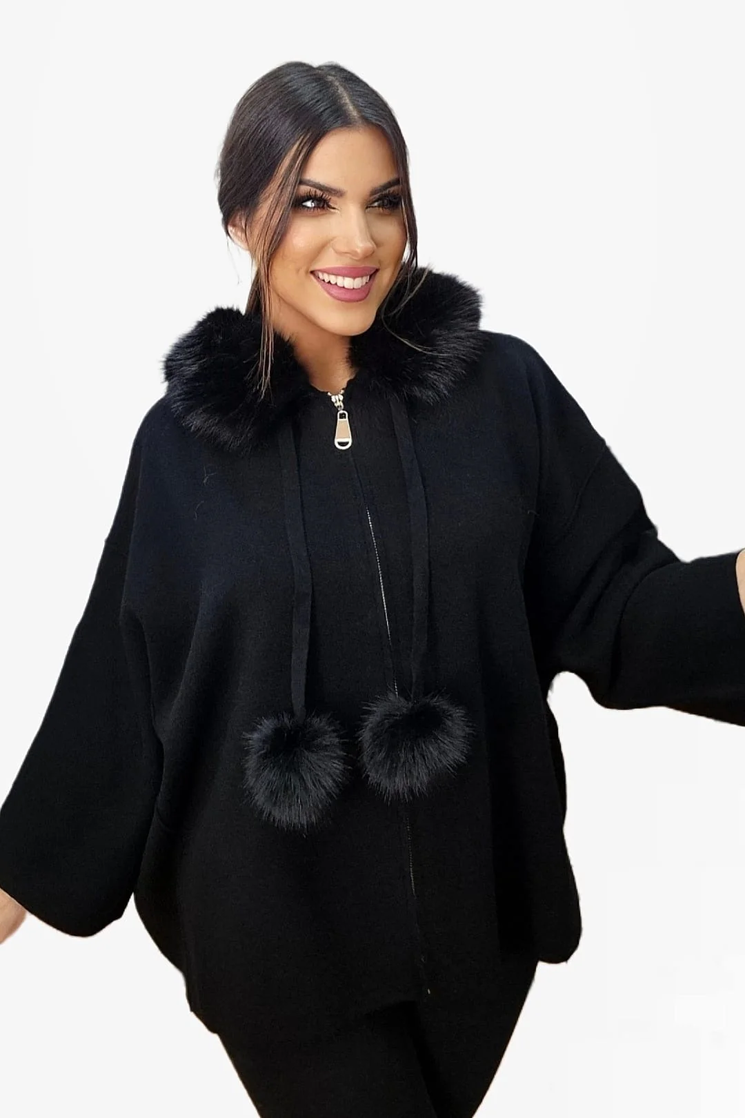 - Chaqueta con capucha, pelito suave y pompones decorativos