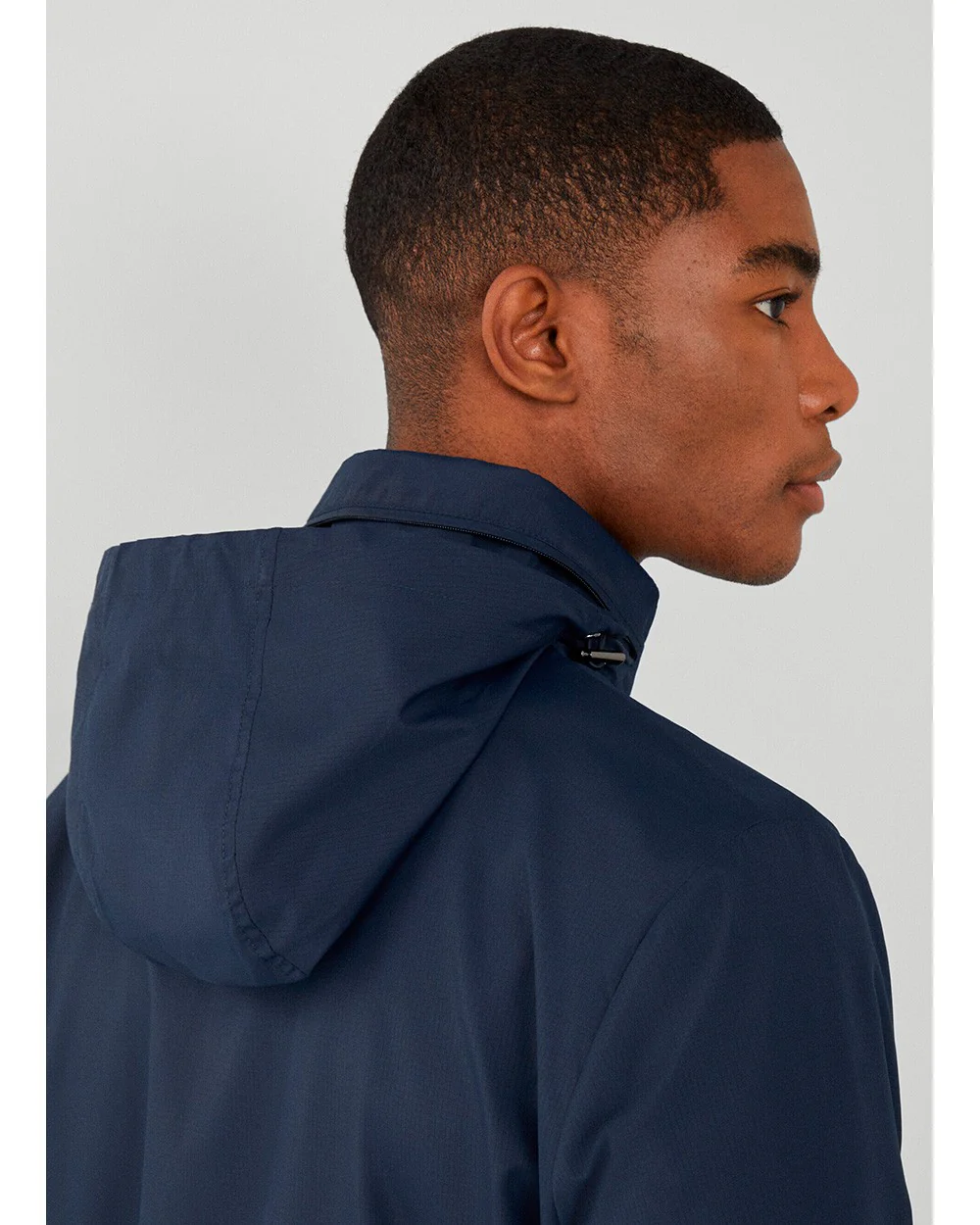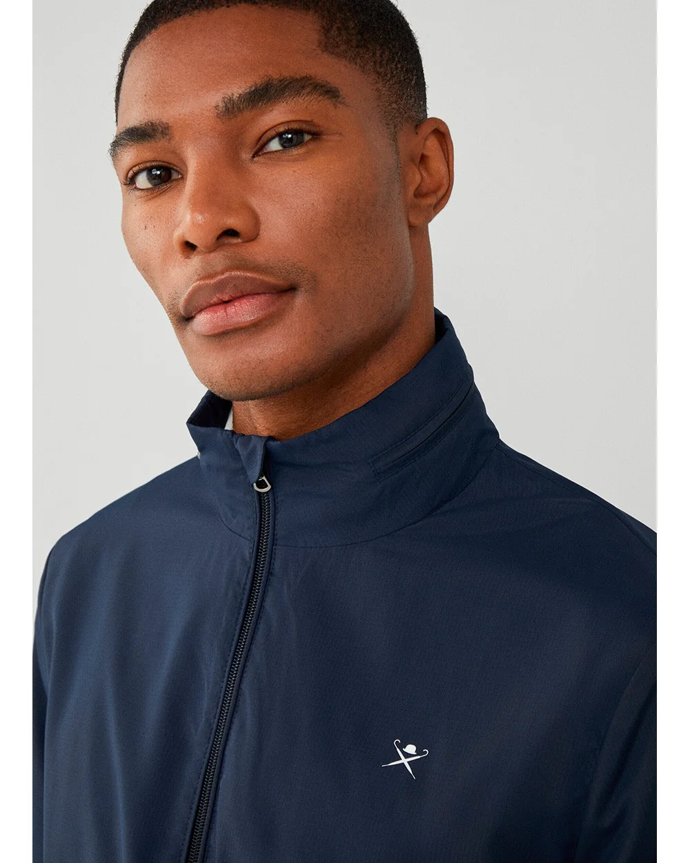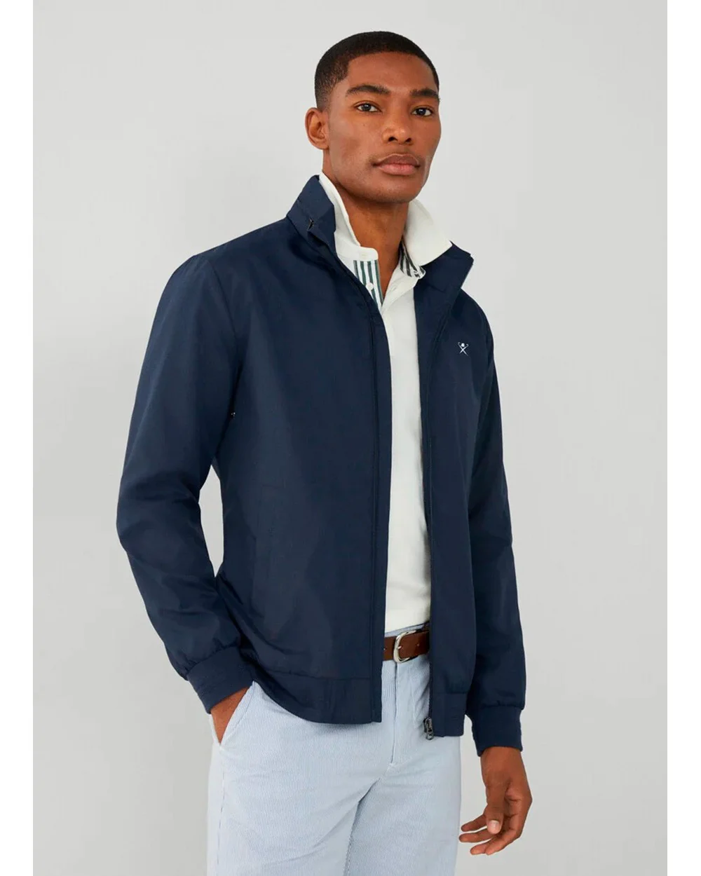 chaqueta de la marca Hackett London en un elegante color azul marino. Es un diseño clásico y versátil, con un cuello alto que se puede llevar levantado para protegerte del viento. La chaqueta cuenta con cremallera frontal, bolsillos laterales y un ajuste en las mangas para mayor comodidad. El logo de la marca se encuentra en el pecho, dándole un toque de distinción.