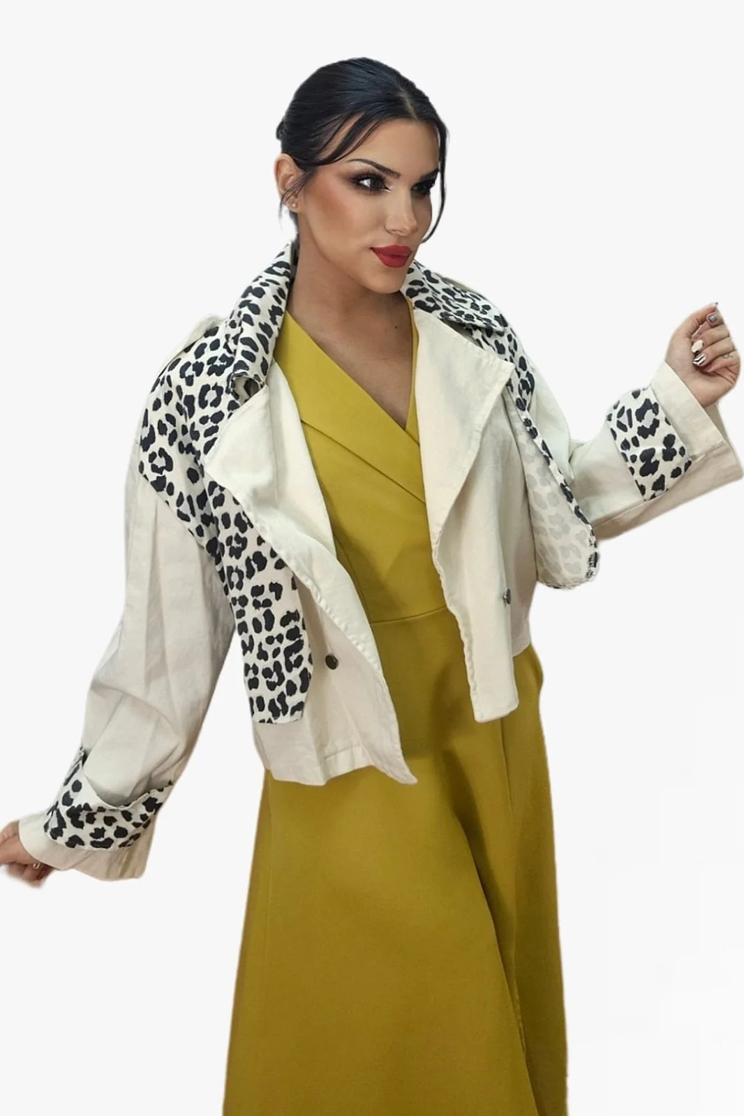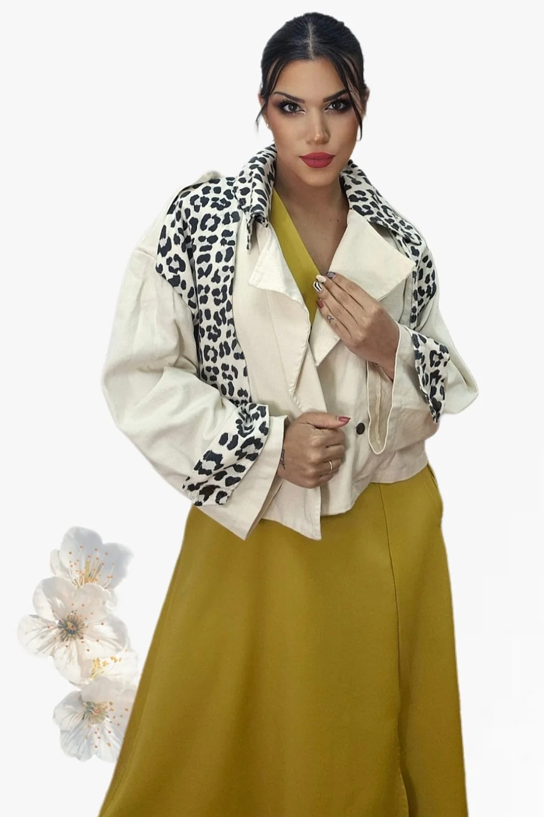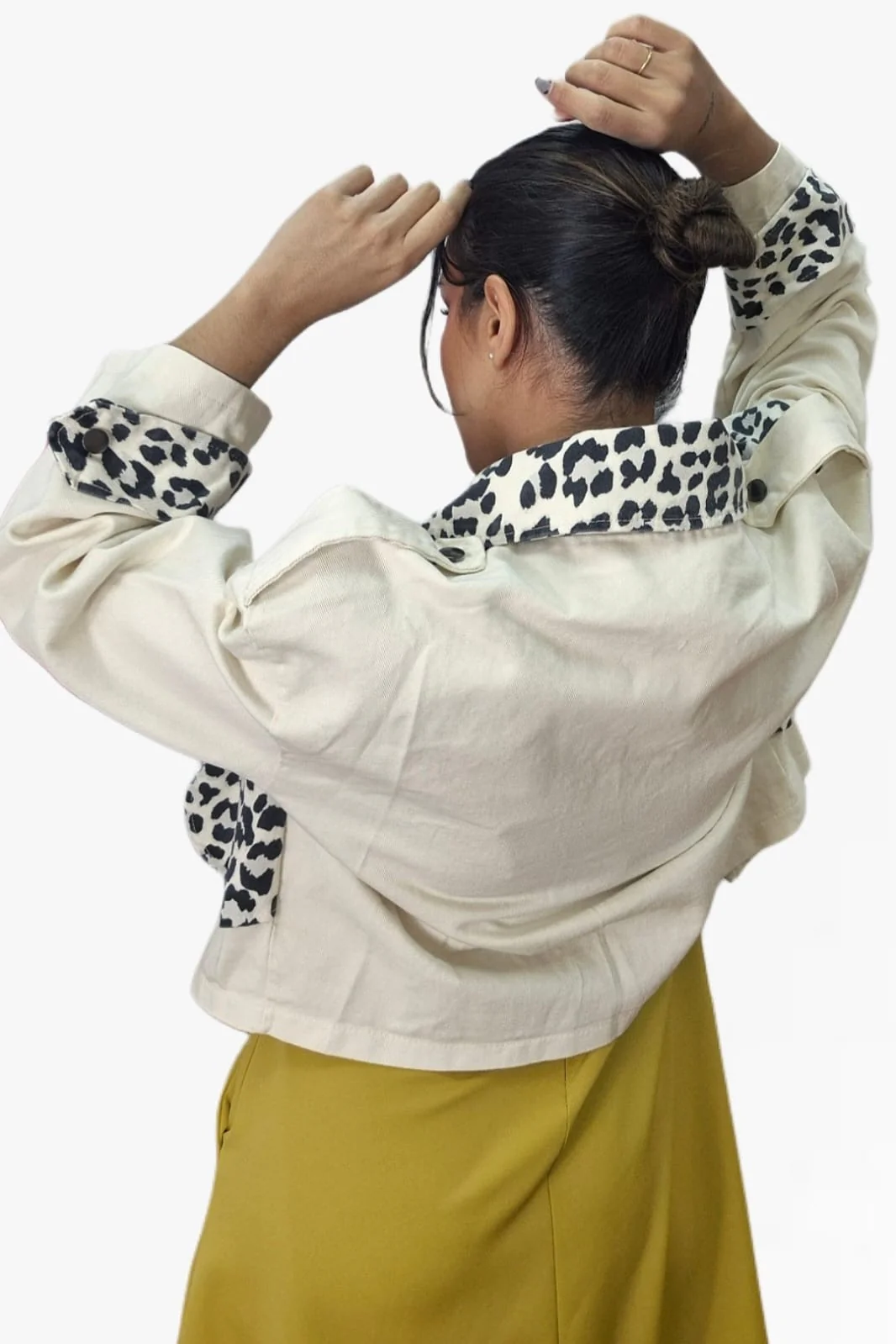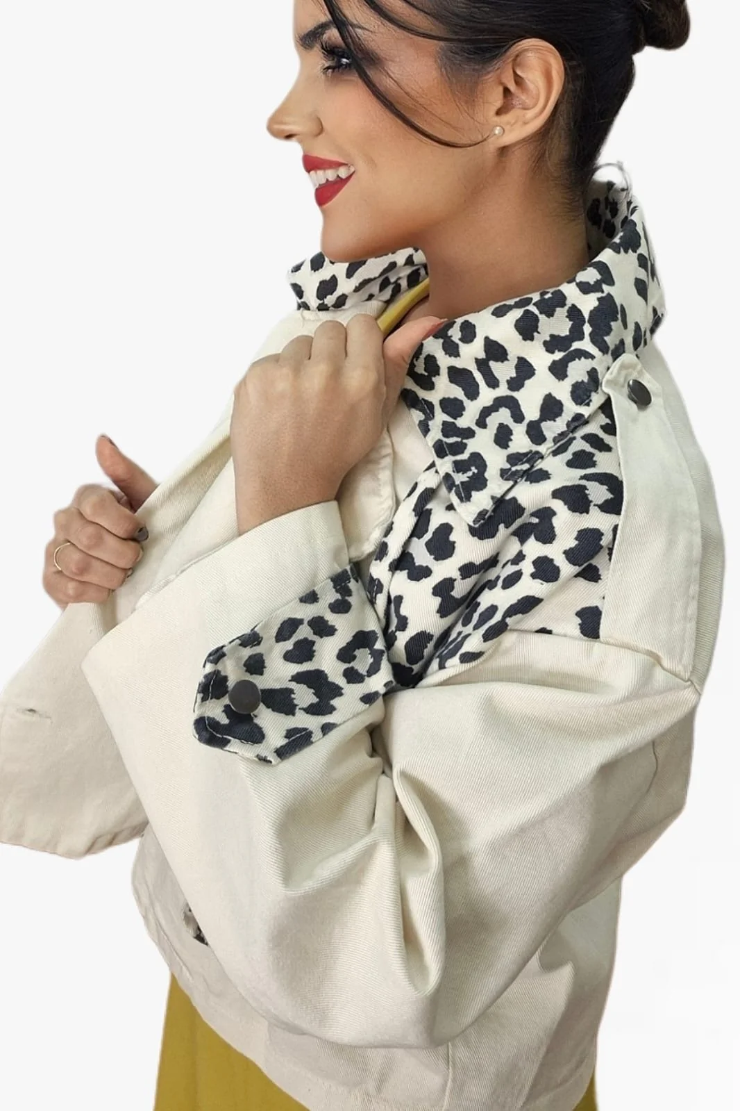 Marca la diferencia con esta chaqueta cruzada en tono beige con detalles en estampado de leopardo. Su diseño oversize y sus mangas anchas no ajustables le dan un aire relajado y moderno, perfecto para looks desenfadados con personalidad. Se cierra con un único botón frontal y está confeccionada en 100% algodón para una sensación suave y natural.