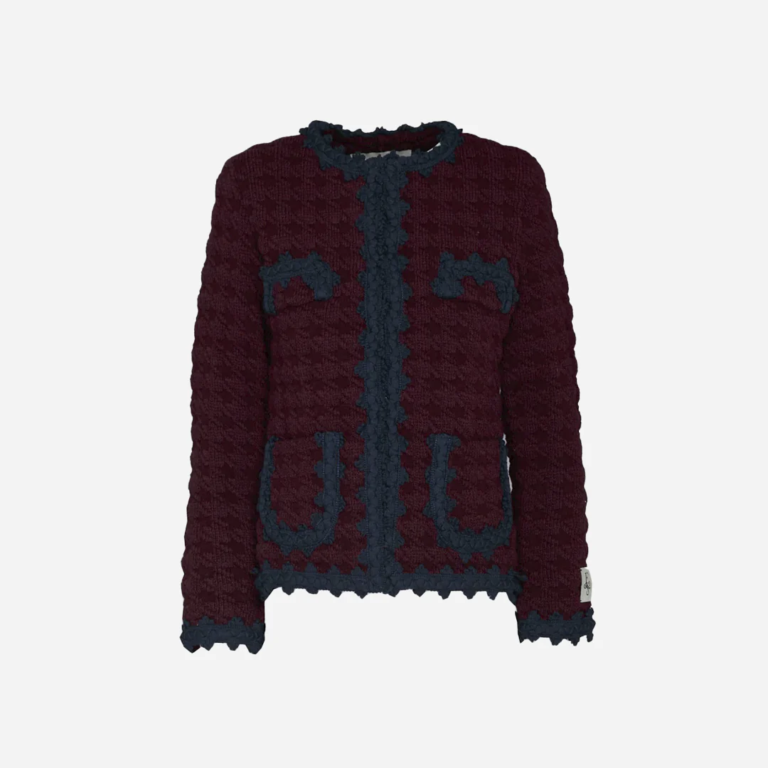 La chaqueta “Bordeaux Couture” representa el equilibrio perfecto entre artesanía y estilo contemporáneo. Confeccionada en un tejido de punto estructurado, destaca por su textura tridimensional y su exquisita combinación de colores: vino profundo con detalles azul petróleo que realzan su carácter exclusivo.Su corte recto y ligeramente acortado favorece la silueta femenina, aportando estructura sin rigidez. Los bordes ribeteados a mano y los bolsillos decorativos frontales evocan la tradición de la sastrería clásica reinterpretada con un toque moderno y artístico.