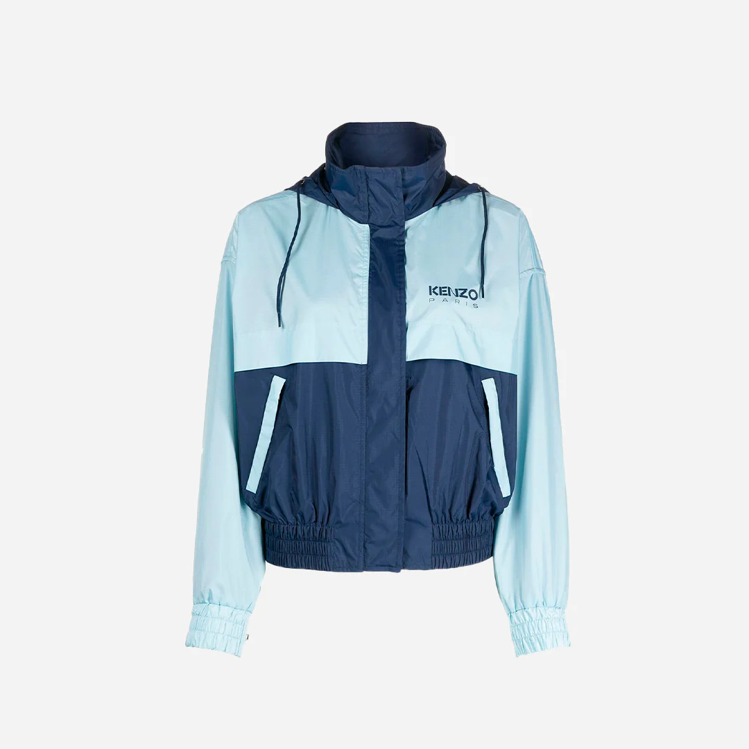 chaqueta de mujer de la marca Kenzo. Es una chaqueta deportiva de estilo cortavientos, con un diseño de bloques de color. La parte superior es de color azul claro y la parte inferior es de color azul oscuro. En la zona del pecho, en la parte azul claro, se puede ver el logo de la marca «KENZO PARIS» en letras pequeñas. La chaqueta tiene una capucha, cuello alto y cierre de cremallera. La cintura y los puños son elásticos, lo que le da un ajuste ceñido. Tiene bolsillos laterales con cremallera.