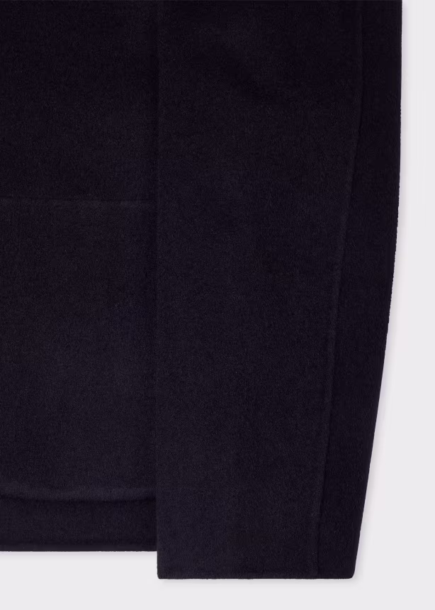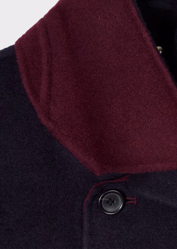 Confeccionado en una mezcla de lana de doble cara para un acabado más estructurado, este abrigo azul marino presenta un diseño corto con interior burdeos en contraste. Ideal para entretiempo, este abrigo cálido cuenta con dos bolsillos de parche para mayor practicidad