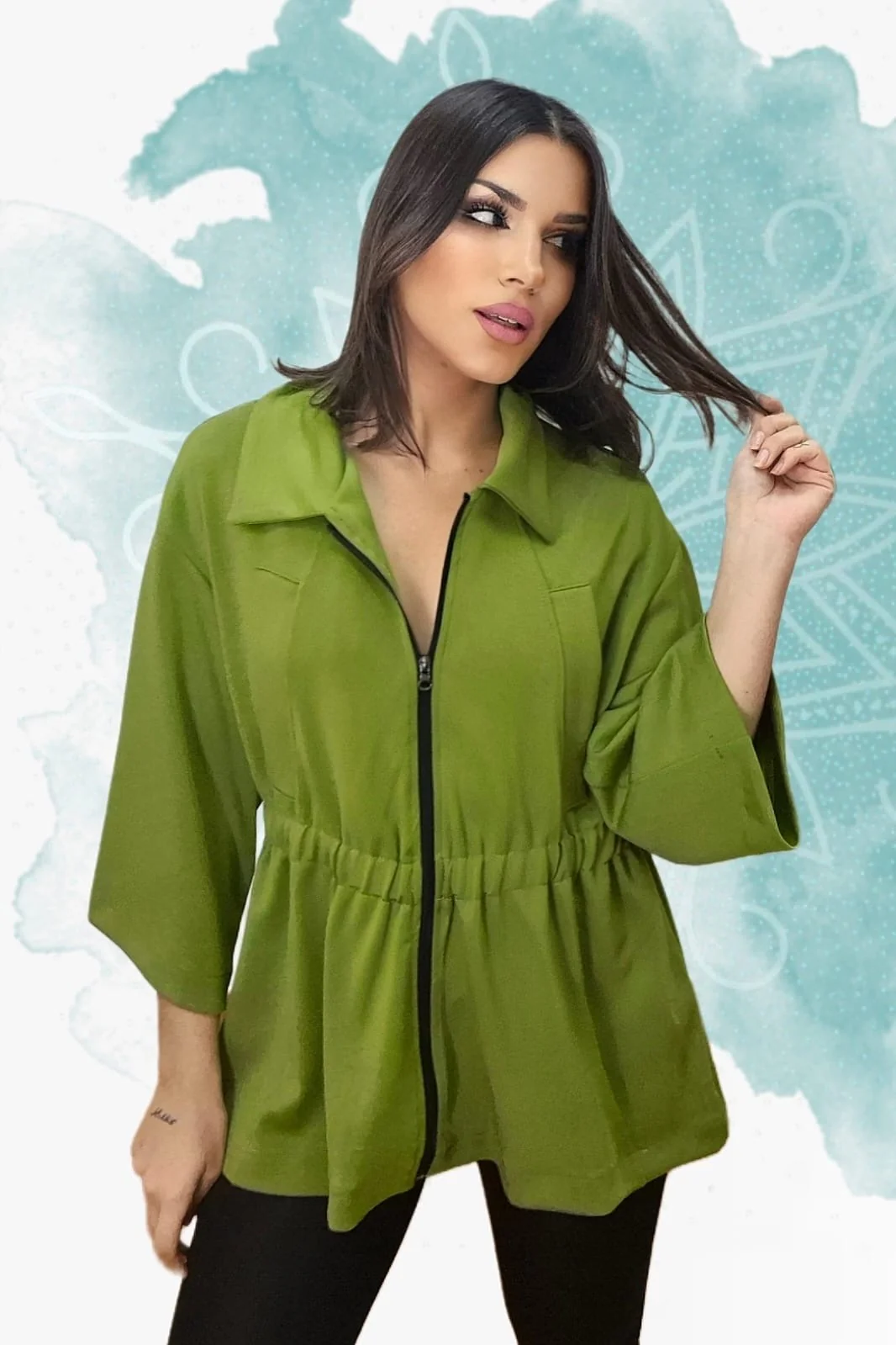 Renueva tu fondo de armario con esta chaqueta oversize de estilo moderno y versátil. Diseñada con manga tres cuartos y solapas elegantes, ofrece un look desenfadado sin renunciar a la sofisticación. Su corte amplio incorpora una goma decorativa a la altura de la cintura, que aporta estructura sin ajustar la silueta.