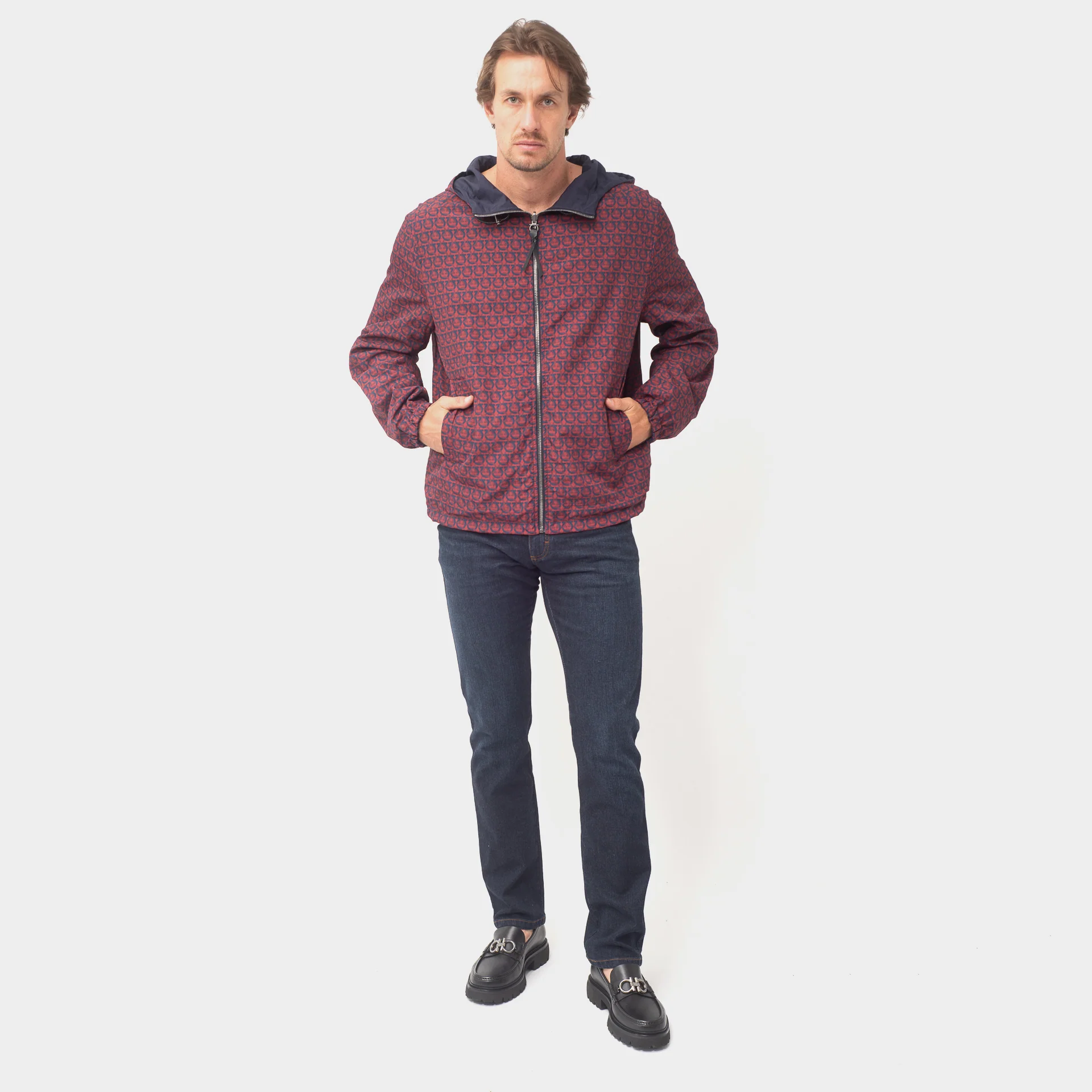 Chaqueta cortavientos de nylon reciclado con motivo Ferragamo Monogram all-over tono sobre tono y acabado recubierto. Especialmente ligera y de aire metropolitano, presenta bolsillos de ribete con cremallera en los laterales y cierre de cremallera bidireccional. La gran capucha y los puños pueden ajustarse gracias a cordones y topes metálicos personalizados.