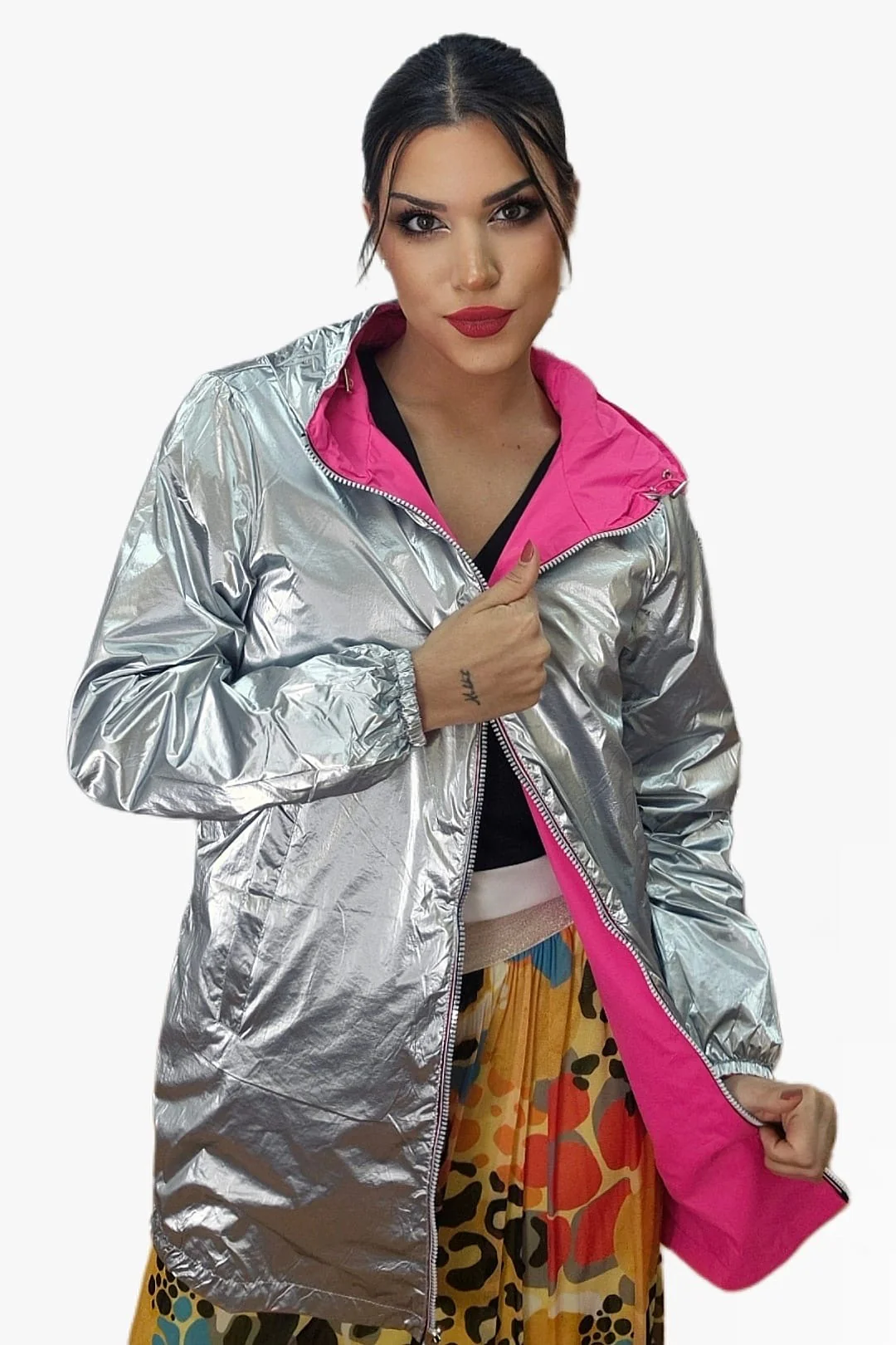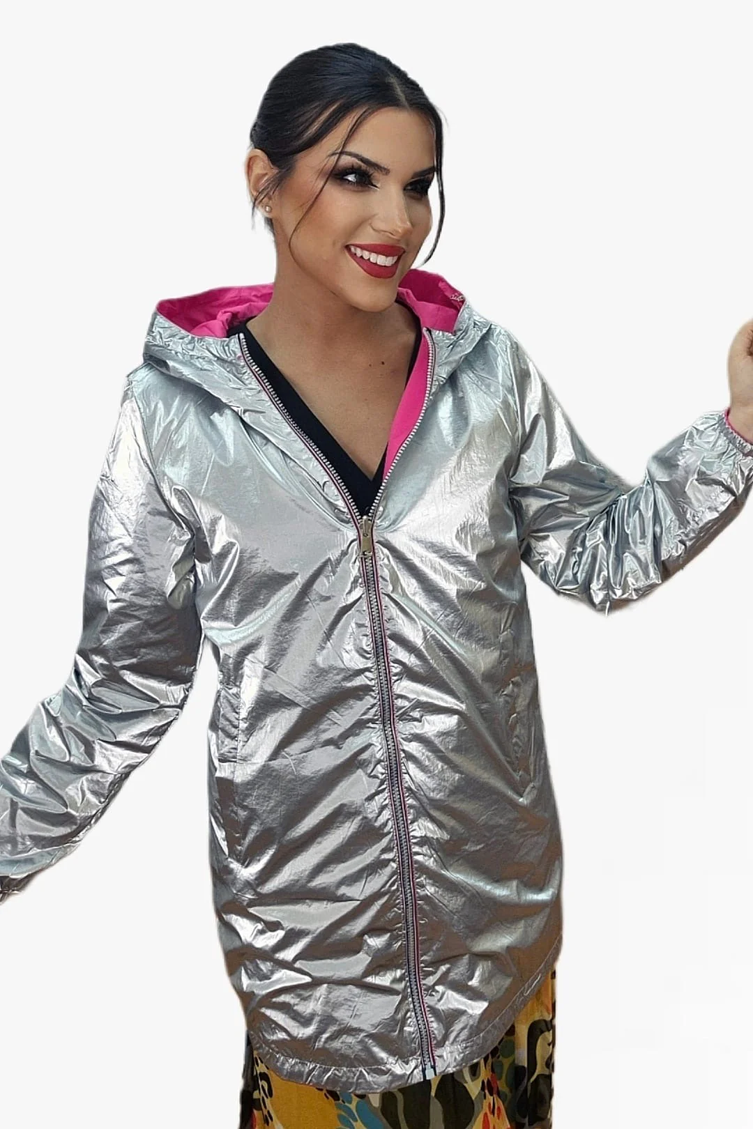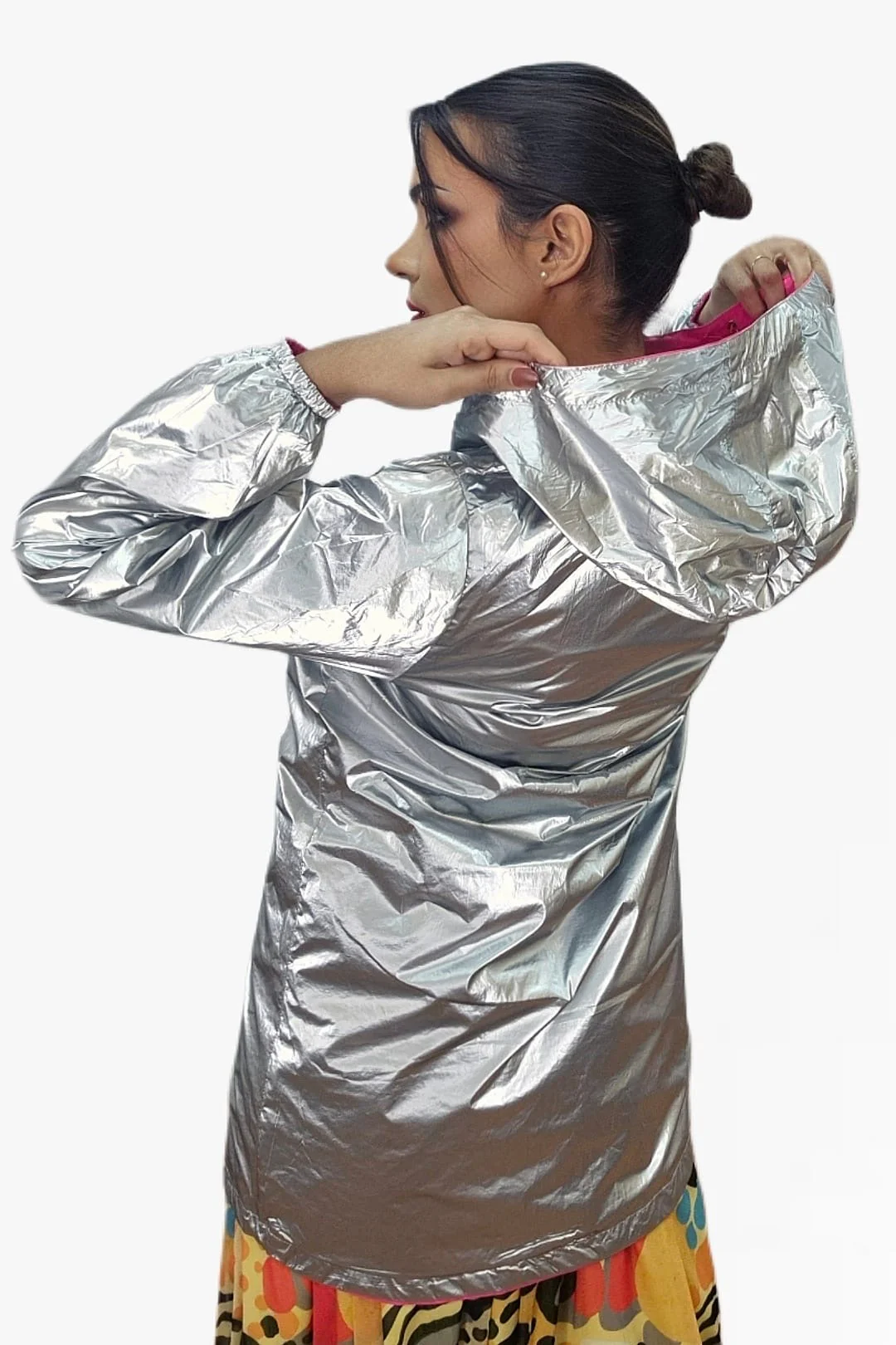 Dale un giro a tus looks de entretiempo con este chubasquero bicolor reversible. Un diseño versátil y moderno, con un lado en color liso y el otro en acabado metalizado para que puedas adaptarlo a cualquier ocasión. Cuenta con bolsillos funcionales en ambos lados, cierre frontal con cremallera y capucha para protegerte de la lluvia sin renunciar al estilo.