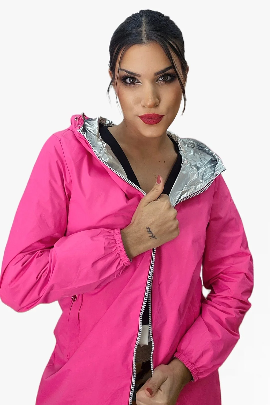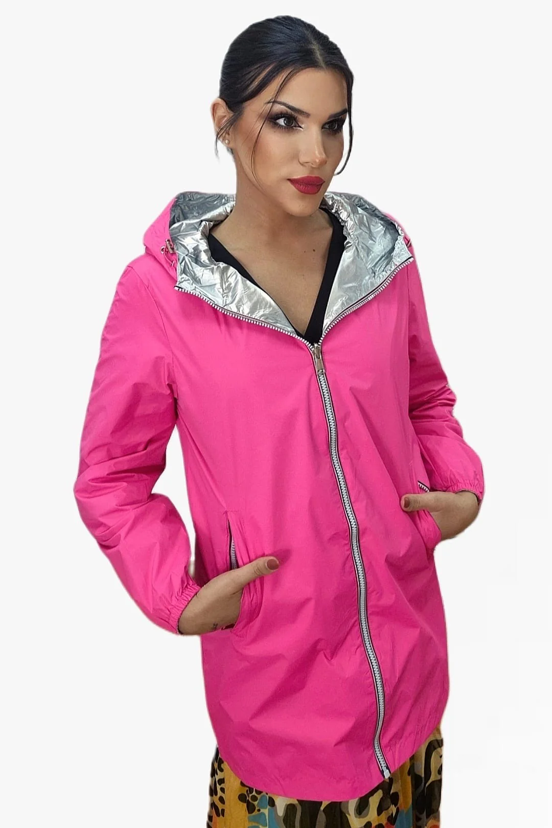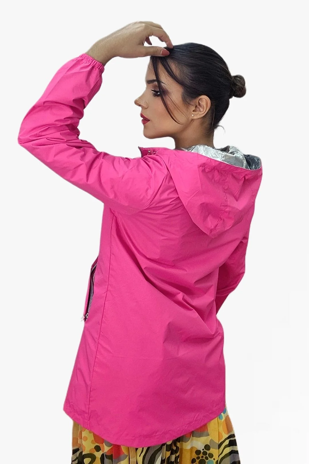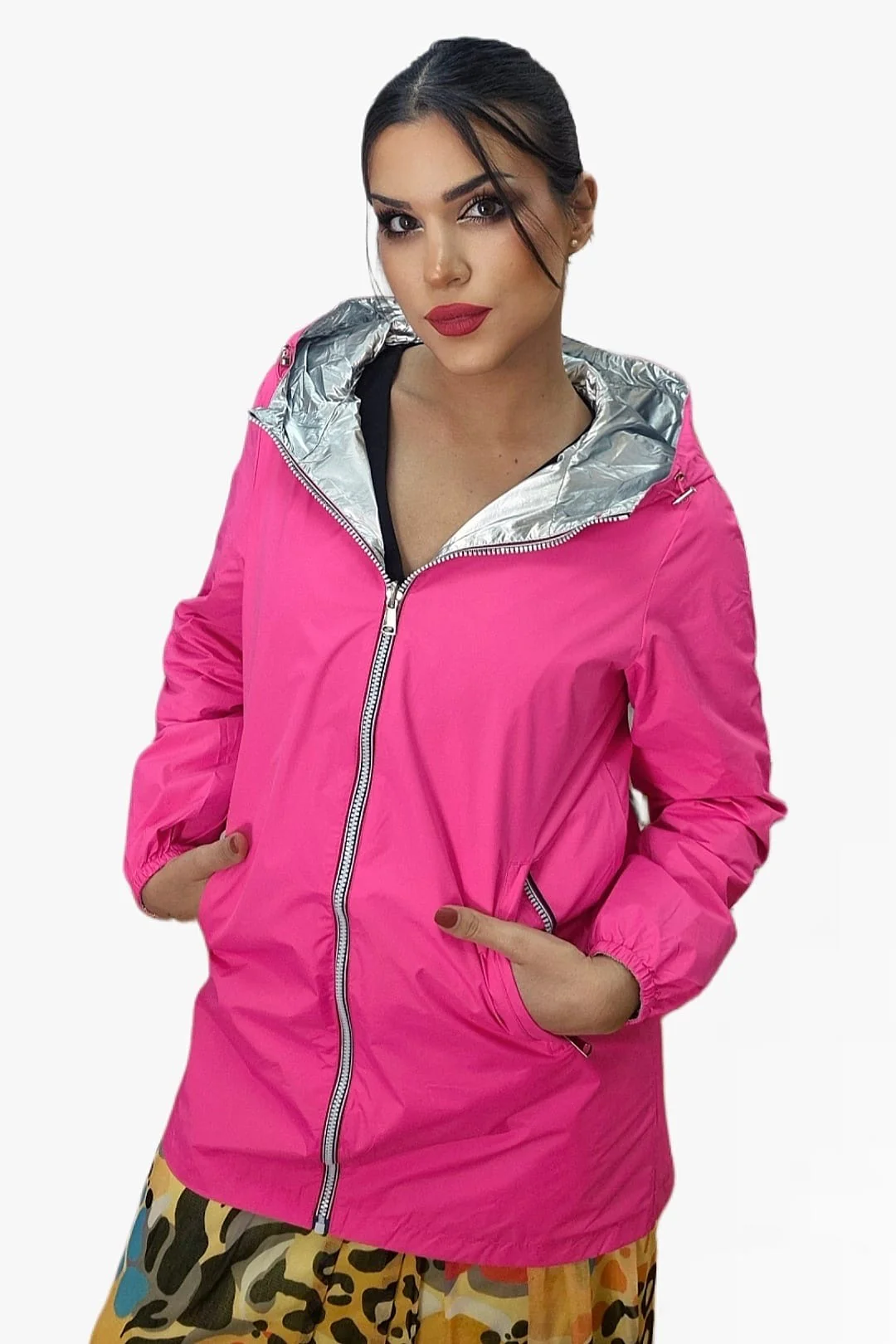 Dale un giro a tus looks de entretiempo con este chubasquero bicolor reversible. Un diseño versátil y moderno, con un lado en color liso y el otro en acabado metalizado para que puedas adaptarlo a cualquier ocasión. Cuenta con bolsillos funcionales en ambos lados, cierre frontal con cremallera y capucha para protegerte de la lluvia sin renunciar al estilo.