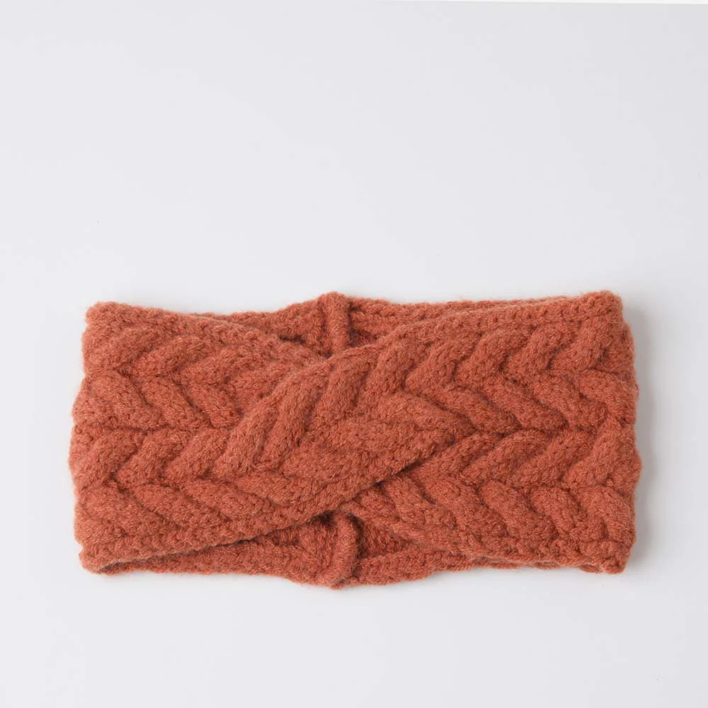 Cintillo tejido con punto de trenza de color coral con detalle cruzado en el frente.