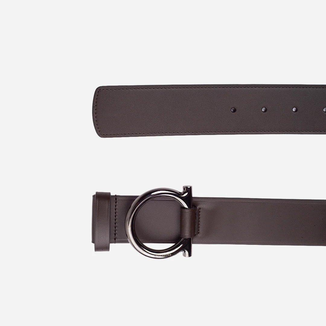 La preparación especial de la piel hace que este cinturón de construcción fija sea único: suave y con un acabado casi engrasado, presenta una correa cosida y una hebilla con perfil Gancini en acabado rutenio, para un look informal pero súper chic.