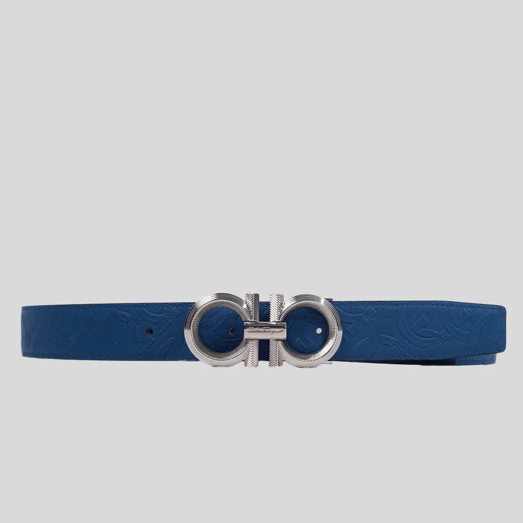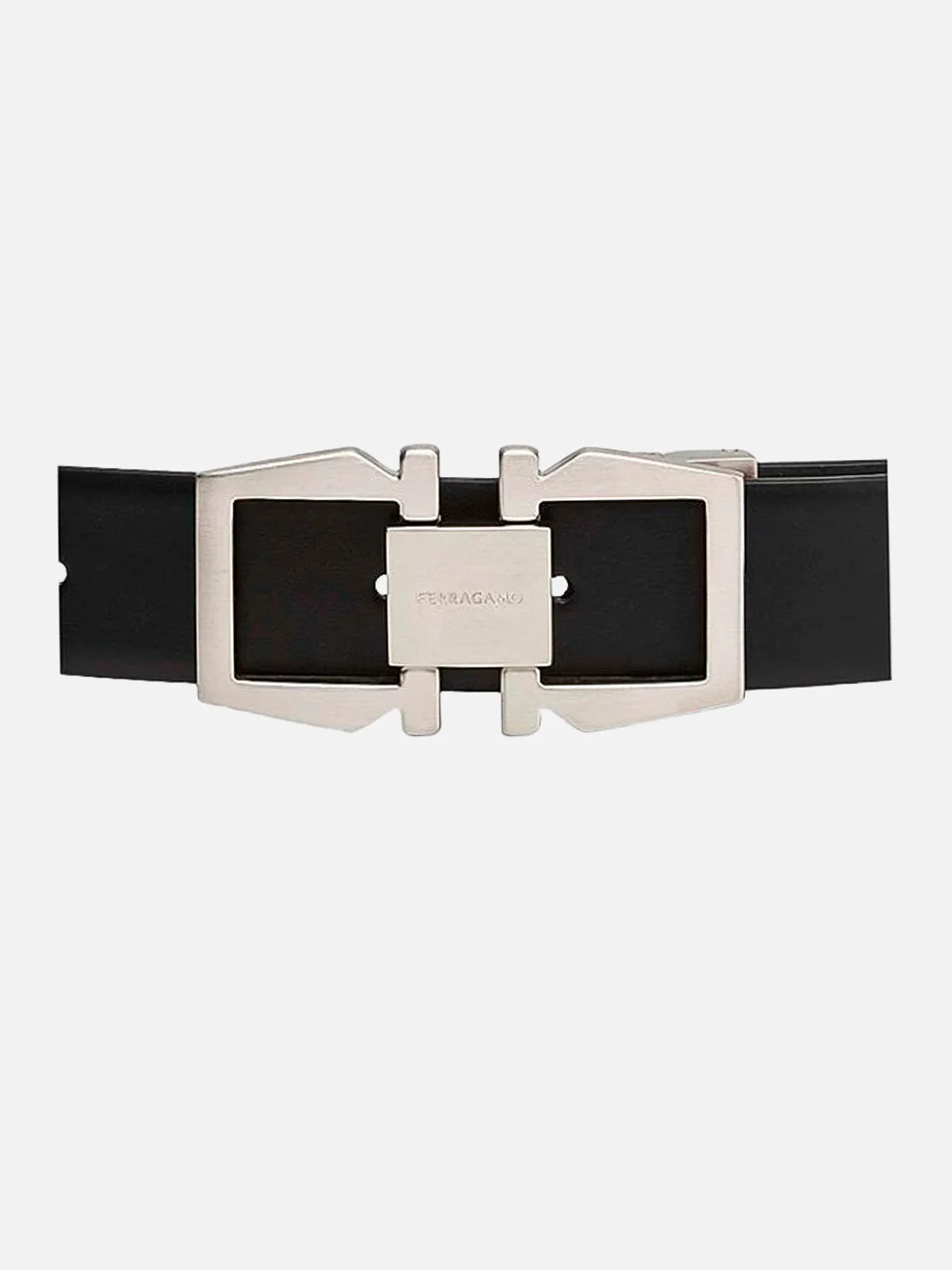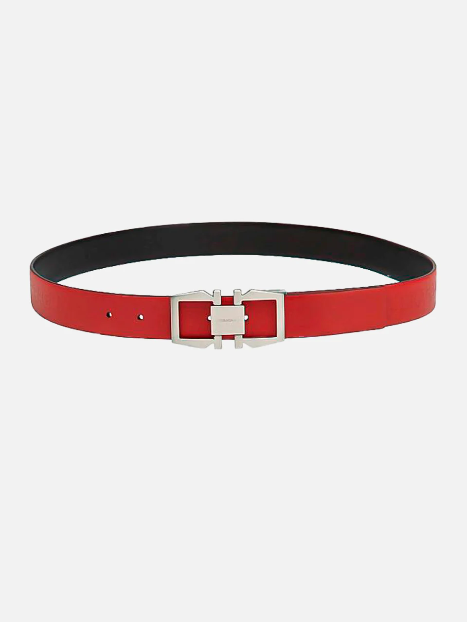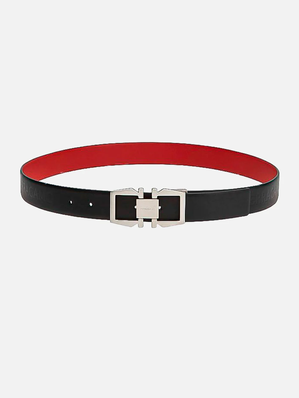 Este cinturón reversible Ferragamo en cuero genuino combina un negro clásico con un rojo vibrante, ofreciendo dos estilos en una sola pieza. Su hebilla metálica con el icónico logo Gancini destaca la calidad y el diseño italiano. Ideal para elevar tanto looks ejecutivos como casuales, es un accesorio sofisticado que aporta versatilidad y distinción a cualquier atuendo.(771041-670327)