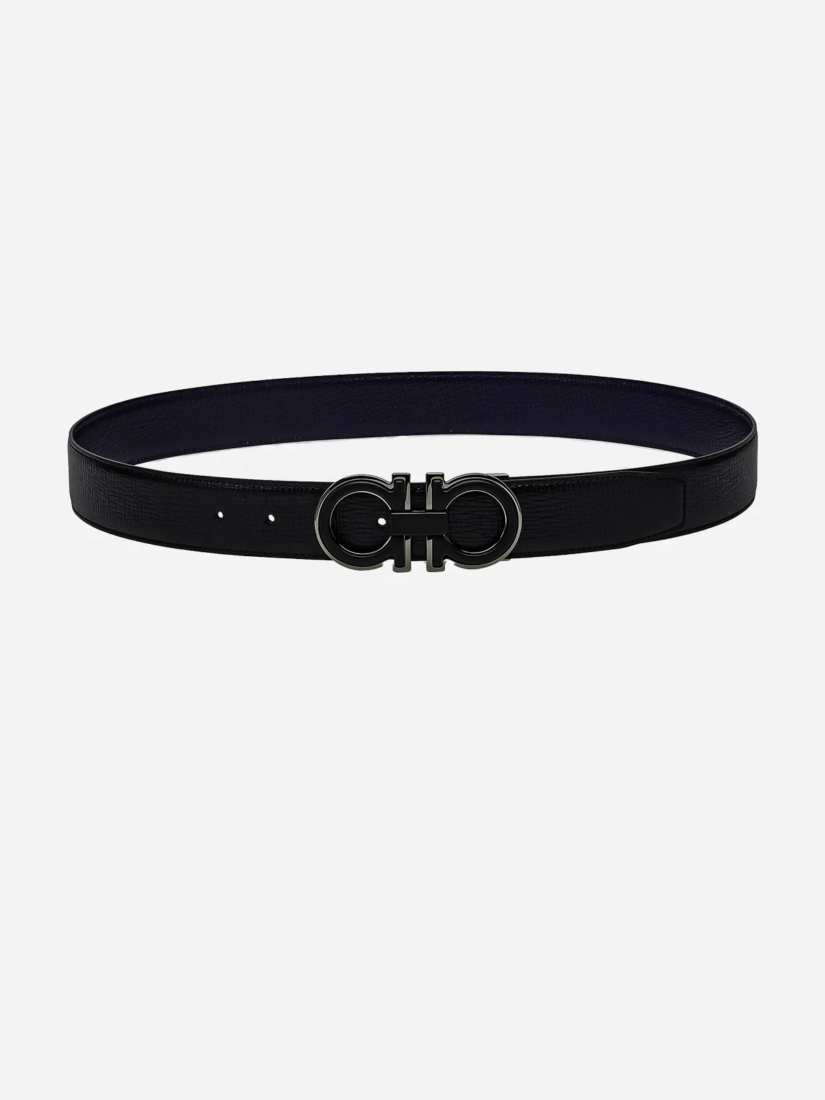 Este cinturón reversible Ferragamo, elaborado en cuero italiano de alta calidad, ofrece una combinación perfecta entre funcionalidad y estilo. Su diseño presenta dos tonos elegantes: negro sobrio y azul profundo, ideales para cualquier ocasión. La hebilla metálica con el emblemático logotipo Gancini aporta un detalle sofisticado que realza su carácter atemporal con un toque moderno, pensado para el hombre que busca distinción y versatilidad en un solo accesorio.