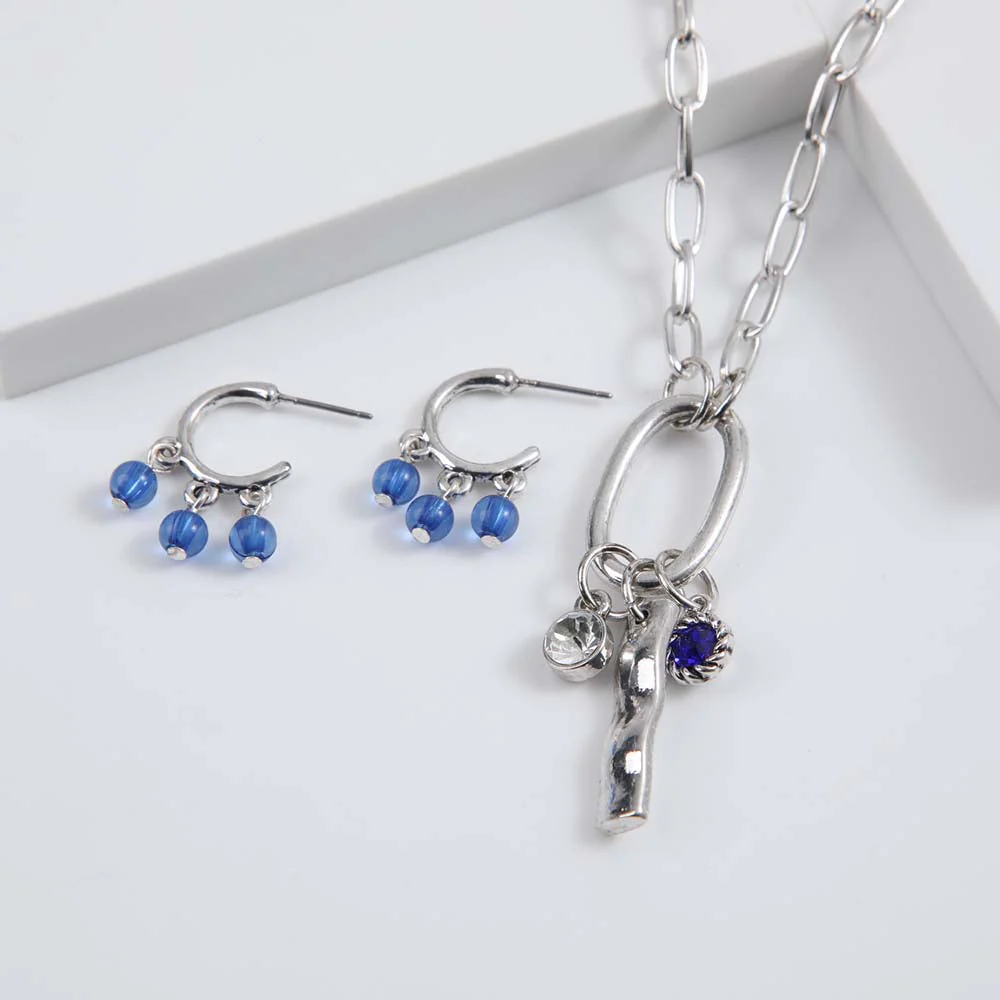 Collar + Aro i-D Heirloom de color azul. Este set cuenta con un par de argollas plateadas con mostacillas semitransparentes de color azul y un collar de cadena gruesa con una argolla ovalada al final con diferentes charms.
