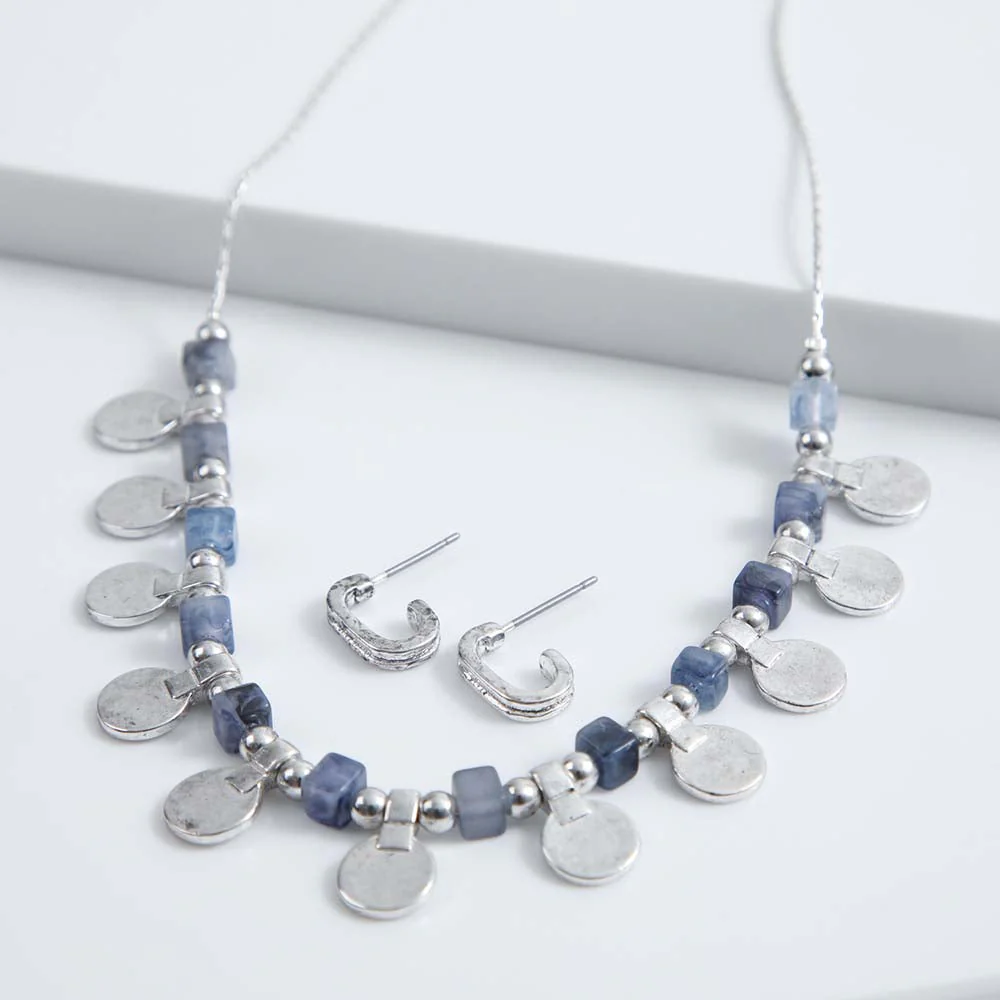Collar + Aro Humana Menorca de color azul perteneciente a la colección Cornflower Blue. Este set cuenta con un par de argollas con brillantes y un collar con mostacillas cudradas de color azul y mostacillas y medallas plateadas.