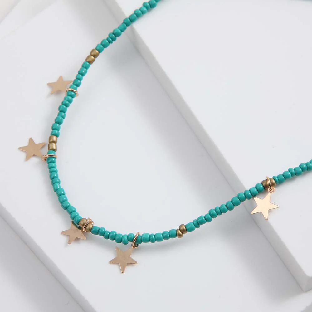 Collar Corto i-D Bari de color verde. Collar de mostacillas verdes y doradas con charms de estrellas doradas.