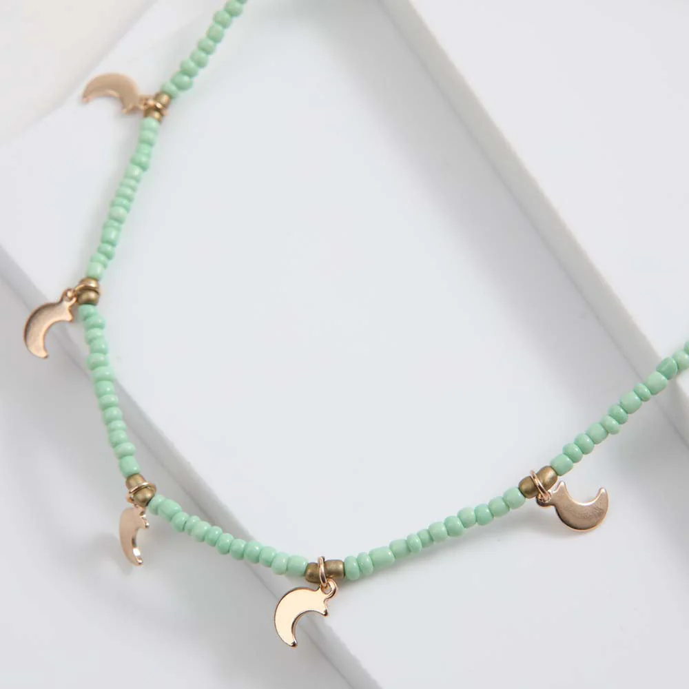 Collar Corto i-D Ostuni de color verde. Collar de mostacillas verde claro y doradas con charms de lunas doradas.
