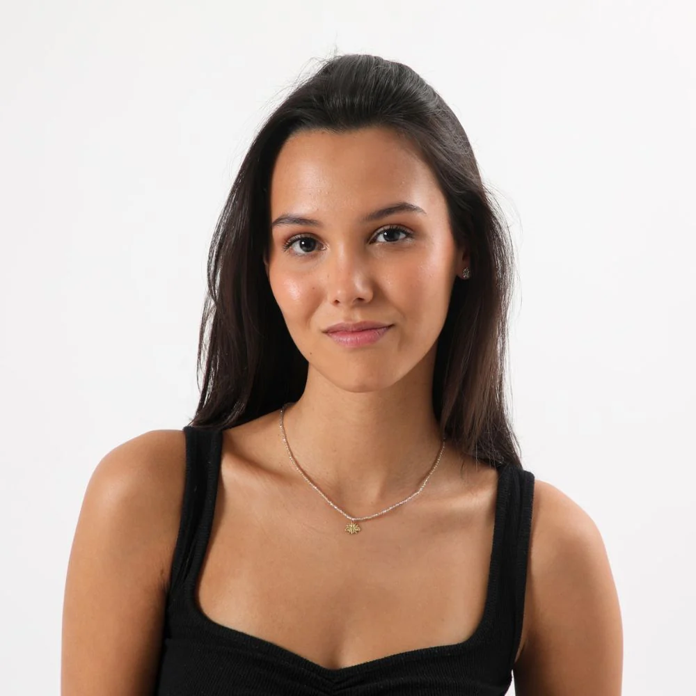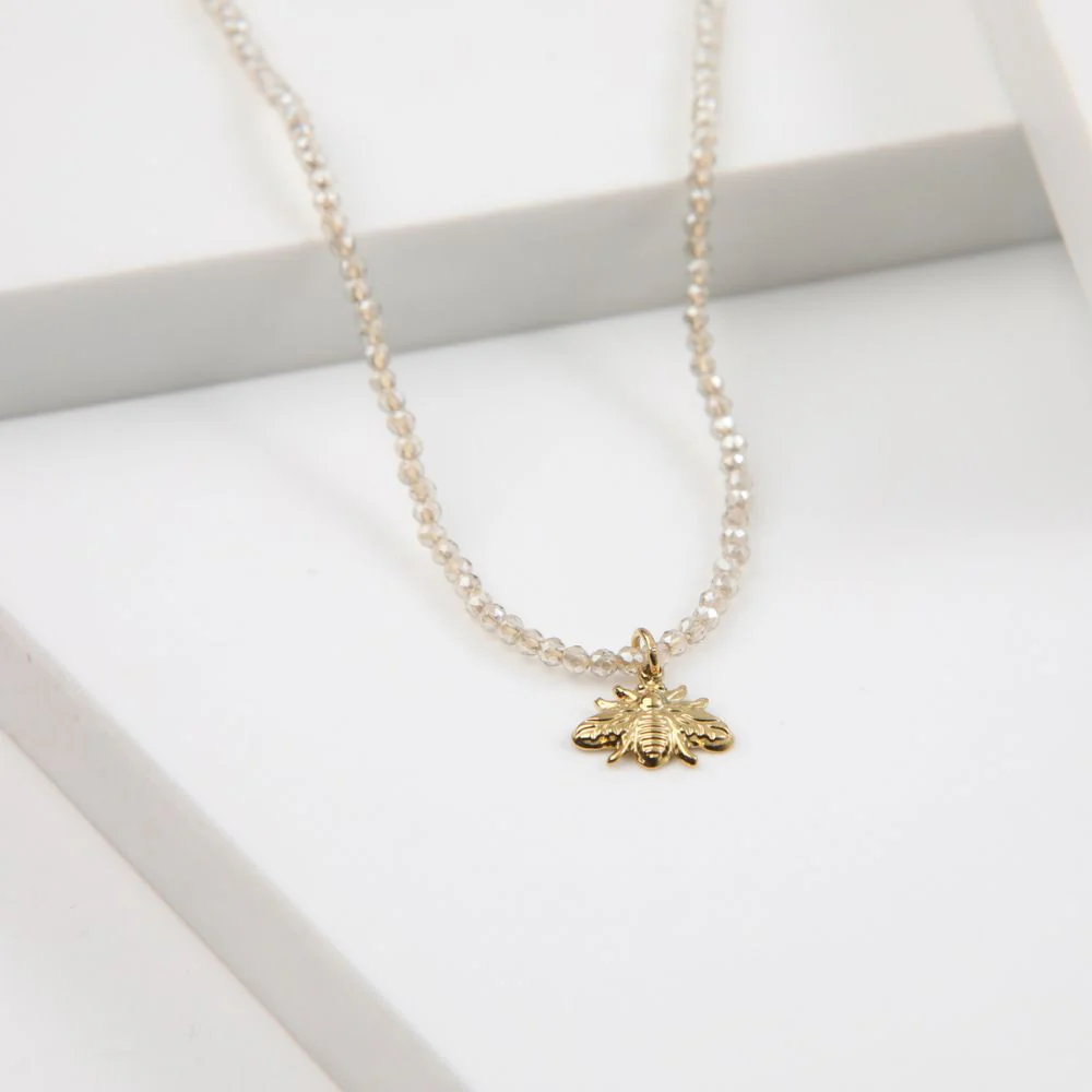 Collar largo ajustable de mostacillas pequeñas blancas con dije de abeja dorado.