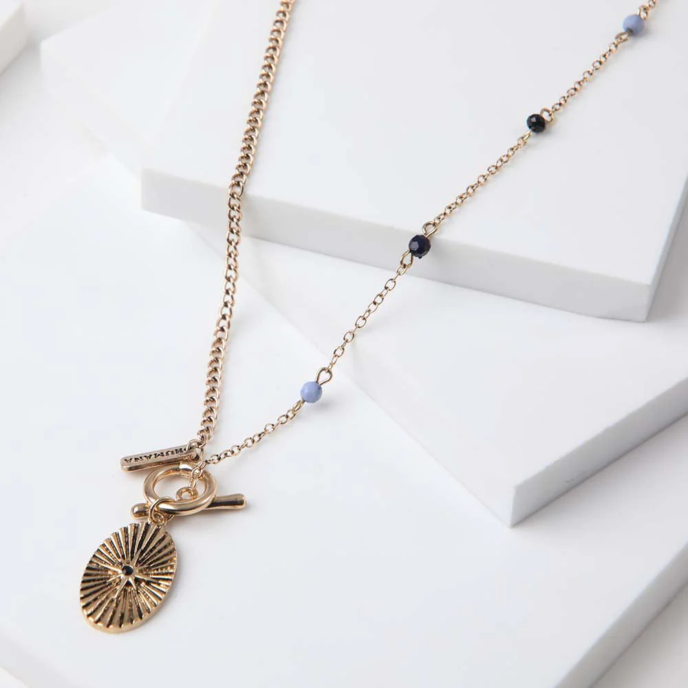 Collar Largo Humana Barceloneta de color azul perteneciente a la colección Planetary Alignment. Collar de cadena dorada con mostacillas azules y celestes con charm redondo con textura de líneas.