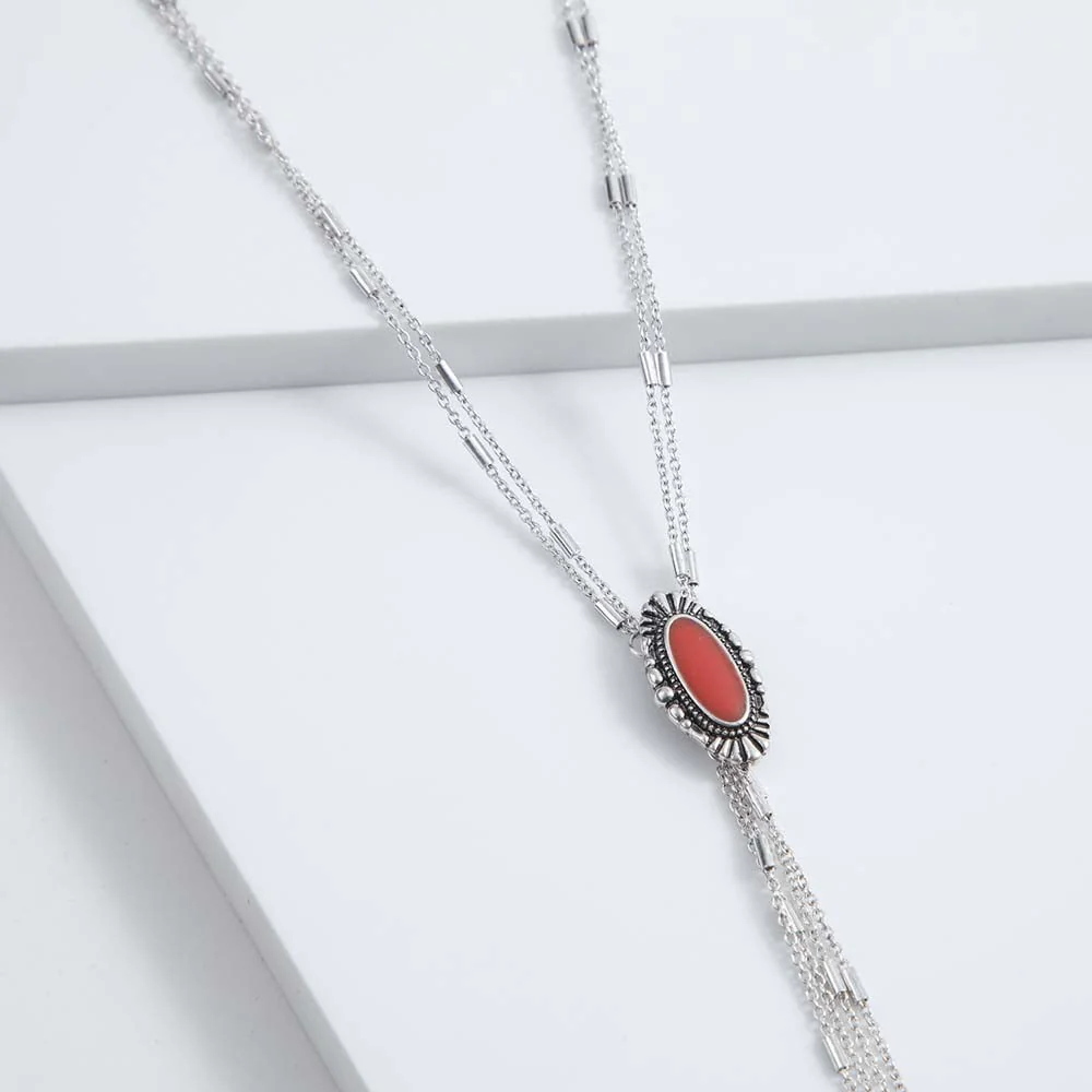 Collar Largo Humana Marbella de colo rojo prteneciente a la colección Floral Nature. Este collar tiene una piedra roja al centro del que salen cuatro cadenas que cuelgan.