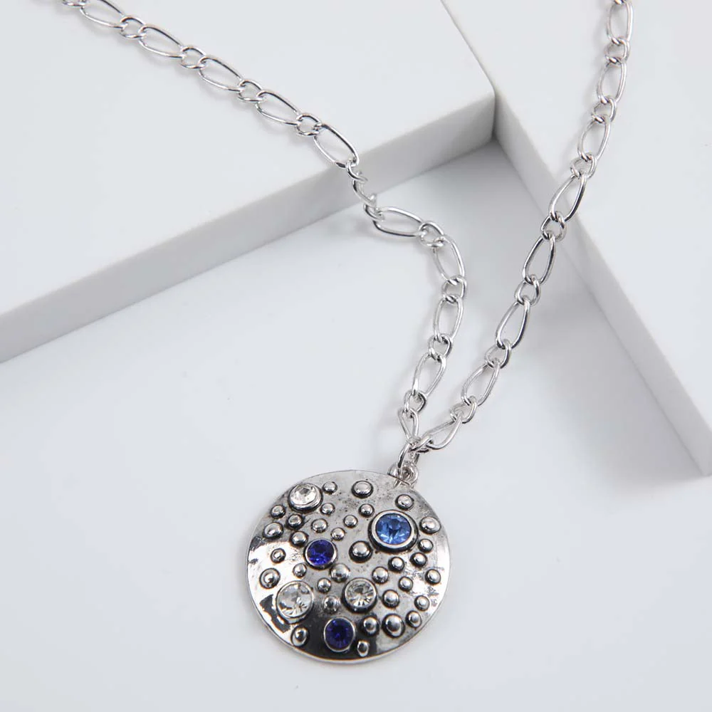 Collar Largo i-D Past de color azul. Collar de cadena gruesa con charm redondo con relieve de esferas y cristales de fantasía azules y transparentes.