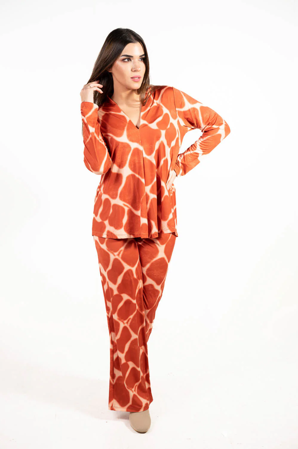 Conjunto de punto, compuesto de camiseta y pantalón del mismo tejido y estampado. La camiseta tiene escote a pico, manga larga elástica y hace un poco de vuelo. El pantalón de pata ancha, con cintura engomada.