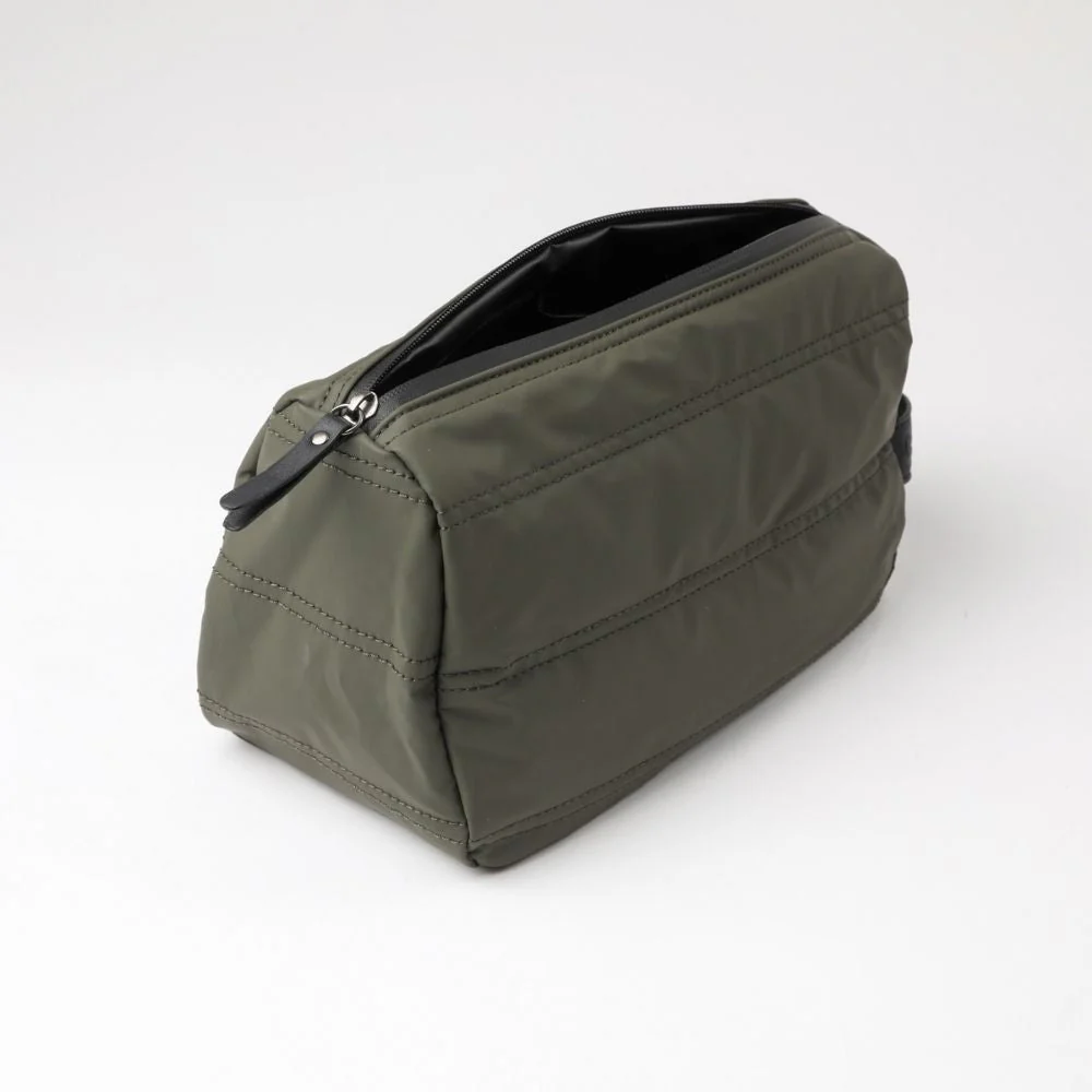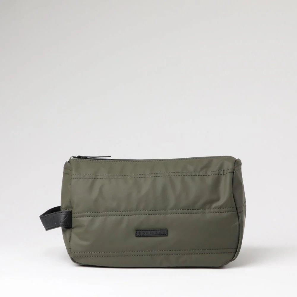 Cosmetiquero grande verde tipo parka, con 2 bolsillos internos abiertos y uno con cierre. Cuenta con una manilla para llevarlo e interior repelente al agua.