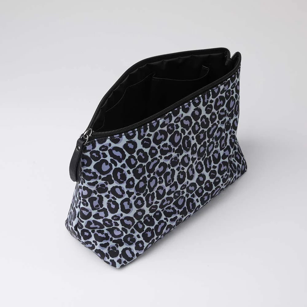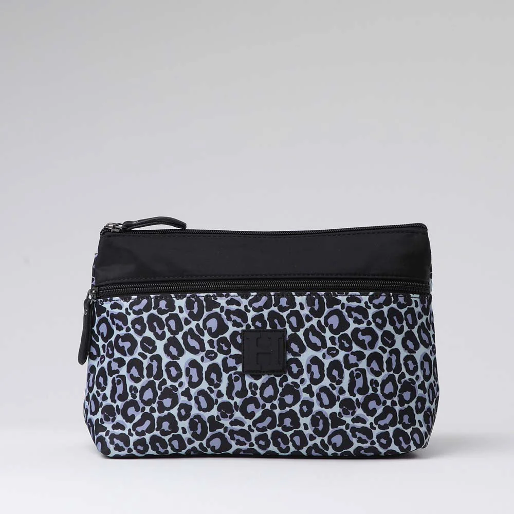 Cosmetiquero Humana Ter de color celeste. Cosmetiquero con dos bolsillos con cierre, tiene un estampado de manchas de piel animal en celeste, lila y negro.