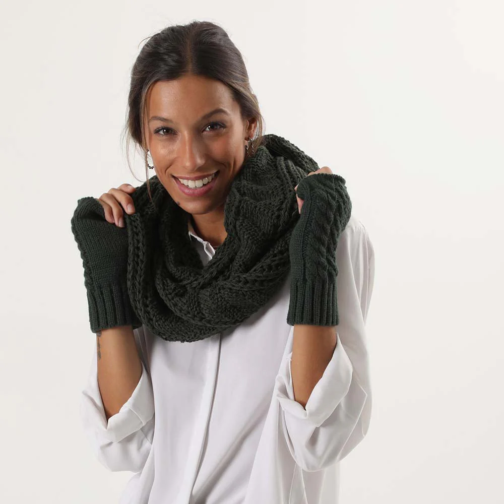 Cuello Humana Montana de color verde. Cuello largo tejido de color verde con detalles trenzados en el mismo color.