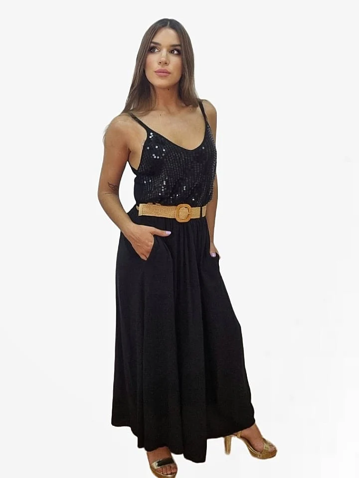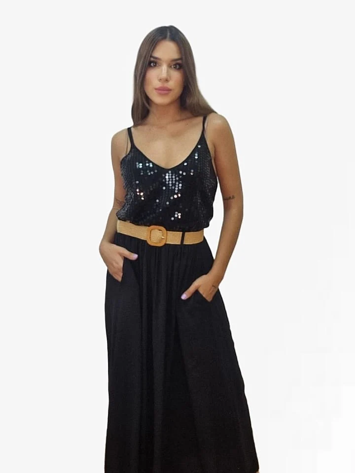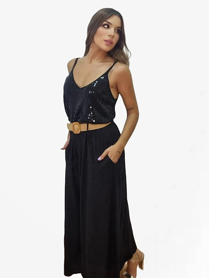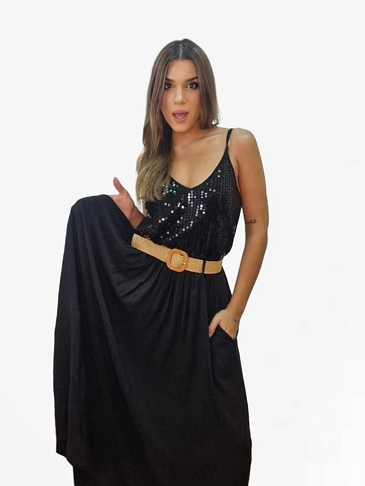 Falda larga fluida con bolsillos laterales, incluye cinturón.